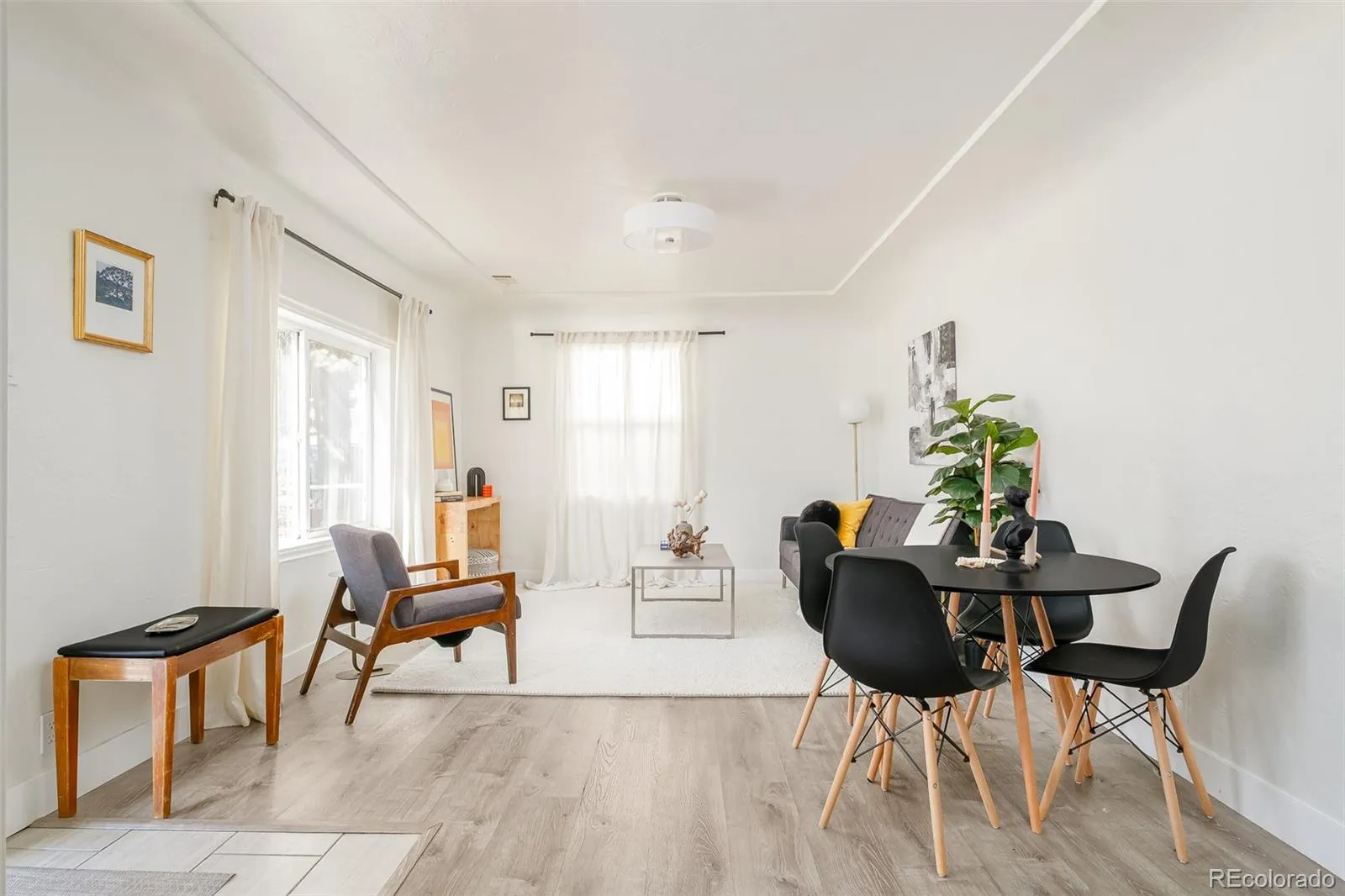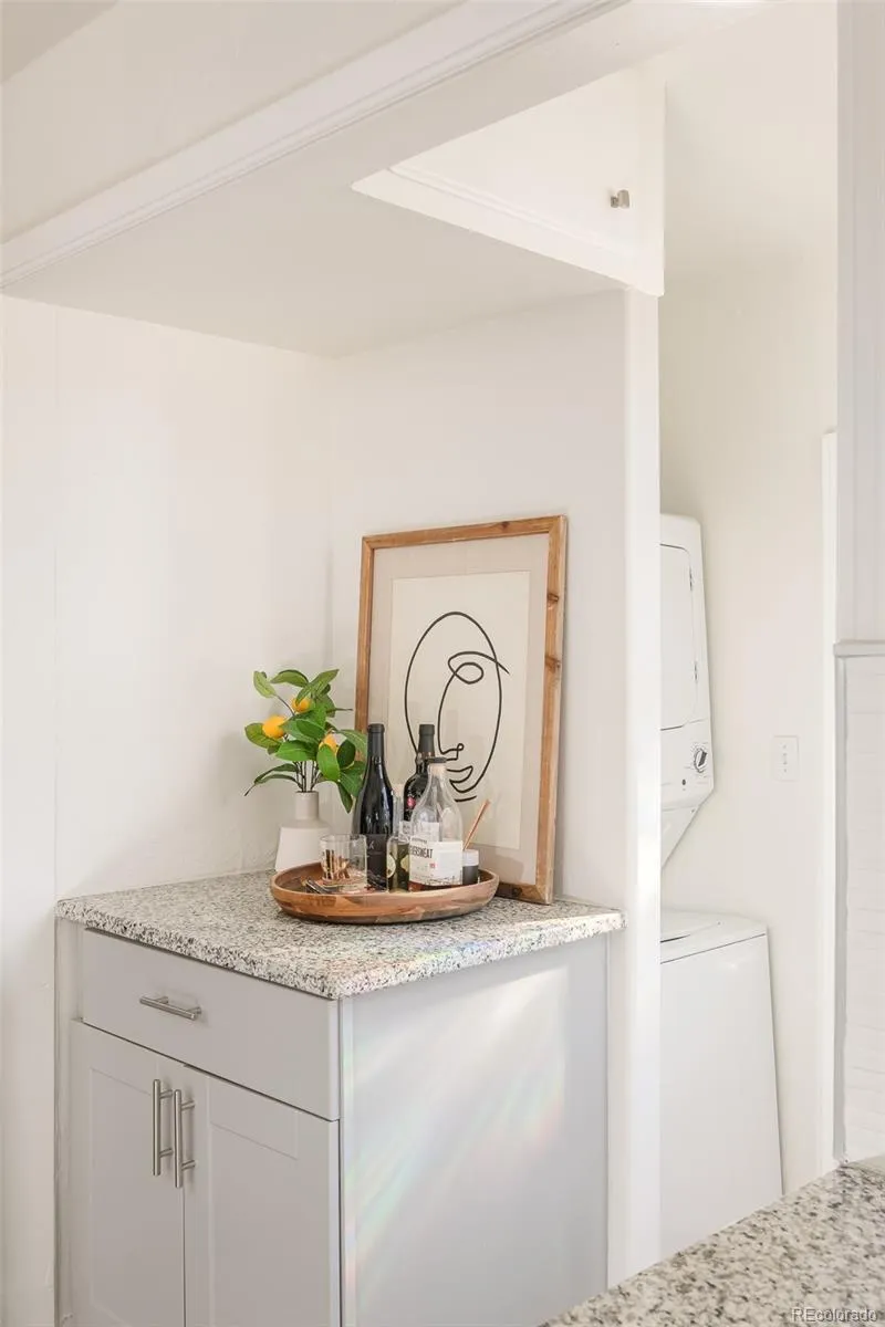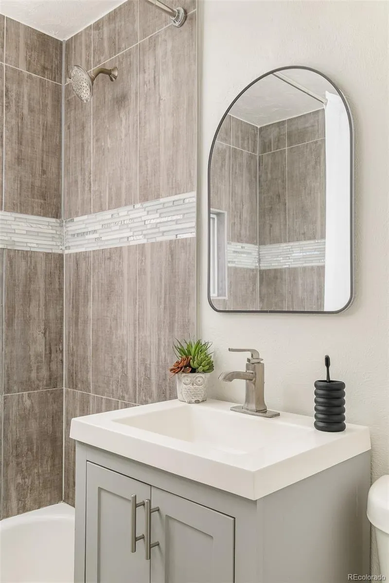 The space flows seamlessly into the updated kitchen, featuring sleek cabinetry, a tiled backsplash, and modern appliances. Two inviting bedrooms share a full bath with stylish tile finishes.