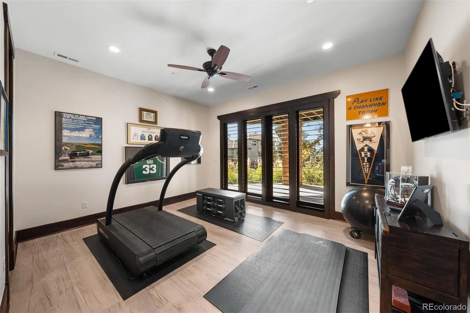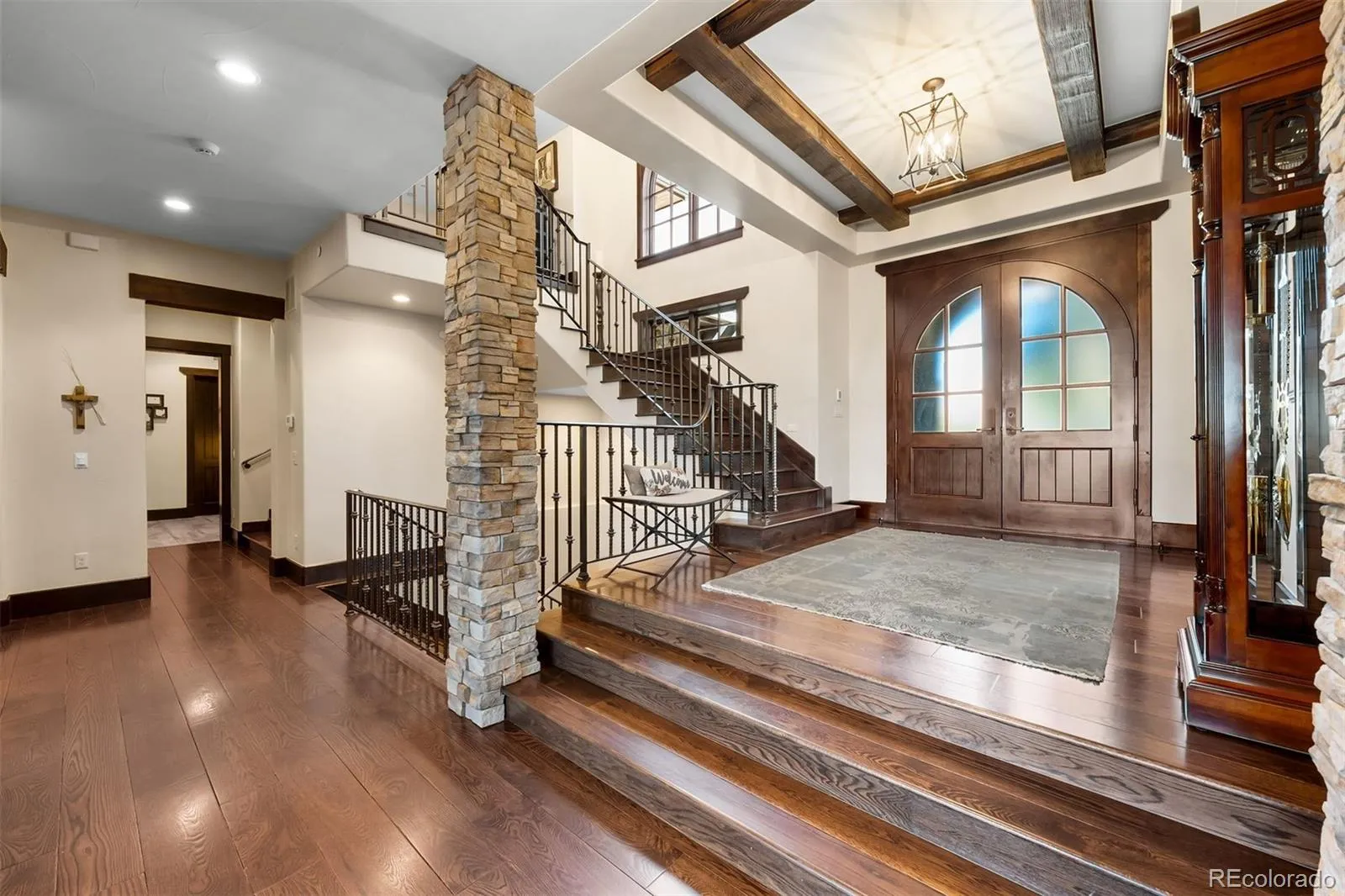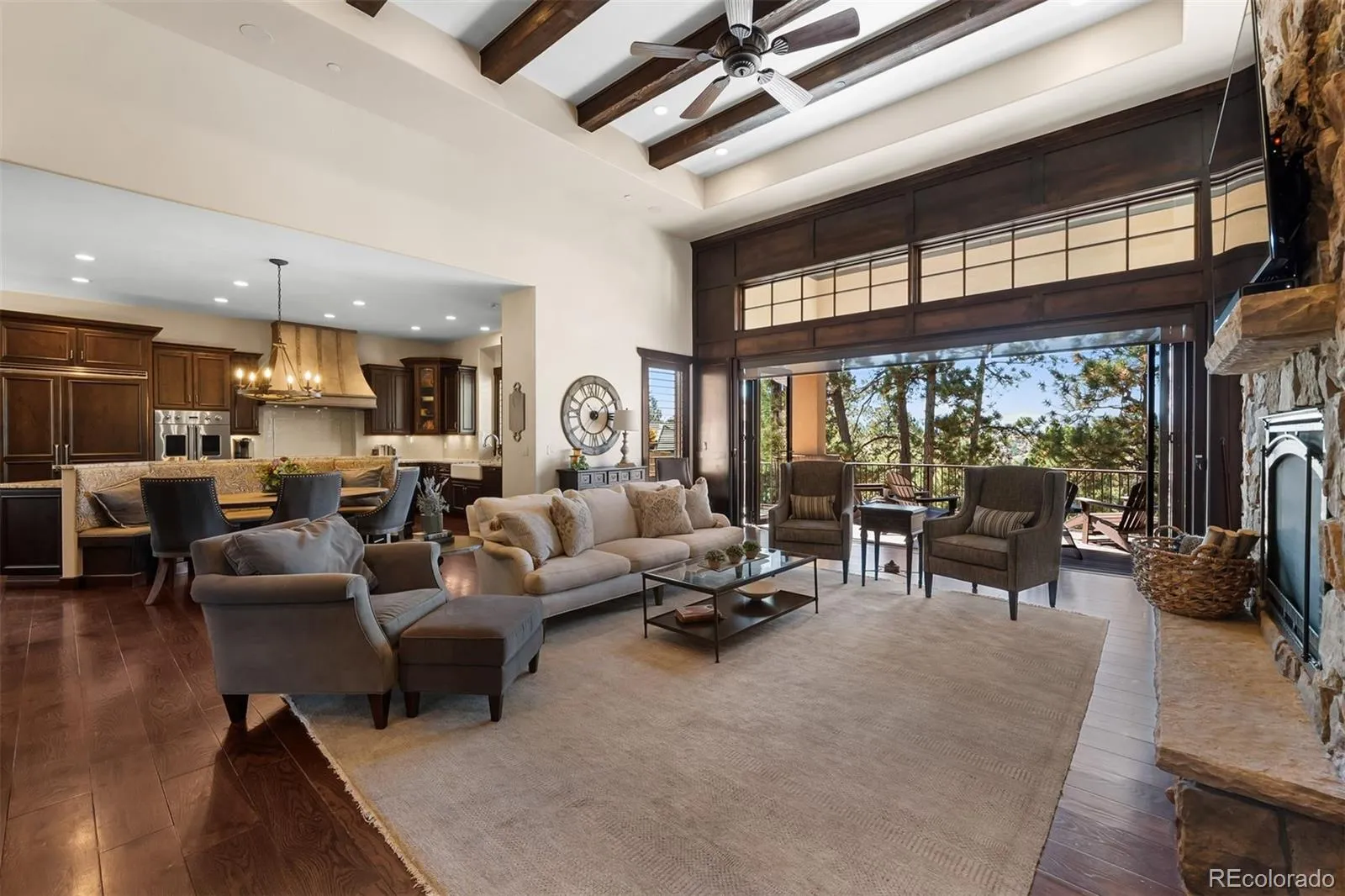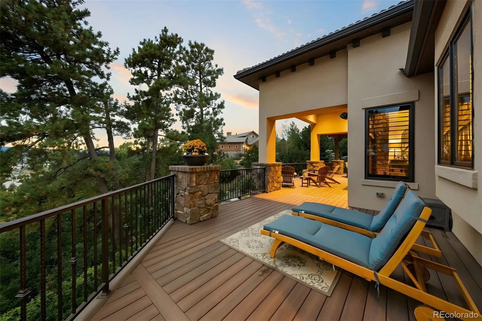 Set on a truly special lot amid towering Ponderosas in The Village at Castle Pines, this Colorado Mountain Modern home is designed to connect everyday living with the beauty of its surroundings. From the moment you step inside, expansive sightlines draw your eye to the sky and trees beyond, creating a sense of calm. Landmark Front Range views—including Devil’s Head and the Rock of Castle Rock—are woven throughout, while high-end finishes and thoughtful details elevate the home’s warmth and sophistication. The great room is the heart of the home, featuring wood-beamed ceilings, a stone fireplace, and a dramatic 16.5-foot Nano Wall that opens to the expansive deck and perfectly framed views. The kitchen and dining areas flow seamlessly into this space, ideal for daily living and entertaining. The kitchen is anchored by a statement island with custom banquette seating, granite countertops, and Viking appliances. The adjacent vaulted dining area is surrounded by windows, creating an inviting, sunlit space. The wraparound deck offers multiple places to relax, dine and grill. A main-floor primary suite allows for easy one-floor living and serves as a private retreat with fireplace, sitting area, deck access, and a spa-like bath. Direct access from the primary closet to the main-level laundry adds everyday convenience. The walk-out lower level opens to a covered patio and backyard oasis with extensive hardscape, water feature, and fire pit. Inside, a spacious rec room with fireplace, full bar, and wine cellar display creates an inviting setting. Two en-suite bedrooms complete this level; one is currently used as a home gym and features a luxurious steam shower. Upstairs, a loft, two additional en-suite bedrooms, and a second laundry provide flexibility and privacy. With abundant storage, including two large unfinished areas for storage or future expansion, and an oversized 3+ car garage, this home offers an exceptional balance of elegance, comfort, and a CO lifestyle