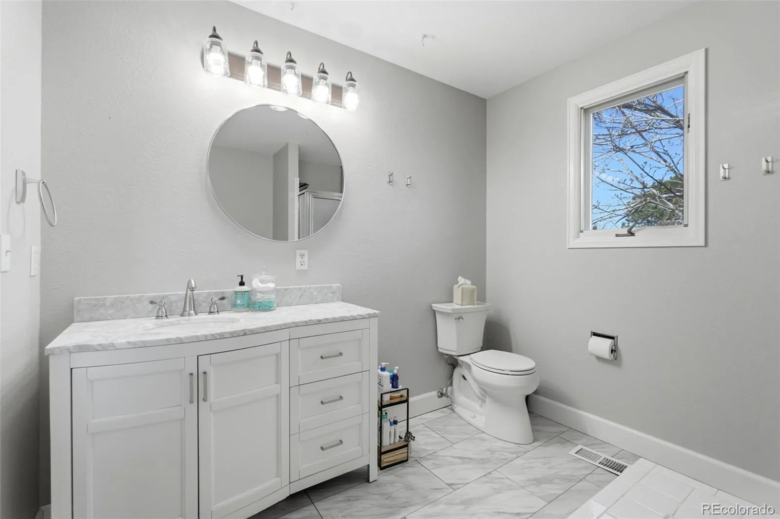 The living room is just off the kitchen and features new carpet and direct access to the large, private outdoor deck. The front room offers flexible space for a formal dining area, family room, or play space. The main level is complete with a laundry area featuring modern updates and shelving, as well as a powder bath with upgraded vanity, toilet, mirror, lighting, and trim.