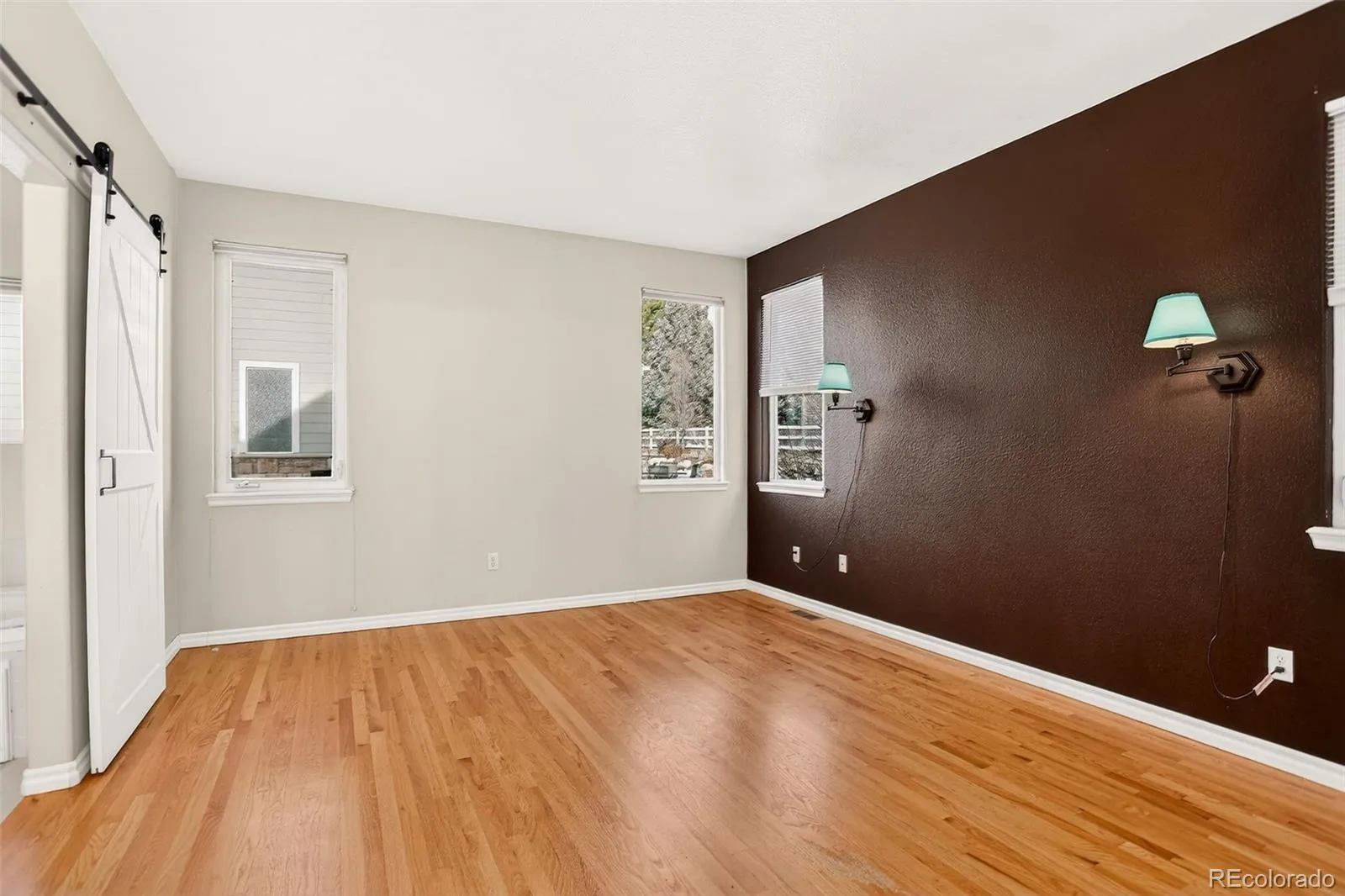 The primary bedroom suite is situated on the main level and includes a private bathroom.