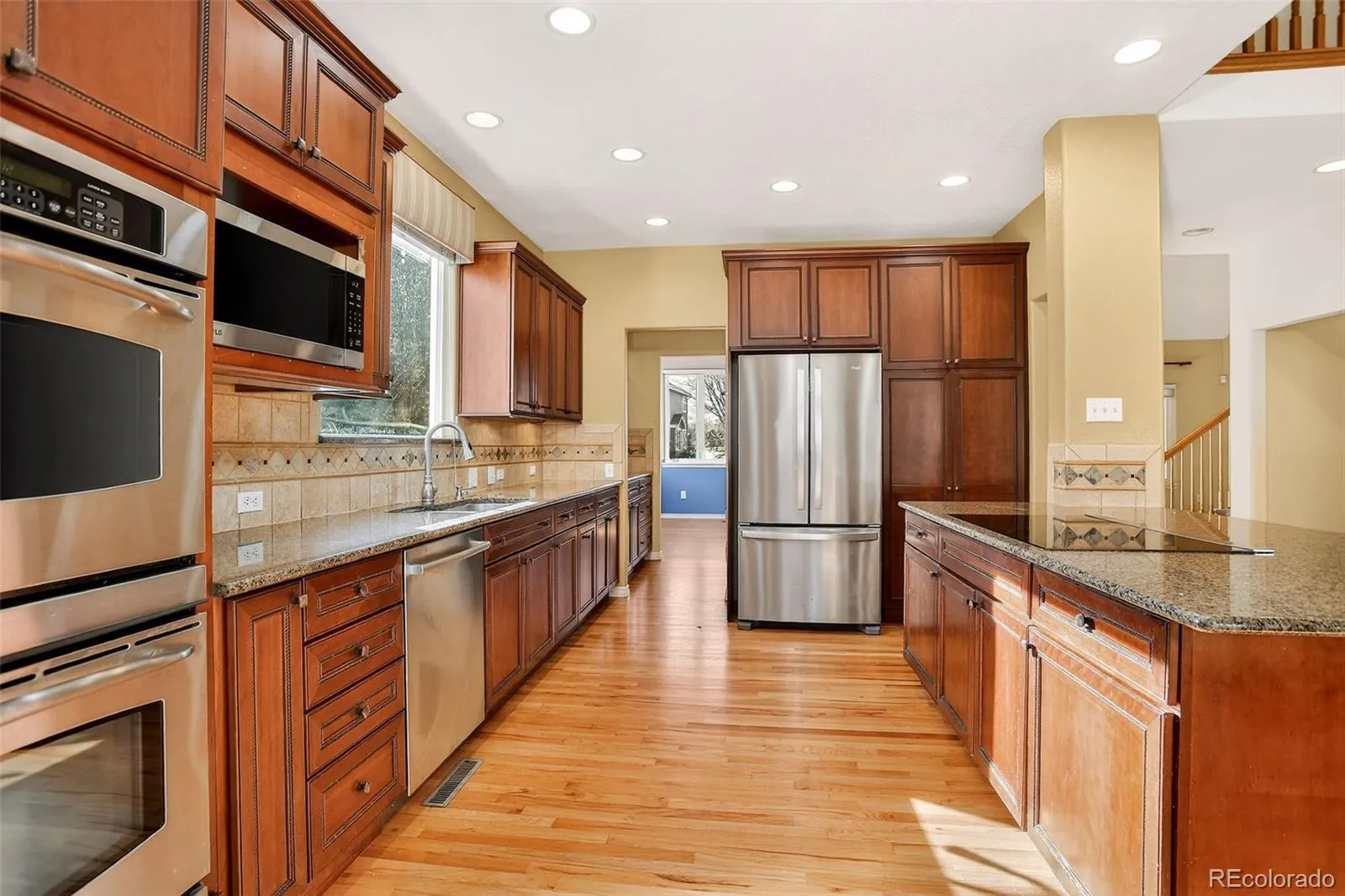 The main level offers a spacious living room, family room, dining area, and kitchen. The kitchen is equipped with modern appliances and ample Granite counter space, ideal for meal preparation.