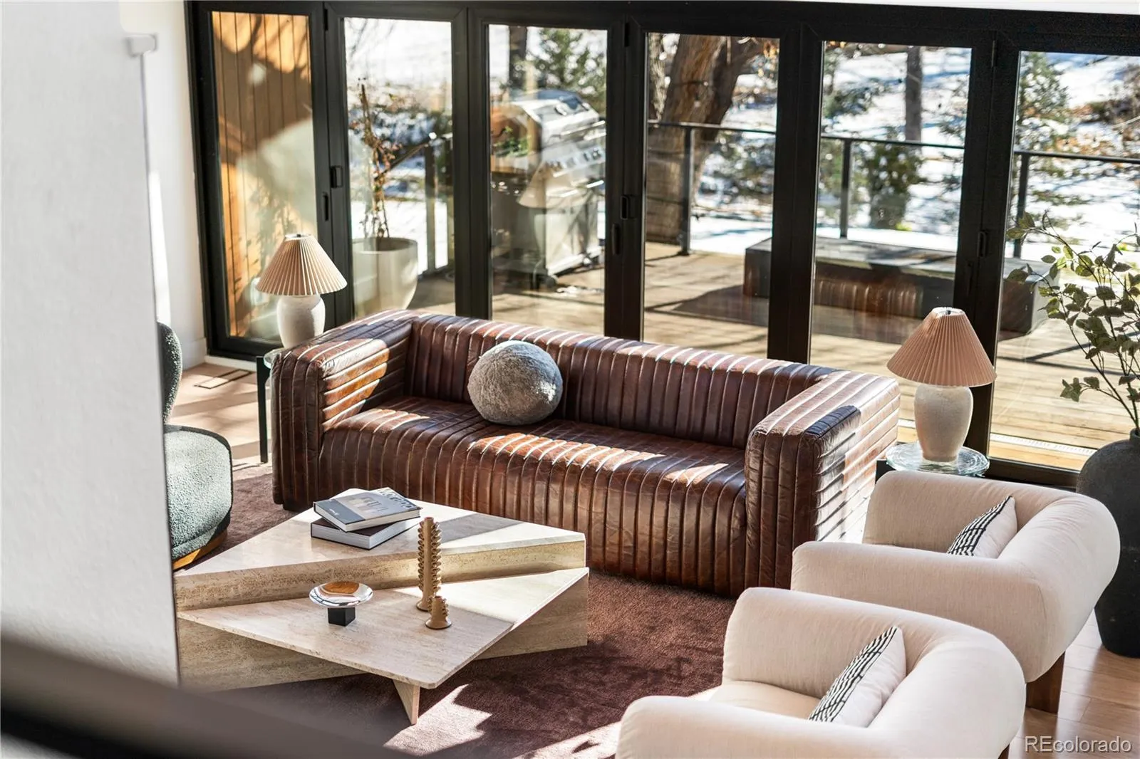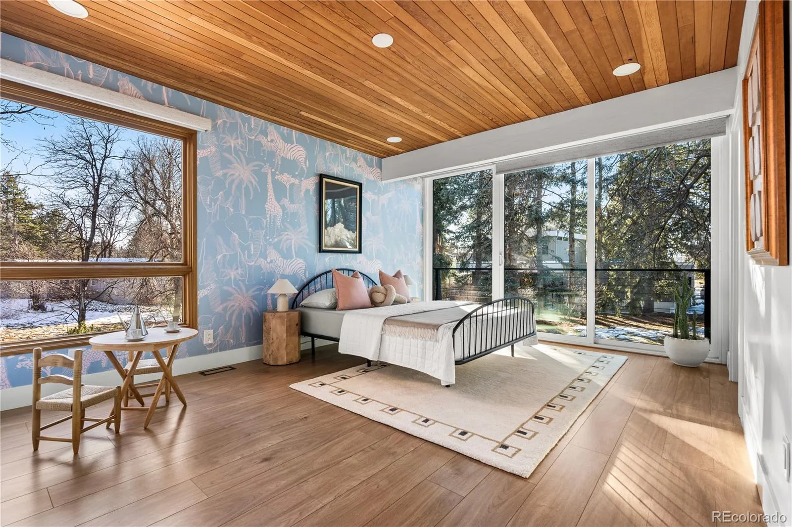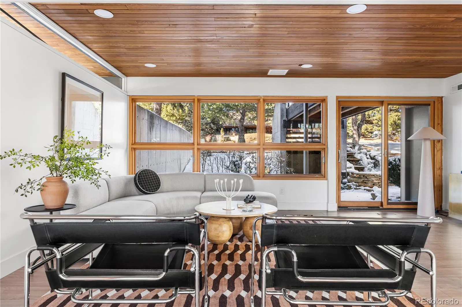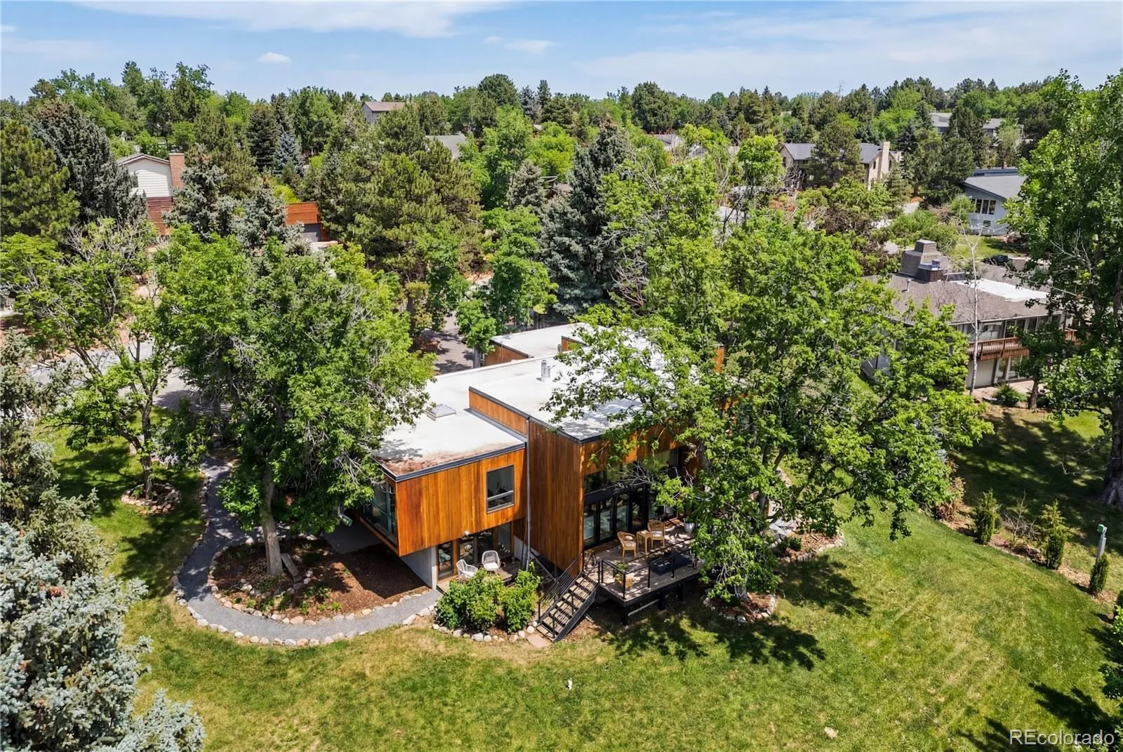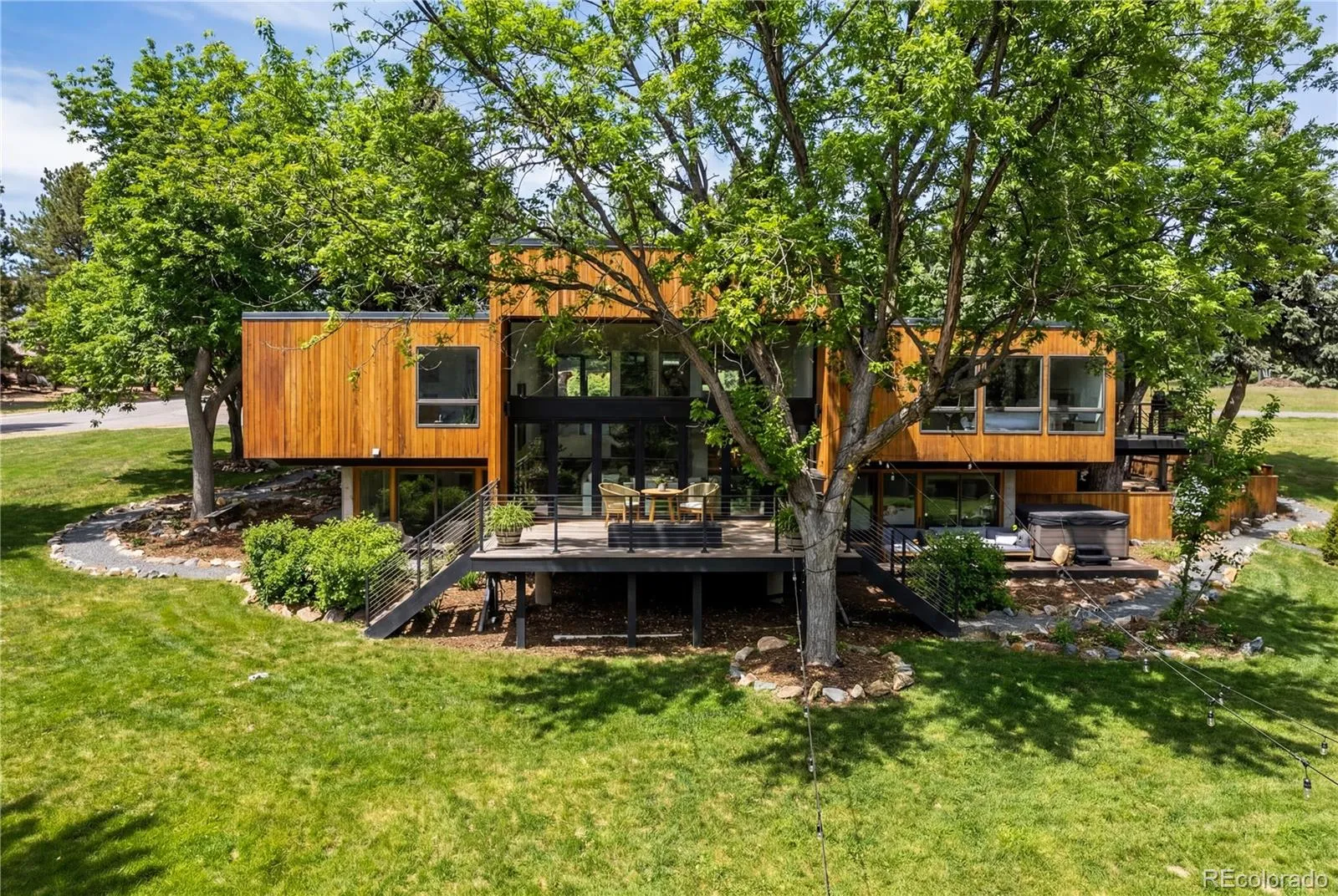 Step into the Orchard Hills Treehouse, a one-of-a-kind modern architectural house in Greenwood Village designed for people who want their home to feel as good as it looks. Set on a private half acre with mature trees in Orchard Hills, a thoughtfully planned community by renowned architect Eugene Sternberg. This is a home where light, space, & nature work together in a way that feels quiet, grounded, & intentionally designed for how you actually live. A front waterfall feature welcomes you home & carries the subtle sound of moving water throughout the property, creating a sense of calm from the moment you arrive.