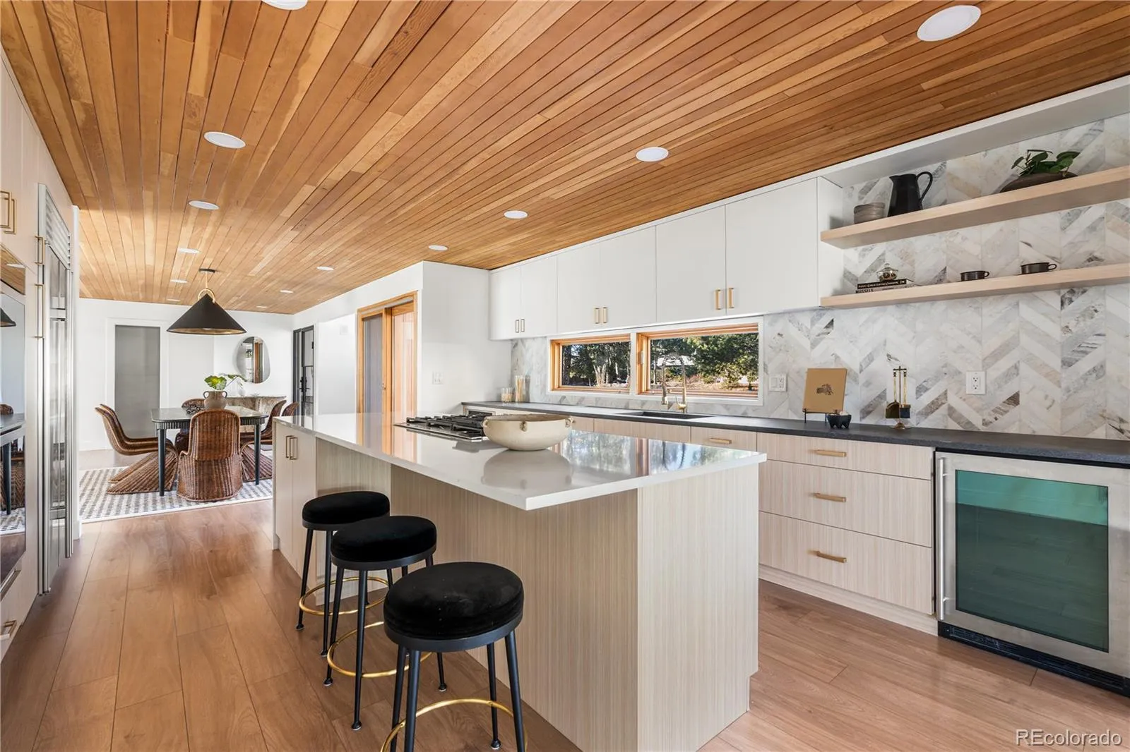 A custom designer kitchen with Monogram appliances anchors the home, opening seamlessly to the dining & living areas. Vaulted ceilings, expansive windows, & a gas fireplace create a warm, open main living space, while accordion glass doors dissolve the line between indoors & out, leading to the deck & surrounding greenery. Every room is connected to light & landscape in a way that feels calm & effortless.