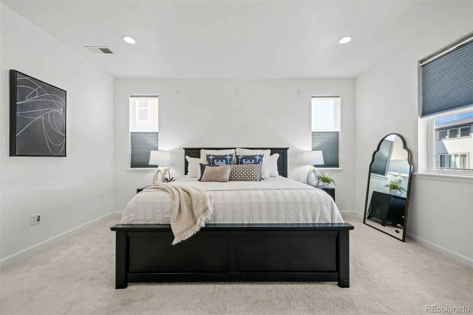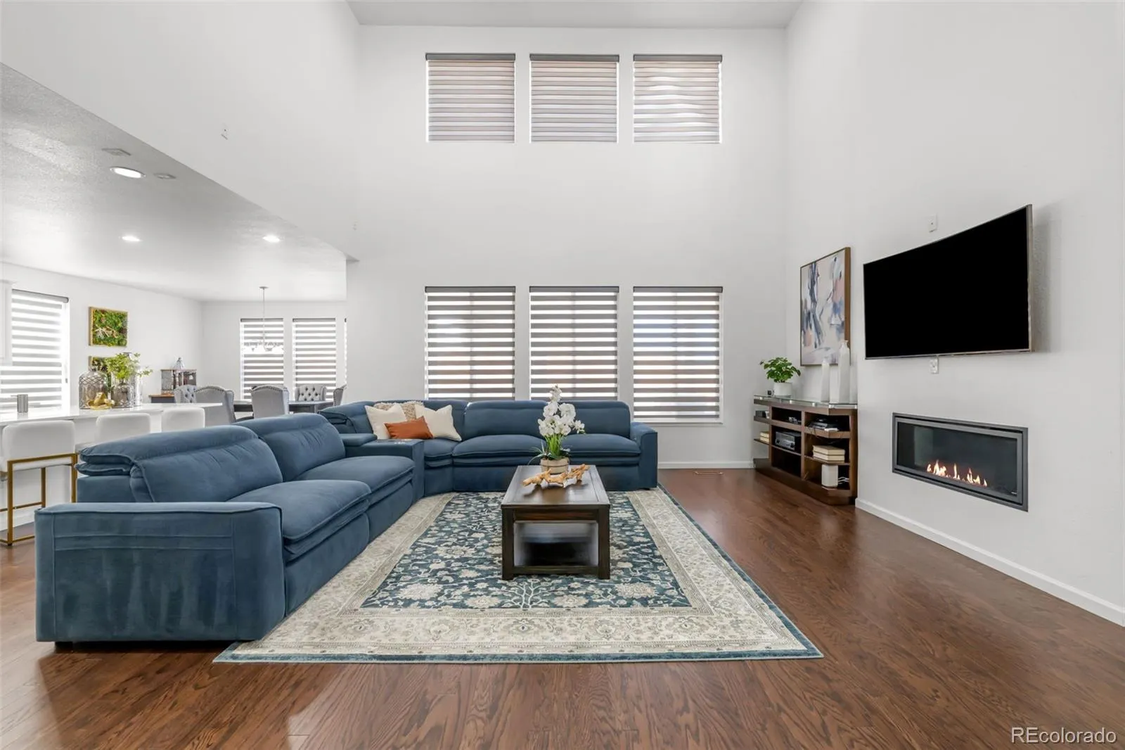 Comfort and technology upgrades include a pre-wired home theater sound system with 7.2 surround sound in the living room and 5.2 in the primary suite; remote-controlled dual-shade blinds with honeycomb blackout shades in all bedrooms; and a water softener and reverse osmosis system.