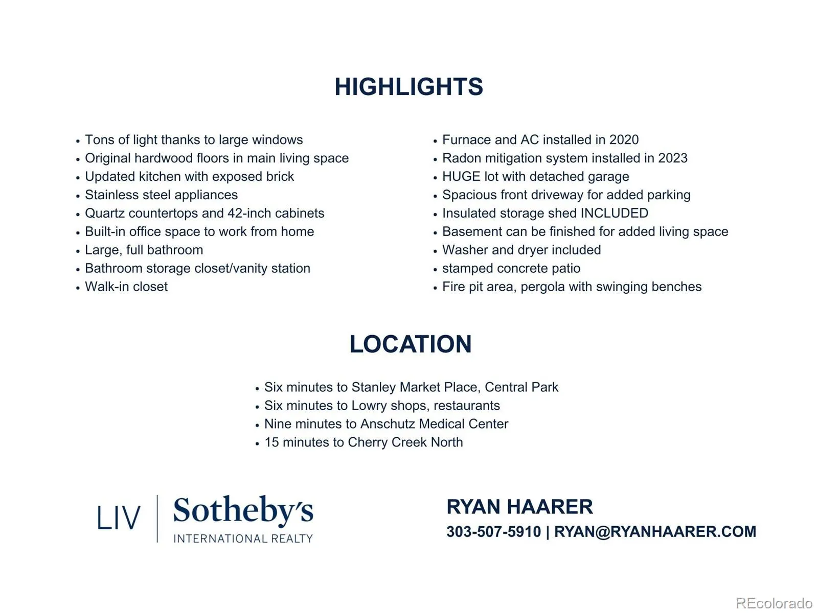 OPEN HOUSE SATURDAY 10-12! Do not miss this charming bungalow packed with updates and room to grow on a massive lot! The home itself features original hardwood floors and large windows for maximum sun exposure. The kitchen has been tastefully refreshed with off-white custom cabinetry, soft-close drawers, granite countertops, stainless steel appliances, a gas range, and an undermount sink, all tied together with charming details like exposed brick and an open, functional flow. The main level includes two comfortable bedrooms (one with a walk-in closet!) a spacious full bathroom with great storage and a built-in office nook, perfect for working from home without sacrificing a bedroom. Big ticket items have been replaced: furnace and AC installed in 2020. Radon mitigation installed in 2023. Beyond the main level you have more than 550 square feet in a basement for storage or finish it out as an office, secondary living room or bedroom. Out back, the fully fenced yard is set up for relaxing and entertaining with a stamped concrete patio, fire pit area, pergola with swinging benches, raised garden space, and mature landscaping that blooms beautifully in season. There’s also alley access to a one-car garage, two additional off-street parking spaces, and an insulated shed with electricity, ideal for extra storage. All of this in an incredibly convenient location near Central Park and Lowry, close to Verbena Park and Lowry Field, and just minutes from Anschutz, Cherry Creek, and Downtown Denver.