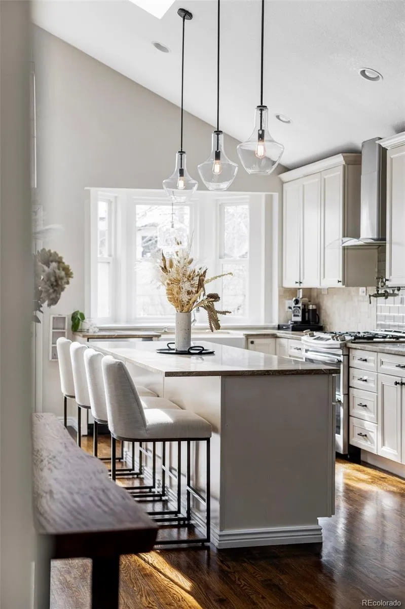 Just blocks from the vibrant 32nd Ave retail corridor, this charming 3-bed, 3-bath home offers the perfect balance of quiet neighborhood living with easy access to the best of the Highlands. A welcoming front porch and classic street presence immediately set the tone as you arrive. Inside, vaulted ceilings and abundant natural light define the main level, creating an open, airy feel that flows seamlessly from the cozy living room—complete with built-ins flanking the fireplace—through the dining area and into the expansive kitchen. Designed for both everyday living and entertaining, the kitchen features custom cabinetry, Italian marble countertops, stainless steel appliances, a five-burner range, and a four-seat island, all overlooking the backyard. South-facing exposure, skylights, and generous windows flood the space with sunlight throughout the day. The main floor offers exceptional functionality, with both the primary suite and a secondary bedroom conveniently located on this level. The primary suite includes a walk-in closet with custom finishes and an ensuite bath, creating a private retreat. A guest bath, loft space, and additional custom-finished closets complete the main level with thoughtful storage throughout. Downstairs, the lower level provides a flexible open living area ideal for a family room, office, or play space, along with a guest bedroom, guest bath, oversized laundry room, mechanical room, and additional storage. The home is equipped with a newly replaced tankless water heater and a radon mitigation system, offering both efficiency and peace of mind. Step outside to a fully fenced backyard featuring a quaint garden bed, flagstone patio, lawn with sprinkler system, and side yard leading to a rare three-car garage—ideal for parking, storage, or hobby space. This home delivers quintessential Highlands living with thoughtful design, quality upgrades, and an unbeatable location—ready to welcome its next owner’s home. All offers Due Monday at Noon!
