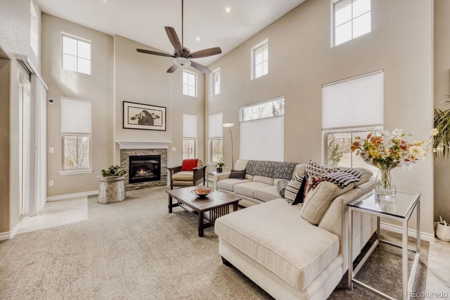 Lovely low maintenance main floor living townhome in highly sought after Tresana neighborhood. Gorgeous community w/ its Italian flair & hillside of homes /mountain views along walking paths.This home is nestled on a fabulous lot w/ a serene & private backdrop. Tresana’s popular Tessera model offers Two-Story ceilings & tons of natural light. Upon entry, you will feel right at home with upgraded, easy maintenance tile flooring and carpet throughout the main level. Just off the entry is a private study w/French Doors that could also be used as formal dining. The laundry room, just off one of the two single car garages, has additional storage and Electrolux washer and dryer. You’ll love entertaining w/ the gourmet designer kitchen set off w/ 42” cabinets, HanStone engineered quartz countertops, island seating, backsplash, stainless steel refrigerator, dishwasher, double ovens, microwave and a stunning butlers pantry are all included. A wall of windows, with Master Luminette Shears, into the open dining space & family seating area offers a peaceful, sun-filled setting. Cozy family room has a beautiful gas fireplace with stacked stone surround, ceiling fan, a media alcove & glass slider door, with retractable screen door, to outdoor patio. Spacious Primary Bedroom overlooks patio & includes a vaulted ceiling w/ ceiling fan & private 5 piece bath, walk-in closet & a linen cabinet for all your storage needs. Guests will love their own space on the upper level w/ 2 secondary bedrooms, a full bath & loft area. There are 2 – one car garages attached w/ ample storage space. Many Social Clubs year-round and summer events at the piazza/ pool! Tresana Homeowners Enjoy Community Pool / Patio, Walking/Biking Trails, walk to Whole Foods, King Soopers, Fitness Centers, Restaurants, Banks, & Pharmacy! Highlands Ranch includes 4 Recreation Centers. Minutes to C-470*HR Town Center*3 Hospitals*Park Meadows Shopping and a Great Lock and Leave Lifestyle! Start living the good life today!