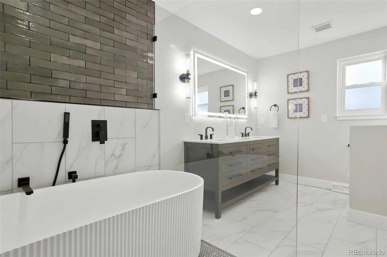 Welcome to 7310 S Sheridan Ct in welcoming Columbine Knolls. This fully remodeled home has all the bells and whistles. Upon entering this home, you will be greeted with open concept living room, dining and kitchen perfect for entertaining. The gourmet kitchen boasts new warm white cabinets, new/newer stainless-steel appliances including a 48-inch gas range and custom hood, beautiful quartz counter tops and back splash. Also featuring a walking pantry for extra storage. Moving past the kitchen you will find a cozy fireplace room perfect for relaxing and a moody powder bath. The rest of the main floor includes two good sized bedrooms and a hall bath with beautiful finishes and tile work. The main floor finishes off with the primary bedroom and en-suite. This primary includes large bedroom space, walk-in closet, and a large en-suite bathroom. The primary bathroom includes wet room, 72inch double vanity, custom tile and lighted mirror. This wet room that includes shower and large bathtub, custom tile and multiple shower heads will have you feeling like you live in a hotel. This home finishes off with a finished basement, that offers large family room, full bath, bedroom with egress window and laundry room. Moving back upstairs through the slider door that leads out to a covered patio, large backyard that backs to a walking path. This backyard allows for so many opportunities from gardening to the kids playing to the dogs play to many backyard BBQs this will be a perfect spot to make memories. Too many upgrades to list. Furnace & AC added 2023, new roof 2025 & Solar Panels added in 2023 are fully owned & lower the electric bill substantially. Just a short drive to Downtown Littleton for shopping & dining, Aspen grove is minutes away & just minutes from Chatfield Resevoir! Come see this Gorgeous home today!
