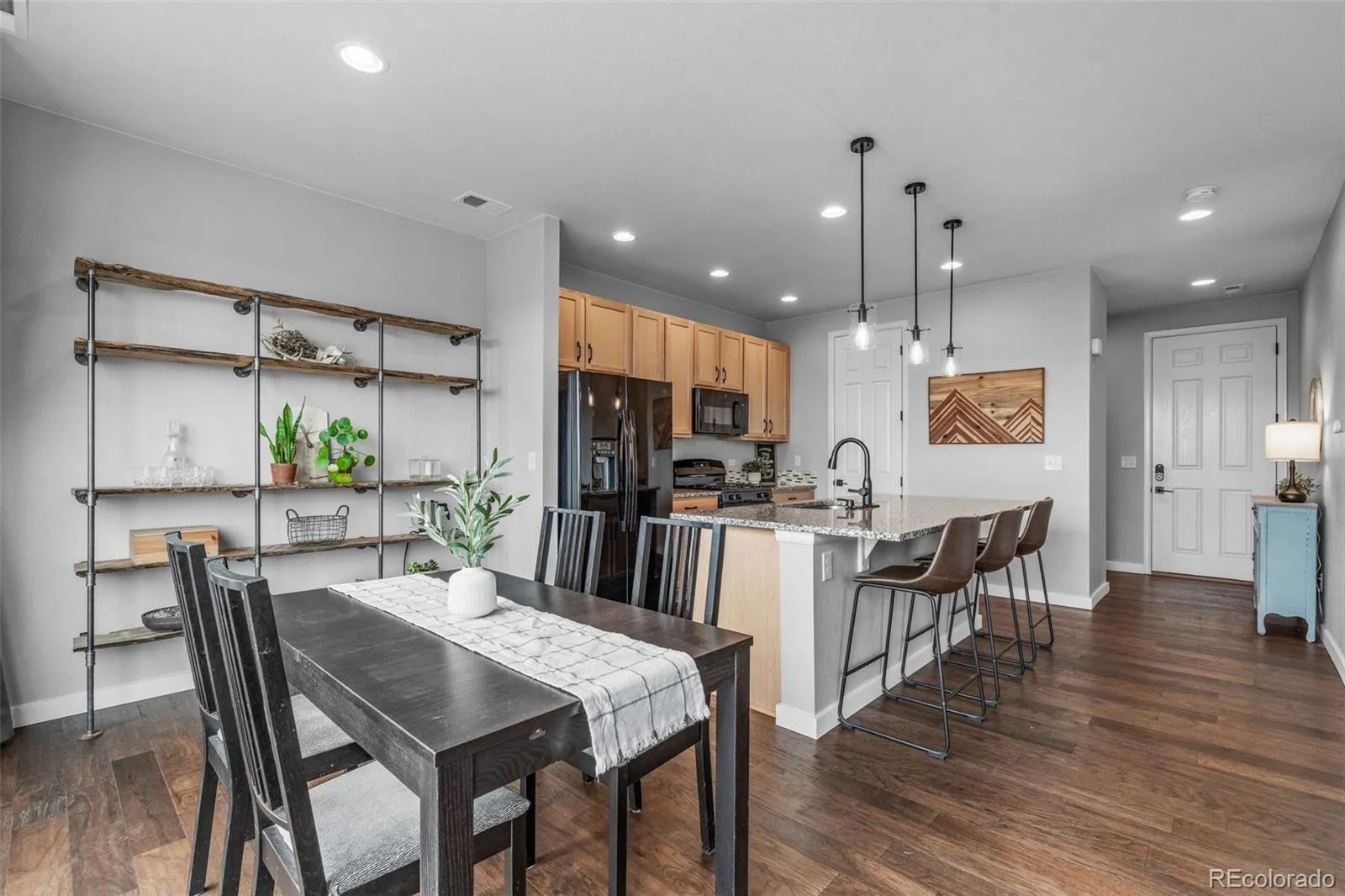 Welcome home to this gorgeous 3-bedroom, 3-bath residence offering over 1,900 sq ft of beautifully designed living space in the heart of Founders Village. From the moment you enter, you’ll notice an abundance of natural sunlight pouring through large windows, enhanced by recently installed engineered wood flooring throughout the first floor, creating a bright, warm, and inviting atmosphere.Set on a premium lot backing to protected open space, this home offers rare privacy and serene views. The fenced backyard is ideal for relaxing, entertaining, or enjoying peaceful Colorado evenings with nature as your backdrop, no rear neighbors, just sprawling open space! Inside, the layout is both functional and stylish, featuring recently updated hardware and fixtures throughout for a modern, cohesive look. Both the primary and guest bathrooms showcase recent quartz upgrades, while the home also includes recent luxury pet- and stain-resistant carpet, providing comfort and durability.Enjoy peace of mind with a recent Class 4 impact-resistant roof, and take advantage of the unbeatable location! Just a short walk to Founders Park with easy access to trails, playgrounds, and open space. A low HOA includes access to the neighborhood swimming pool, making this home as practical as it is beautiful.Combining thoughtful upgrades, natural light, privacy, and an exceptional location, this Founders Village home truly stands out!