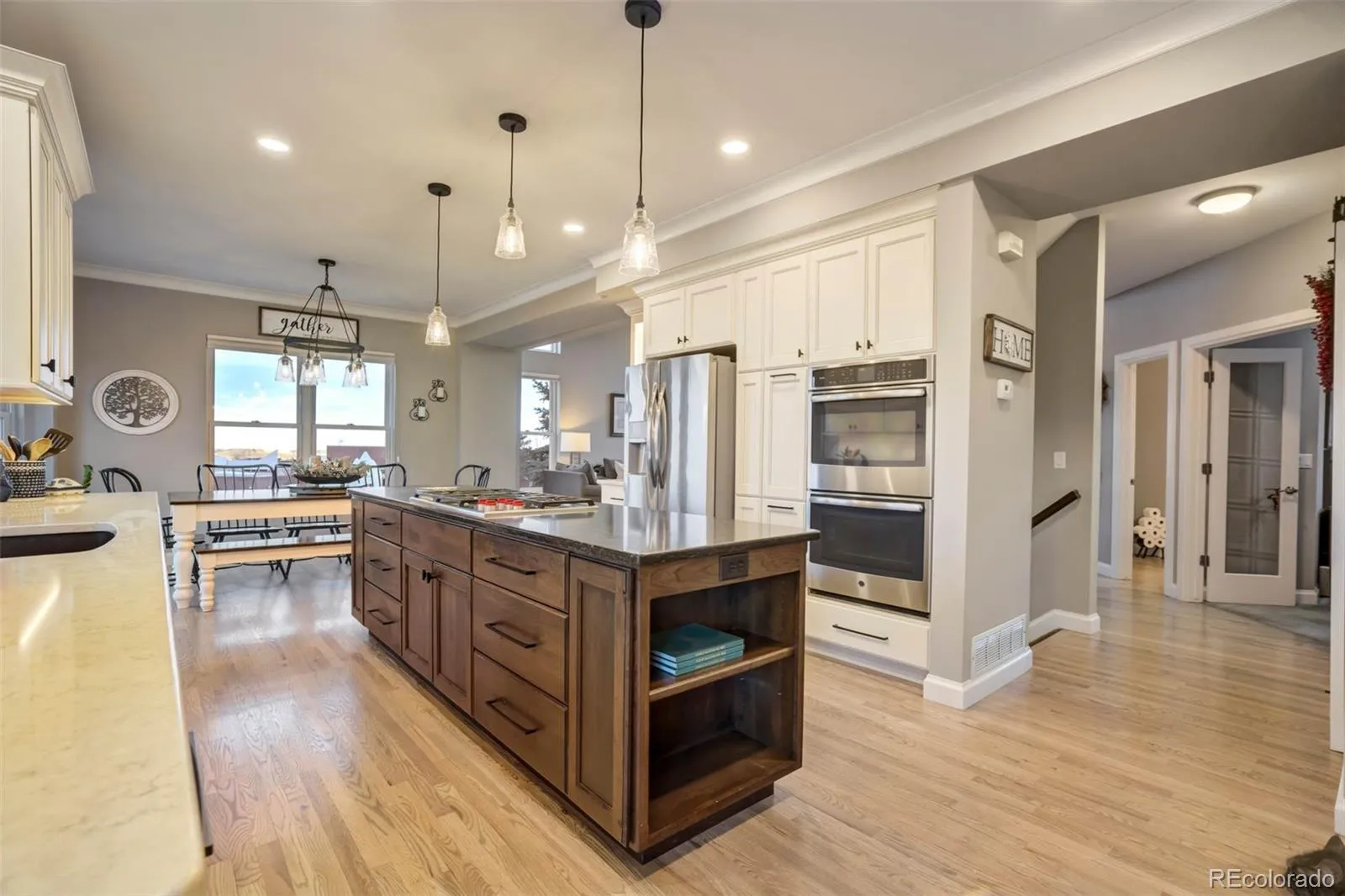 Beautifully remodeled home in the highly desirable Reserve at Broadmoor Glen, offering breathtaking mountain and city views and close proximity to NORAD, The Broadmoor, premier hiking trails, and outdoor recreation. From the moment you arrive, the thoughtful design and open floor plan create an inviting and elegant first impression. Soaring ceilings, expansive picture windows, and rich hardwood floors fill the main level with natural light and showcase the stunning surroundings.The gourmet kitchen is a chef’s dream, featuring granite countertops, abundant storage, stainless steel appliances, double ovens, a Wolf gas cooktop, soft-close cabinetry with smart pull-out organizers, and two oversized granite islands—perfect for cooking, entertaining, and gathering. The open, airy great room flows seamlessly into the dining area, where panoramic city views provide a striking backdrop. Step outside to the oversized composite deck, ideal for entertaining, with natural gas hookups for both a grill and fire pit. The main level also includes a private home office, a powder room, and a spacious utility/mud room with sink and ample storage.