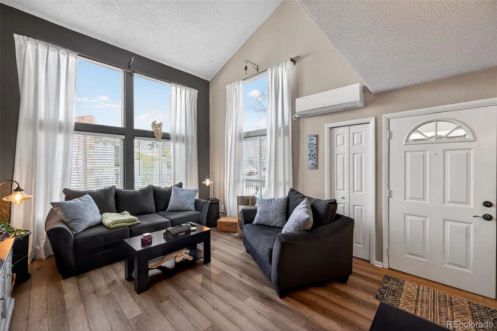 Bright & Airy: The open-concept living area boasts vaulted ceilings and large windows that flood the home with natural light.
