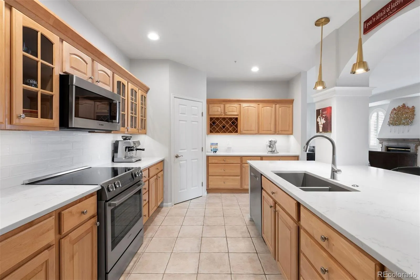 The thoughtfully designed kitchen showcases generous counter space, a large center island with seating, and abundant custom cabinetry—equally suited for casual mornings or sophisticated entertaining. Quartz surfaces, new Bosch stainless steel appliances, and refined pendant lighting elevate the space, while the seamless connection to the living and dining areas enhances flow and livability.