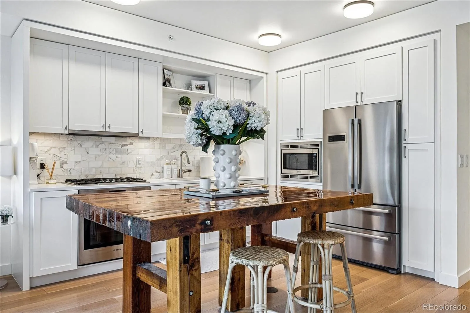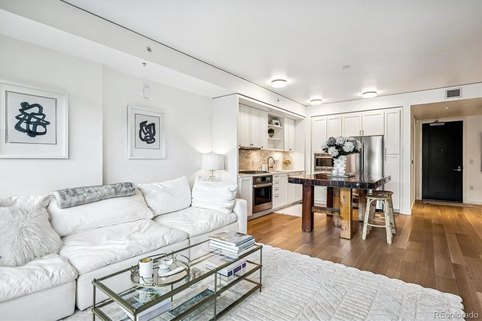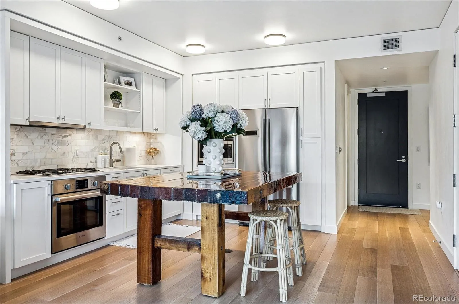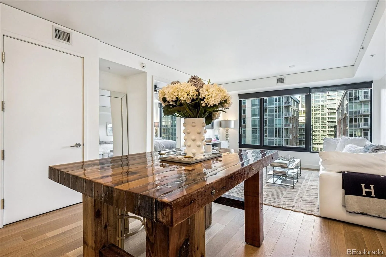 Beautiful light and bright pied a terre at The Coloradan providing a unique lifestyle similar to that of a boutique hotel. This spacious one bedroom unit has a large open floor plan with modern yet timeless and warm design. Bosch stainless appliances, a gas cooktop, white cabinetry, quartz countertops, a custom island, and a marble backsplash are all present in a chef style kitchen allowing for an elevated lifestyle perfect for entertaining in an incredible city location. Large windows allow loads of natural light and wonderful city and mountain views. The primary suite is a luxurious retreat with a Carrara marble five-piece bath, spa-style wet room, deep soaking tub, and spacious walk through closet. A pocket door for a sink and toilet doubles as an entertaining bath off the front entry and mudroom area. In addition, a dedicated laundry and mechanical room allows for additional storage. The Coloradan location has easy access to Union Station Plaza , Riverfront Park, Whole Foods, restaurants, cafes and shopping. Enjoy a lovely garden area, rooftop pool and hot tub with sweeping views, outdoor fire pits, a state-of-the-art fitness center, owner’s lounge, a quiet library, community events and building security. A wonderful for a primary or secondary residence. A pleasure to show.