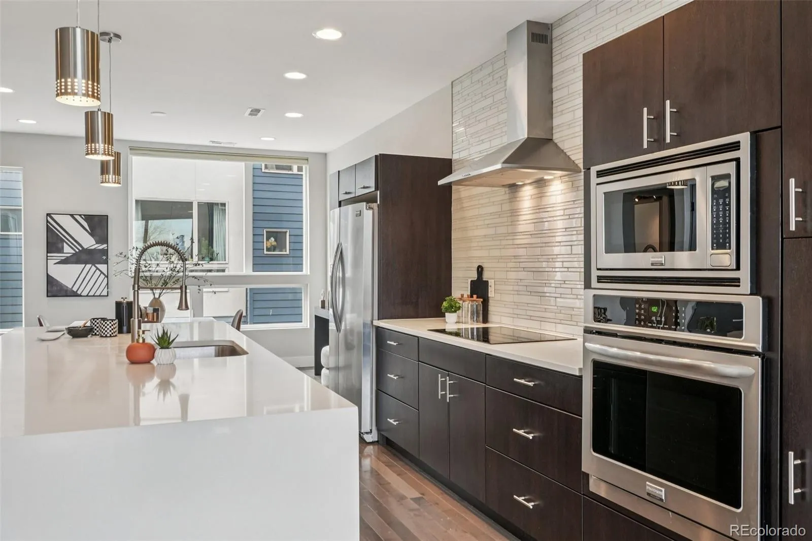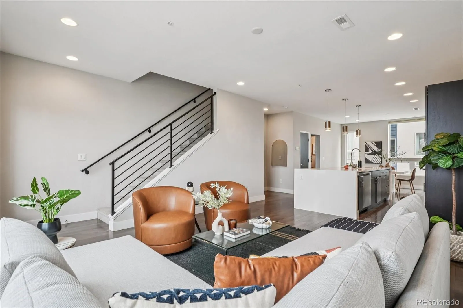 The main living level features an open-concept design filled with natural light, seamlessly connecting the kitchen, dining, and living areas. The kitchen is anchored by a large island and finished with sleek cabinetry, quartz countertops, stainless steel appliances, and contemporary lighting—creating a space that feels equally refined and inviting. The living area flows naturally outdoors, making it easy to take in the surrounding views and Colorado sunshine.