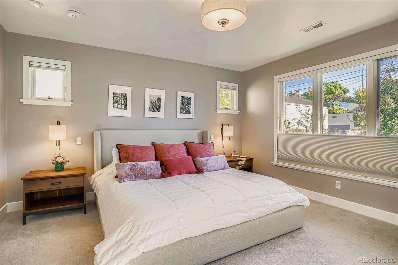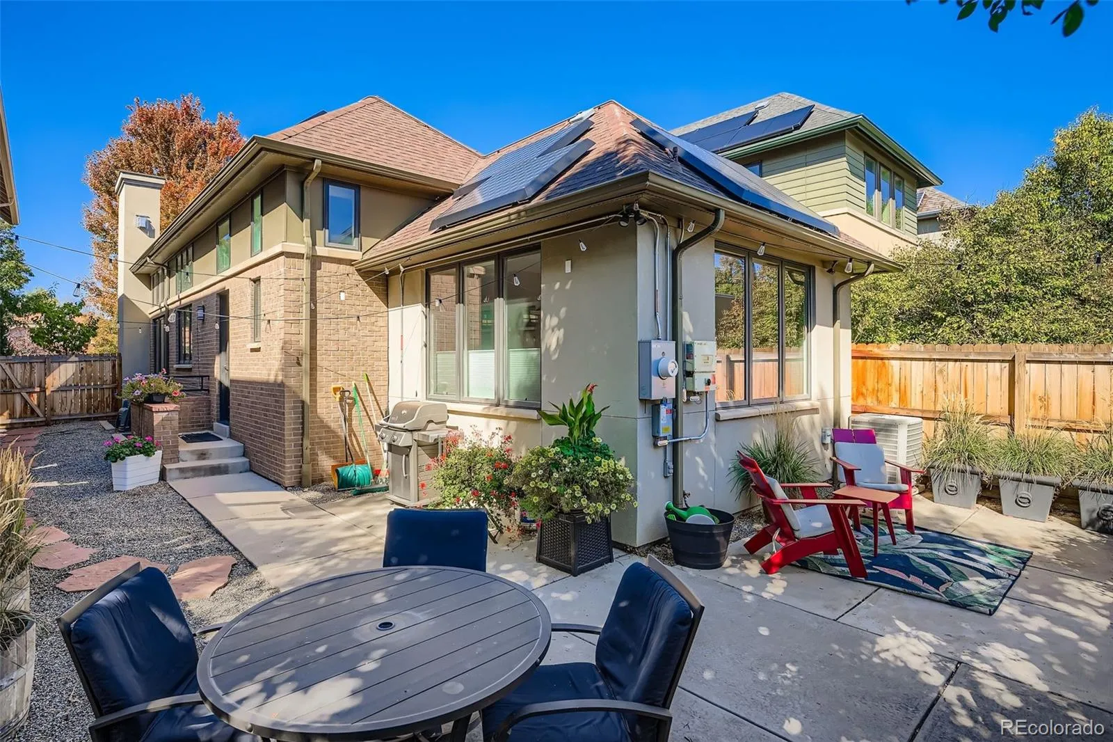 Rare modern ranch home built in 2009 in Wash Park West. This turn-key lock & leave home is a great alternative to Cherry Creek North! The home features an open floor plan with soaring wooden ceilings creating a bright airy living space, perfect for entertaining! The living room is anchored by a stately cast stone fireplace and is surrounded by windows. The kitchen offers room for a formal dining table and casual seating at the large island. It includes Caesarstone counters, Viking oven & Microwave, and a new Kitchen Aid dishwasher (2024). The kitchen opens to your cozy patio with a new tapped gas line for your outdoor grill. Drip irrigation allows easy care for planters and pots. The master suite is spacious with a walk-in closet fitted with ELFA organizers and racks. The master bedroom is surrounded by windows yet offers blackout shades for the most delicate sleeper! The elegant master bath is finished with contemporary tile and wood finishes, a 1/2 guest bath completes the main level. Hardwoods are on the main and carpet has been laid in the master (but the hardwoods remain underneath). The entire home has been fitted with motorized blinds that adjust for semi-transparency to full darkness for privacy. The lower level offers a huge family room with walnut floors, legal egress in family room with recessed lighting, one additional bedroom has legal egress with an adjacent full bath. A second non conforming bedroom is a great guest room, in-home gym or home office. The home features solar panels and a Tesla charging battery as well. All within blocks to over 10+ fun restaurants and easy access to Washington Park, South Broadway, and Cherry Creek North!