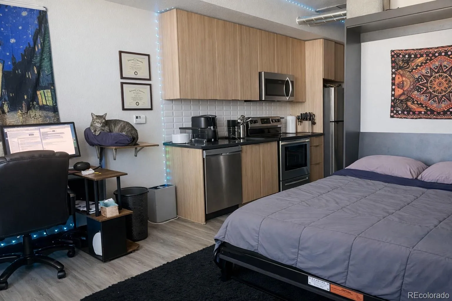* * * THIS IS AN AFFORDABLE HOUSING UNIT & NEW DPA PROGRAM OFFERING UP TO $50,000 for qualified first-time home buyers!!! Call for more details! * * * A sleek and sunlit retreat awaits in this bright Lincoln Park studio, ideally situated with easy access to highways, shopping, and dining. A chic lobby sets the stage for the vibrant lifestyle offered within the building. Inside, the kitchen features stainless steel appliances, light wood cabinetry, and a crisp white tile backsplash. The dedicated living area is perfect for relaxing or entertaining, highlighted by a large picture window displaying the city skyline. A thoughtfully designed Murphy bed maximizes space, allowing the home to transition effortlessly from day to night and change the mode and color with the ceiling track lights. The serene three-quarter bathroom includes a walk-in shower and modern tile and fixtures. Completing the home is the convenience of an in-unit stackable washer and dryer. Residents also enjoy close proximity to Sunken Gardens Park, adding a touch of nature just steps away.