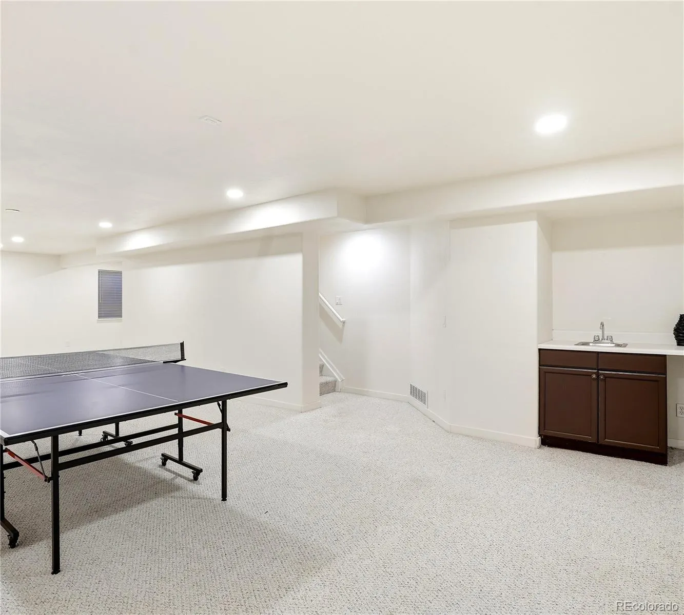 Downstairs, the basement is thoughtfully divided. The finished recreation area includes a wall wet bar—ideal for movie nights, game days, or a secondary living space. Behind a separate door, the unfinished portion provides excellent storage and convenient access to utilities, offering practical space you’ll appreciate long after move-in.