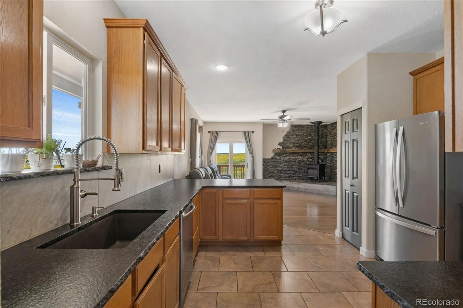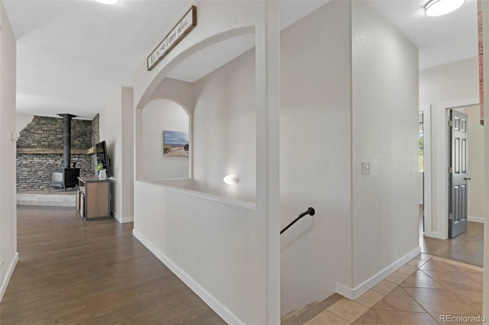 Inside, the open floor plan features hardwood floors, a wood-burning fireplace, and a thoughtfully updated kitchen with live-edge granite, modern sink, and backsplash. The main-level primary suite includes deck access, a walk-in closet, and a remodeled spa-style bath with Italian tile, granite double vanity, Roman tub, and rock-floor shower. Two additional bedrooms, a full bath, and a mud/laundry room complete the main level. The finished walk-out basement offers a large family room, additional bedroom and bath, and extensive storage space.