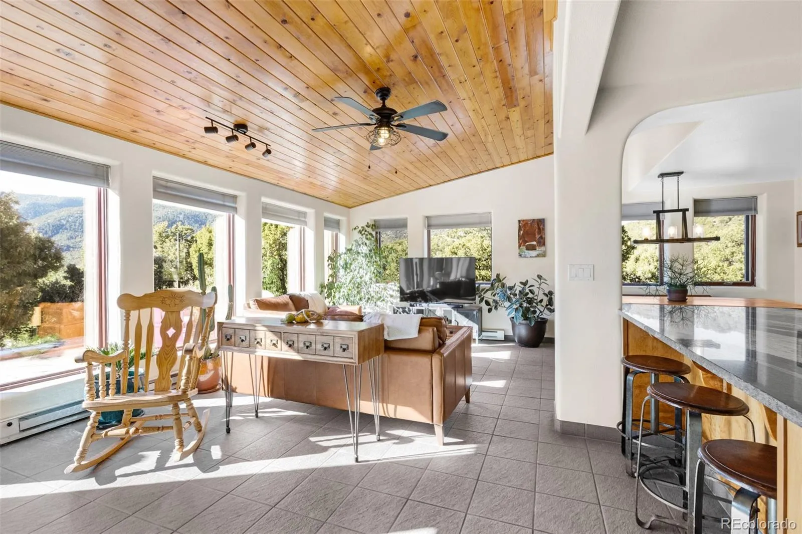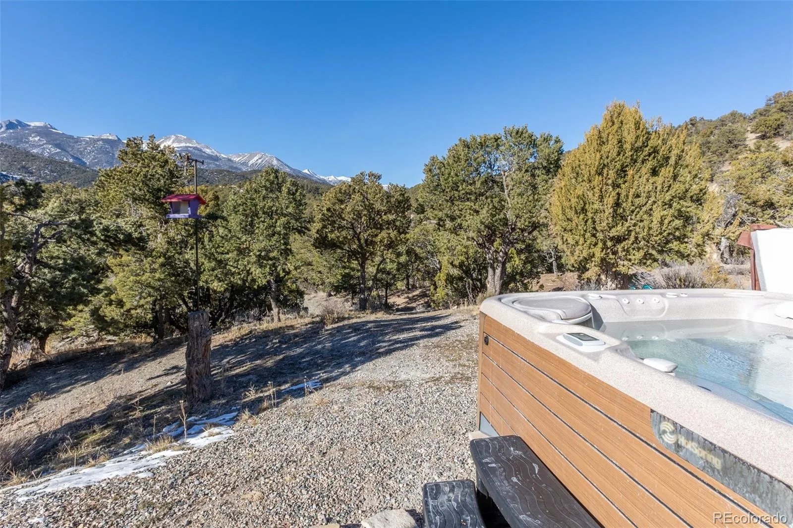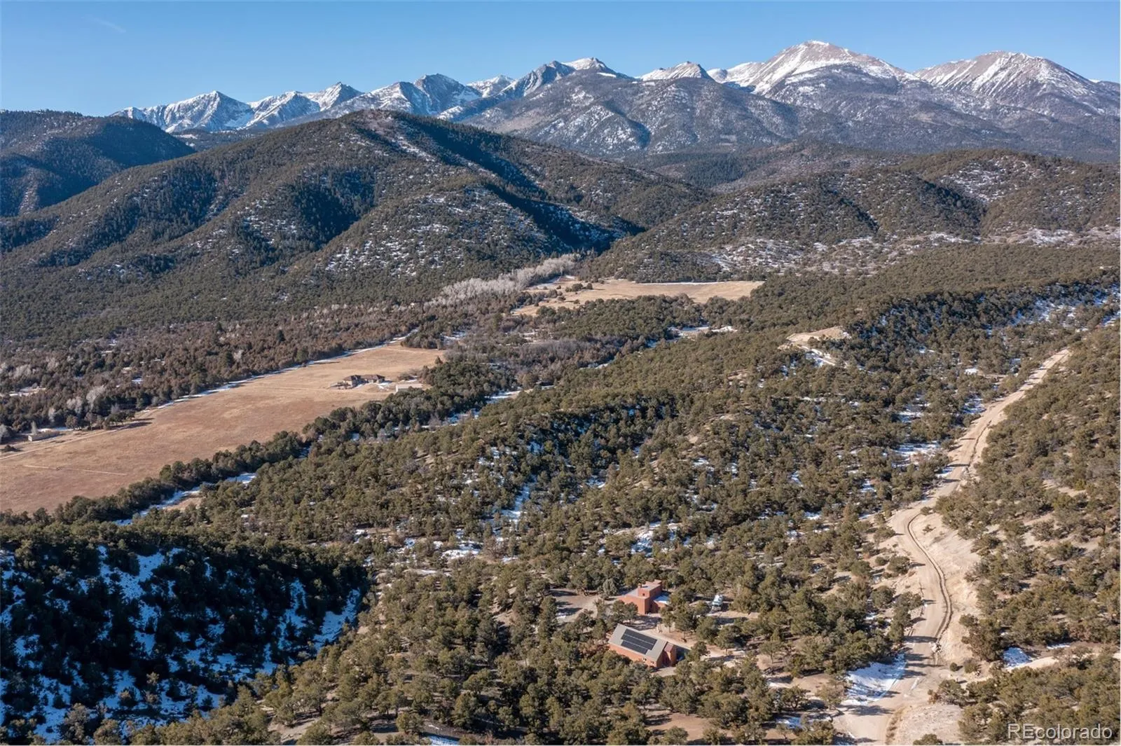 Beautiful energy efficient southwest-style home on 39 +/- acres, 25 minutes from Salida. This secluded, south-facing home takes in magnificent mountain views. Ideally situated for solar gain in the winter months, the home also features 16″ concrete walls for extra energy efficiency. The main house features a kitchen with granite counters, near-new appliances and breakfast bar. The kitchen opens onto a light-filled dining / living area with wood stove and tile floors that retain the warmth of the wintertime sun. The living area in turn opens on to a flagstone patio and hot tub for outdoor living and starry nights. A primary suite with 3/4 bath including walk-in shower and large walk-in closet, laundry and hallway access to an oversized one car garage rounds out the main level. Upstairs is a second bedroom with beetle kill floors, 3/4 bath and screened- in porch for taking in the Sangre de Cristo views. The detached oversized two car garage with guest quarters also boasts a bar and game room with pool table for entertaining. Above the garage and game room is a generous apartment / living area with kitchenette, 3/4 bath and south facing deck and second laundry. Also included is a 50 amp RV hook up and propane-powered back up generator. An 8.68 kw net meter solar system ensures energy efficiency. The 39+/-acre lot has approx 5 miles of private trails for hiking and biking. Public access to the Arkansas River is 5 minutes away. The property has been used as a successful vacation rental in the past.
