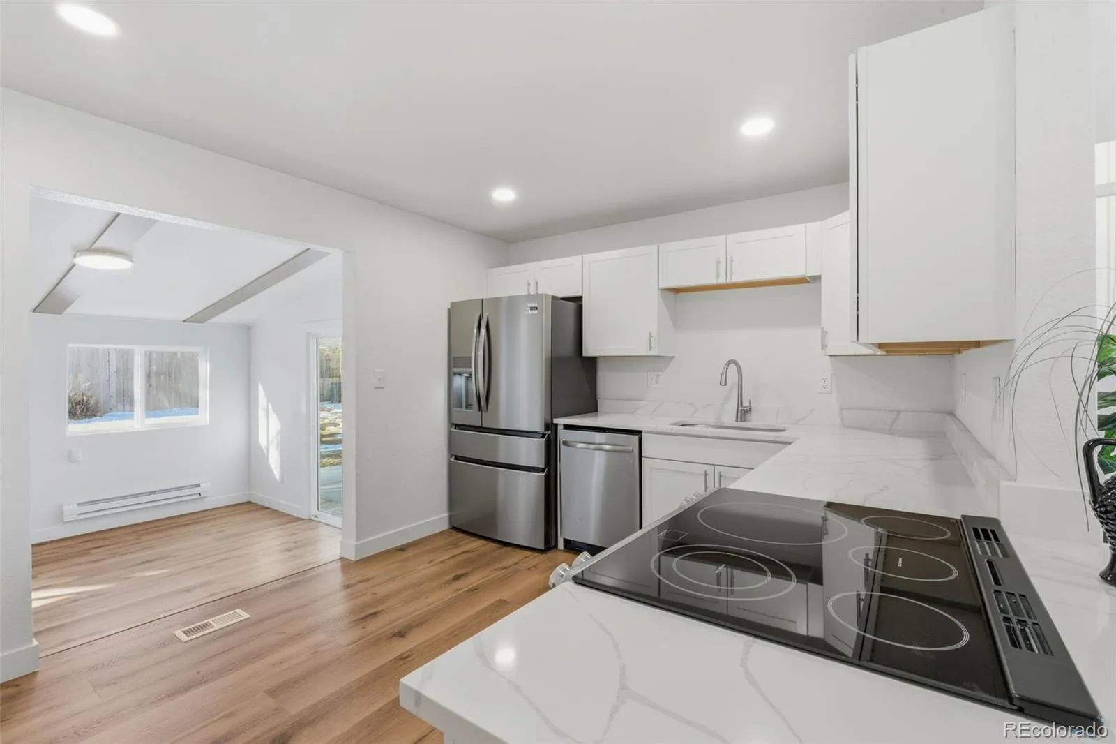 The main level features a bright and welcoming living area with modern finishes, recessed lighting, and durable vinyl flooring that flows seamlessly into the kitchen and dining room. The updated kitchen showcases white cabinetry, stainless steel appliances, generous counter space, and an open connection to the dining area—perfect for everyday living and casual entertaining.