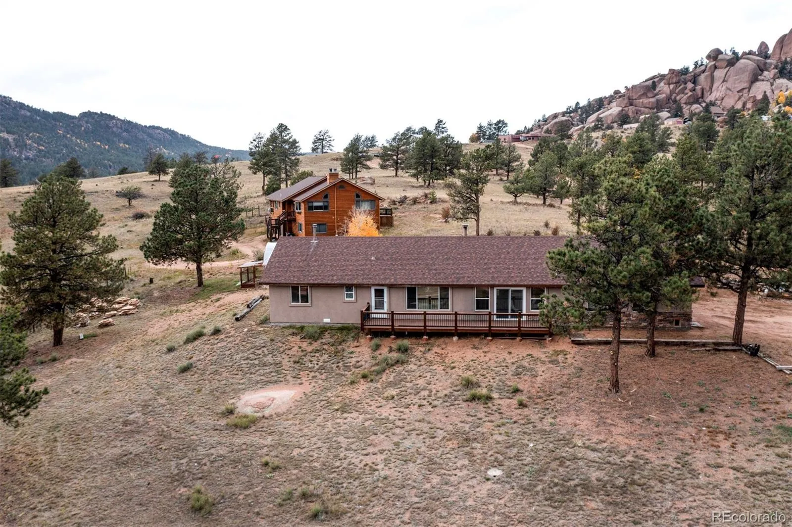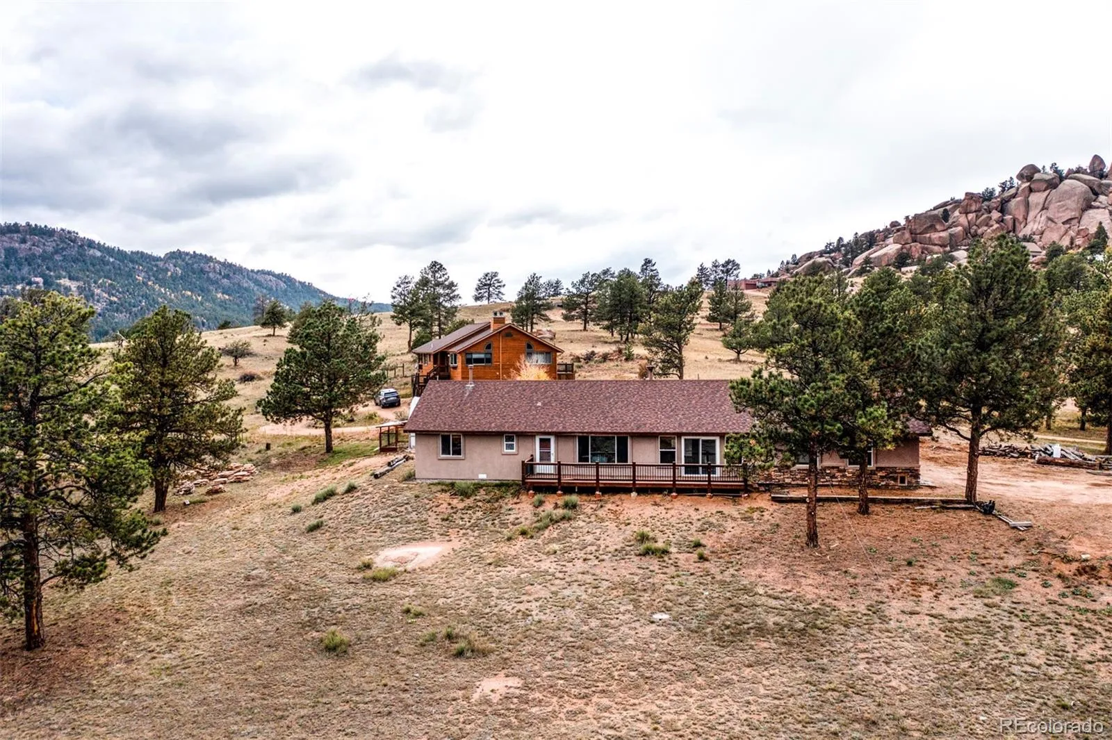 Your Mountain Retreat Awaits! Nestled on nearly 3 acres of natural beauty, this property offers breathtaking panoramic views in every direction. Whether you’re looking for a retirement home, an Airbnb investment, or simply a peaceful escape from the city, this is the perfect choice! Featuring many upgrades and charming details, including new stucco exterior, new flooring, new roof, new appliances, new backsplash and solid countertops, with rough edges, new spacious deck, a cozy Aspen-style outdoor bar, greenhouse, 4 bedrooms, 2 bathrooms, and a large kitchen ideal for entertaining.Unwind by the pellet stove in the living room or relax in the brand new outdoor jacuzzi while taking in the incredible mountain scenery. Enjoy peaceful mornings, cozy nights, and unforgettable gatherings with family and friends. Don’t miss this amazing opportunity to own your private Colorado getaway!