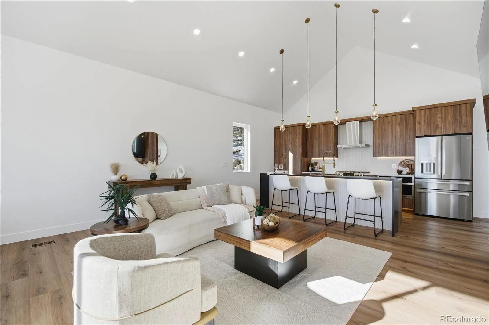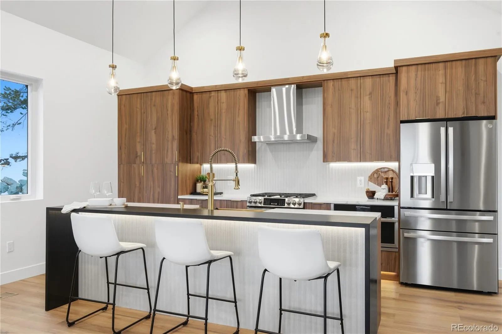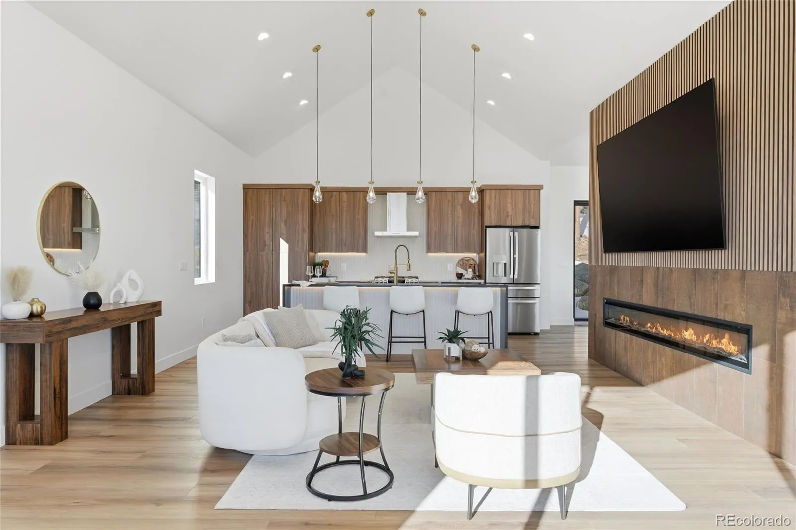 Take in breathtaking mountain views from expansive windows & a large covered deck off of a bright, open great room with soaring vaulted ceilings, an electric fireplace wrapped in European tile, and an exceptional dining space made for gathering. The kitchen is the true heart of the home – with a dramatic waterfall island, luxury quartz countertops, custom soft-close cabinetry, a beautiful custom backsplash, high-end GE stainless steel appliances, a gas range, and a pantry.