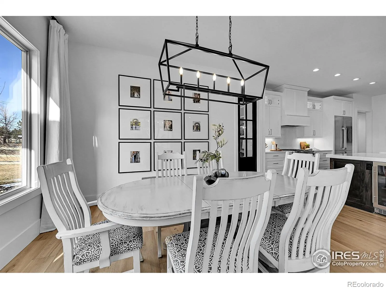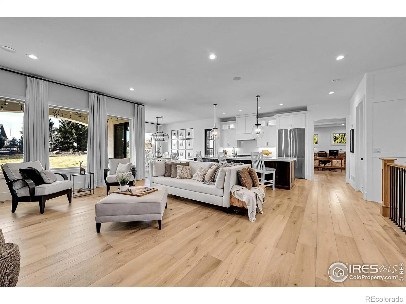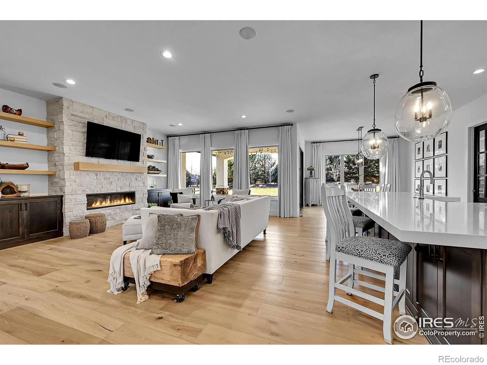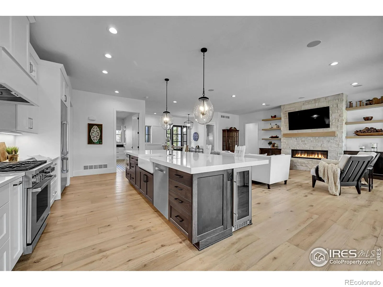 Welcome to 6582 Rookery Rd, a 5-bedroom, 6-bath, 5,012 sq ft ranch-style home designed for exceptional single-level living in the prestigious Sanctuary at Fossil Lake Ranch. Set on a private, professionally landscaped 0.53-acre lot, this beautifully remodeled Lauren Ashley Homes residence is located in one of Fort Collins most sought-after neighborhoods. Enjoy an unbeatable location within walking distance to Zach Elementary, Preston and Kinard Middle Schools, and Fossil Ridge High School, with quick access to the Harmony Corridor, major employers, medical centers, and I-25. Blending modern farmhouse charm with elevated contemporary finishes, the home features flat white walls, elegant wood paneling, and wide-plank white oak engineered wood flooring. The open-concept gourmet kitchen showcases premium Dacor appliances, custom Milarc cabinetry, quartz countertops and backsplash, an oversized island, and a built-in bar refrigerator. A walk-in pantry with appliance garage and coffee bar adds everyday convenience. The light-filled living area is anchored by a floor-to-ceiling stone fireplace, floating shelves, custom built-ins, and expansive windows overlooking the serene backyard. The main level offers true single-floor living with a luxurious primary suite, second en-suite bedroom, powder room, dedicated office or optional bedroom, laundry suite, and a stunning mudroom. Outdoors, a covered patio with dining and lounge areas, string lighting, and a fire pit creates the perfect year-round entertaining space. The finished lower level provides additional flexibility with a family/media room, wet bar with dual beverage refrigerators, home gym, two en-suite bedrooms with walk-in closets, an additional powder room, and a second laundry area. Thoughtfully designed throughout, this home seamlessly blends luxury, comfort, and functionality just minutes from everything Fort Collins has to offer.
