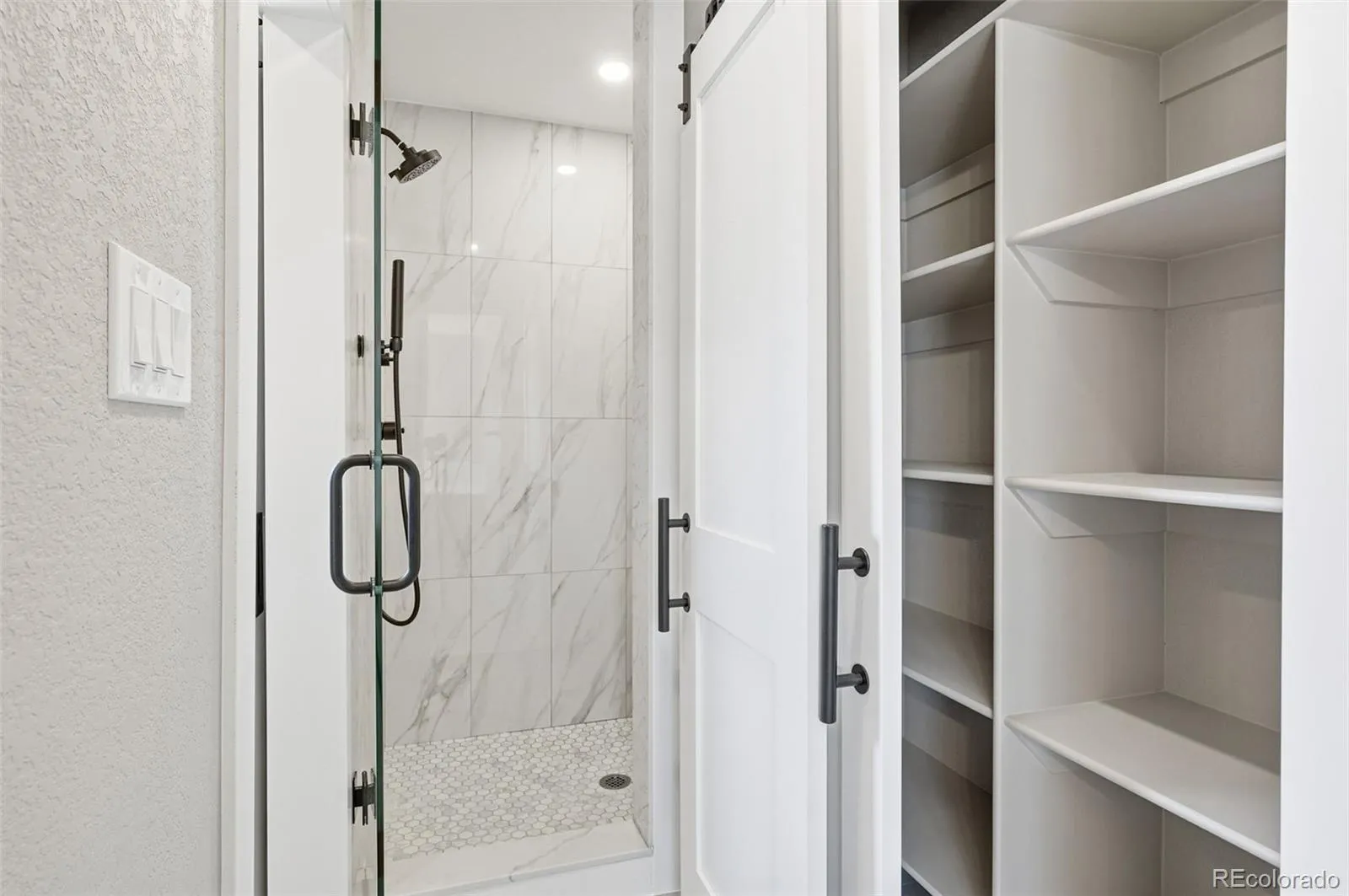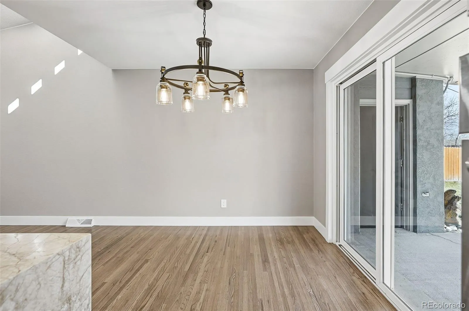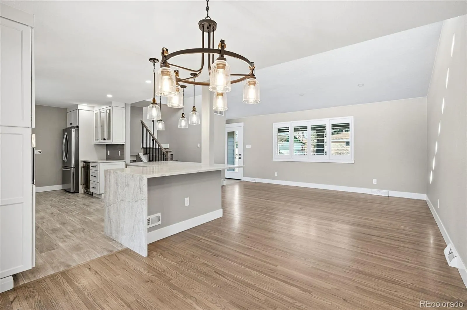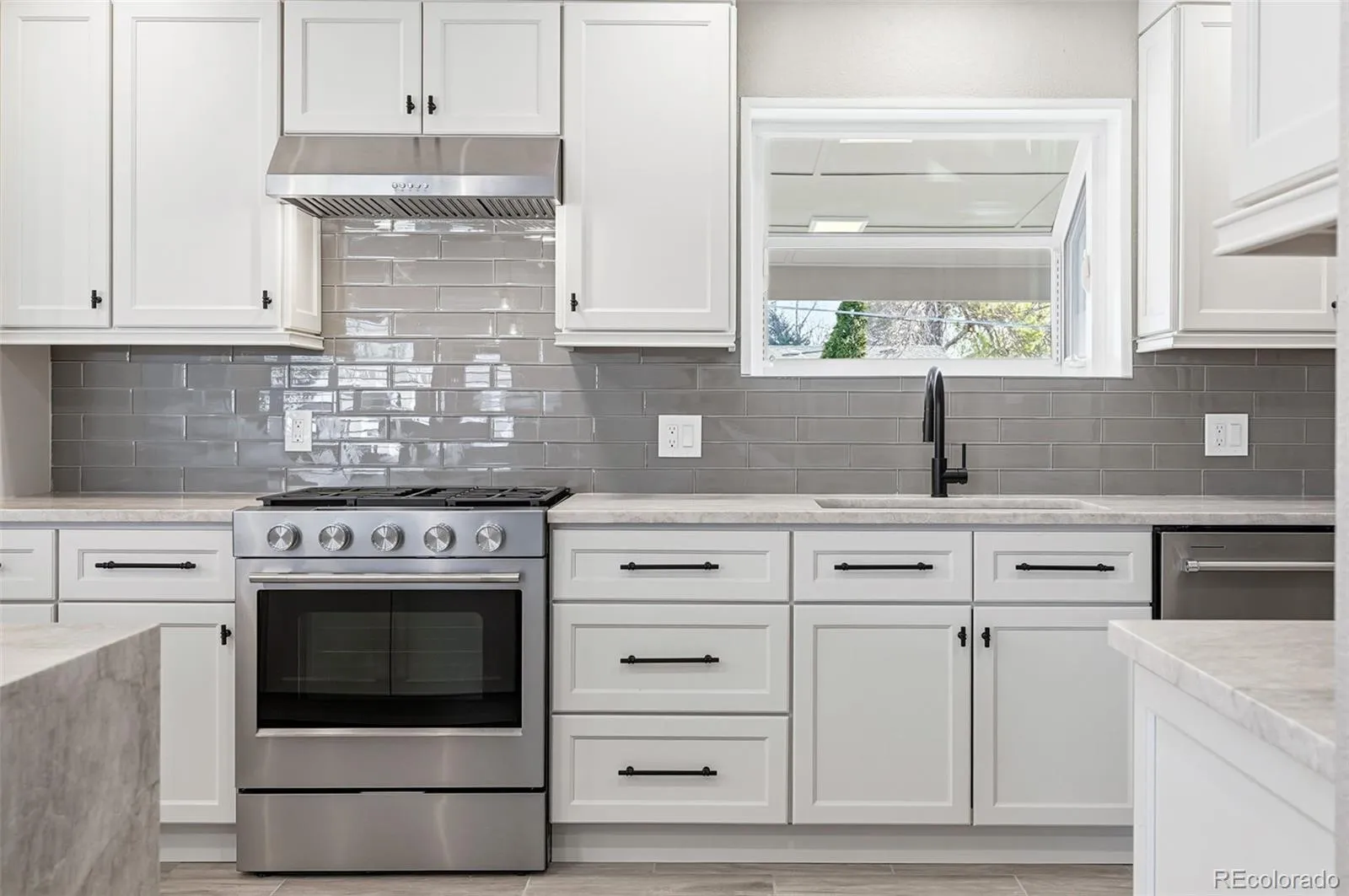Exquisitely renovated 4-bedroom, 3-bath mid-century gem in a premium Arvada West location. This home has been completely rebuilt from the top of the roof to the sewer line—no detail overlooked. The upper level features a spacious primary suite with walk-in closet and spa-inspired five-piece bath, including soaking tub and custom shower. The main level offers a bright, open great room with soaring ceilings, abundant natural light, and refinished real hardwood floors flowing into the dining area and oversized, brand-new kitchen. The kitchen showcases floor-to-ceiling shaker cabinetry, waterfall granite island, full tile backsplash, KitchenAid appliance package, gas range, built-in microwave, under-counter beverage cooler, and French-door refrigerator.