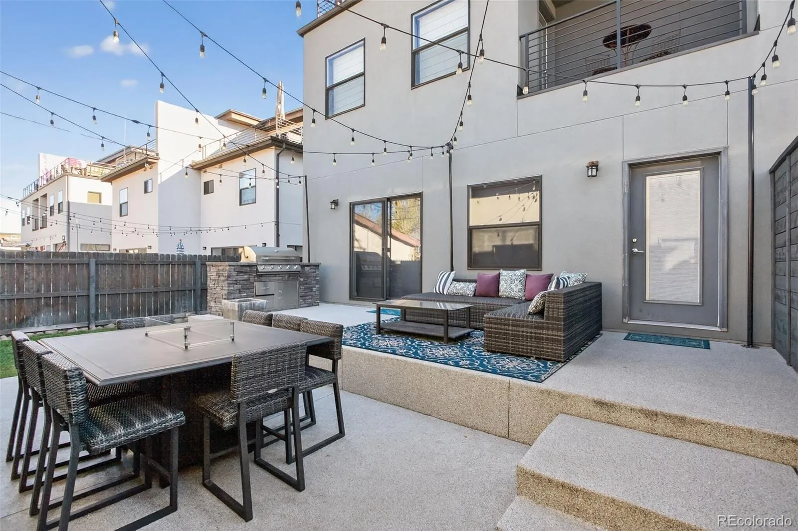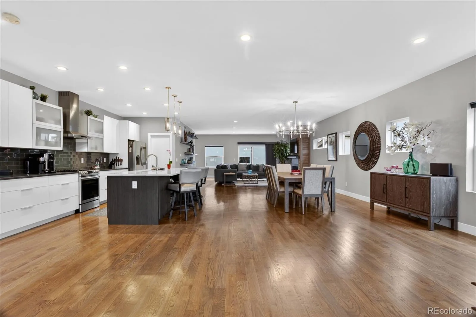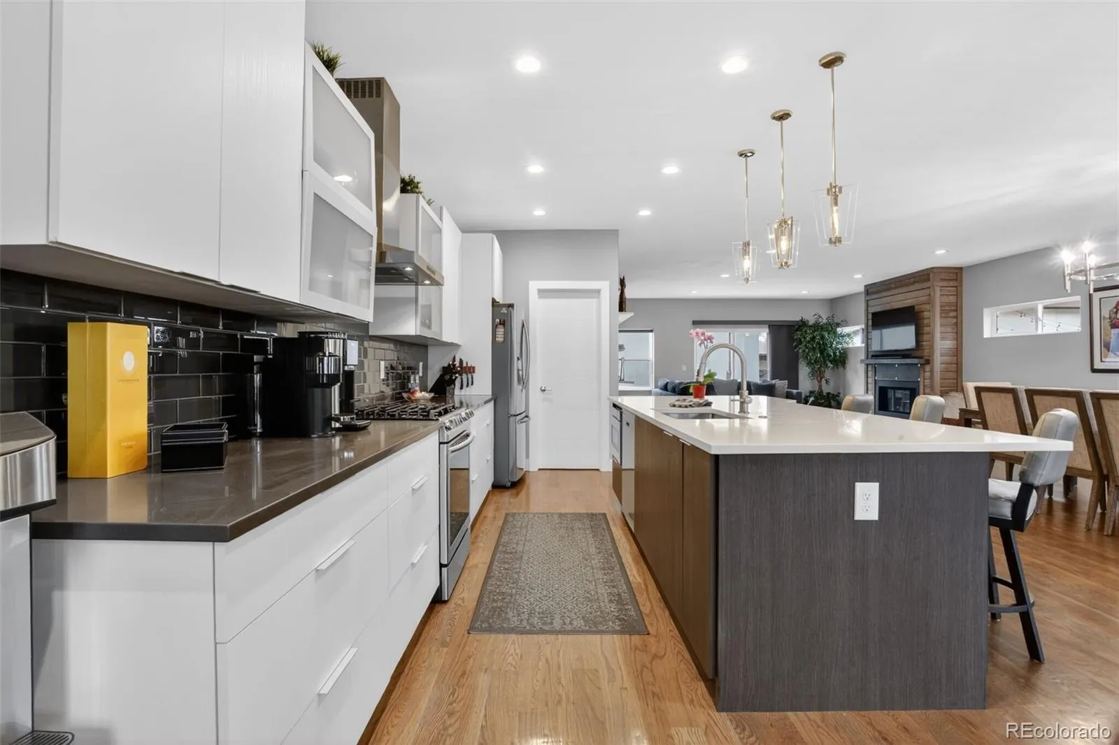 Stunningly beautiful three-story duplex with one of the largest floor plans in the area, including your very own three car garage and a fully finished basement! Richly stained hardwood floors flow seamlessly through the main level all accented by plenty of natural light streaming through various uniquely shaped windows. This open-floor concept features a contemporary kitchen with glossy flat front cabinetry, S/S appliances, a spacious quartz topped center island, complete with pendant lighting, a walk-in pantry, custom tiled backsplash and streamlined gas stove hood vent. The family room features a wall of decorative floating shelves across from a nicely textured wood encased gas fireplace and mantel area. Tucked in the corner is a powder room along with easy access to your rear patio with built-in gas BBQ. The second level features the rear primary bedroom, complete with a spa inspired five piece ensuite bathroom with a stand alone tub, spacious shower, large walk-in closet and a private rear deck. Both secondary bedrooms feature Juliet-styled balconies and their own private full bathrooms. The full-sized laundry room is also conveniently located on this level, complete with a wash sink and folding table with plenty of storage. The third level features another bedroom/office with its own balcony, a 3/4 bathroom and a large rec room with a built-in wetbar and access to your roof-top deck with spectacular mountain views. The finished basement with 9′ ceilings features another large room perfect for a gym, 2nd office, or Mancave along with a 5th bedroom and bath. Countless special features are found throughout the home and outdoor deck and patio areas, bringing outdoor fun in! Easy to maintain fully fenced yard off the 3-car garage (unheard of for a duplex) with a rear service door for added security. Located within easy walking distance to local coffee shops, parks and only minutes from Downtown Denver and light rail. No added cost of an HOA-Party Wall agreement.