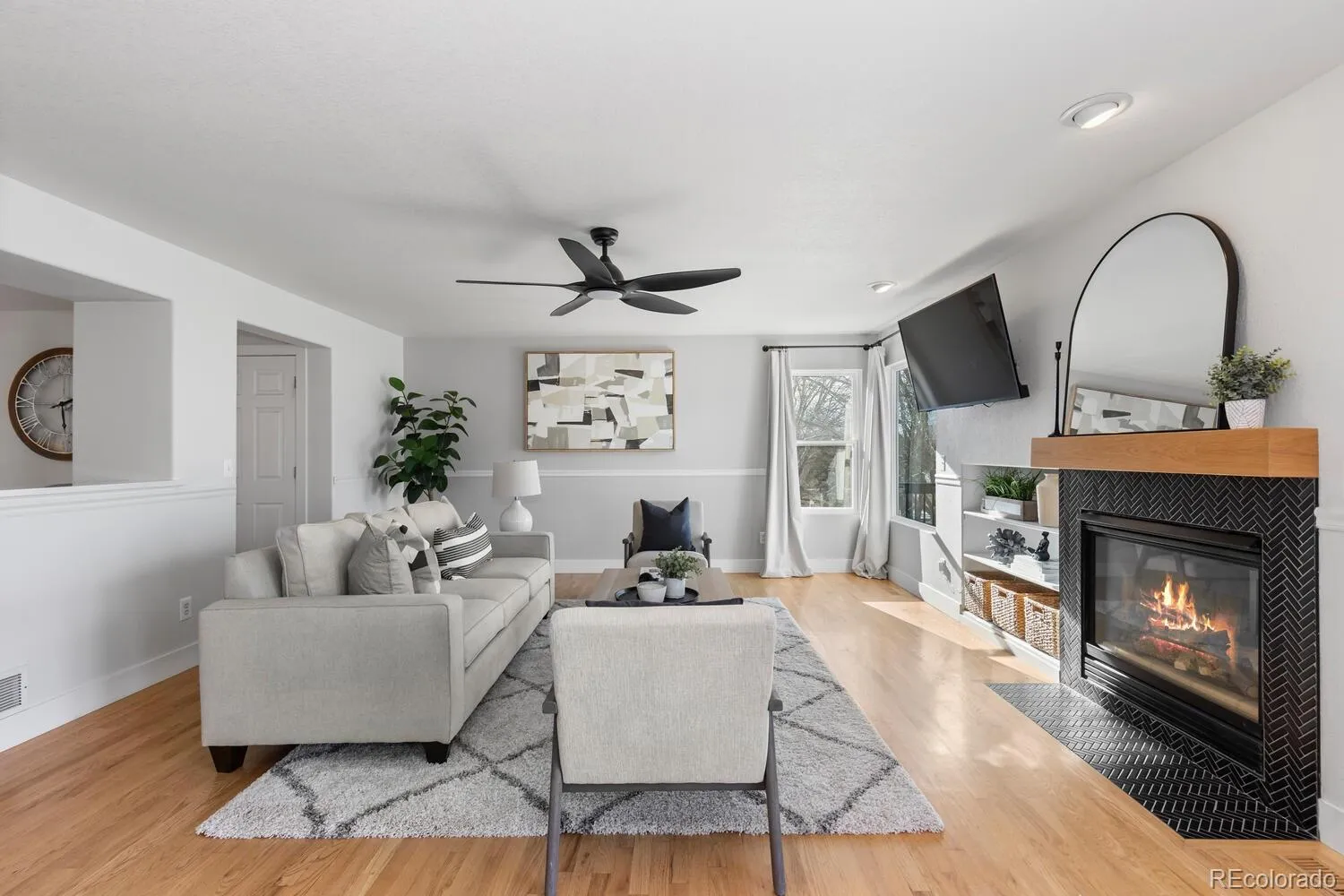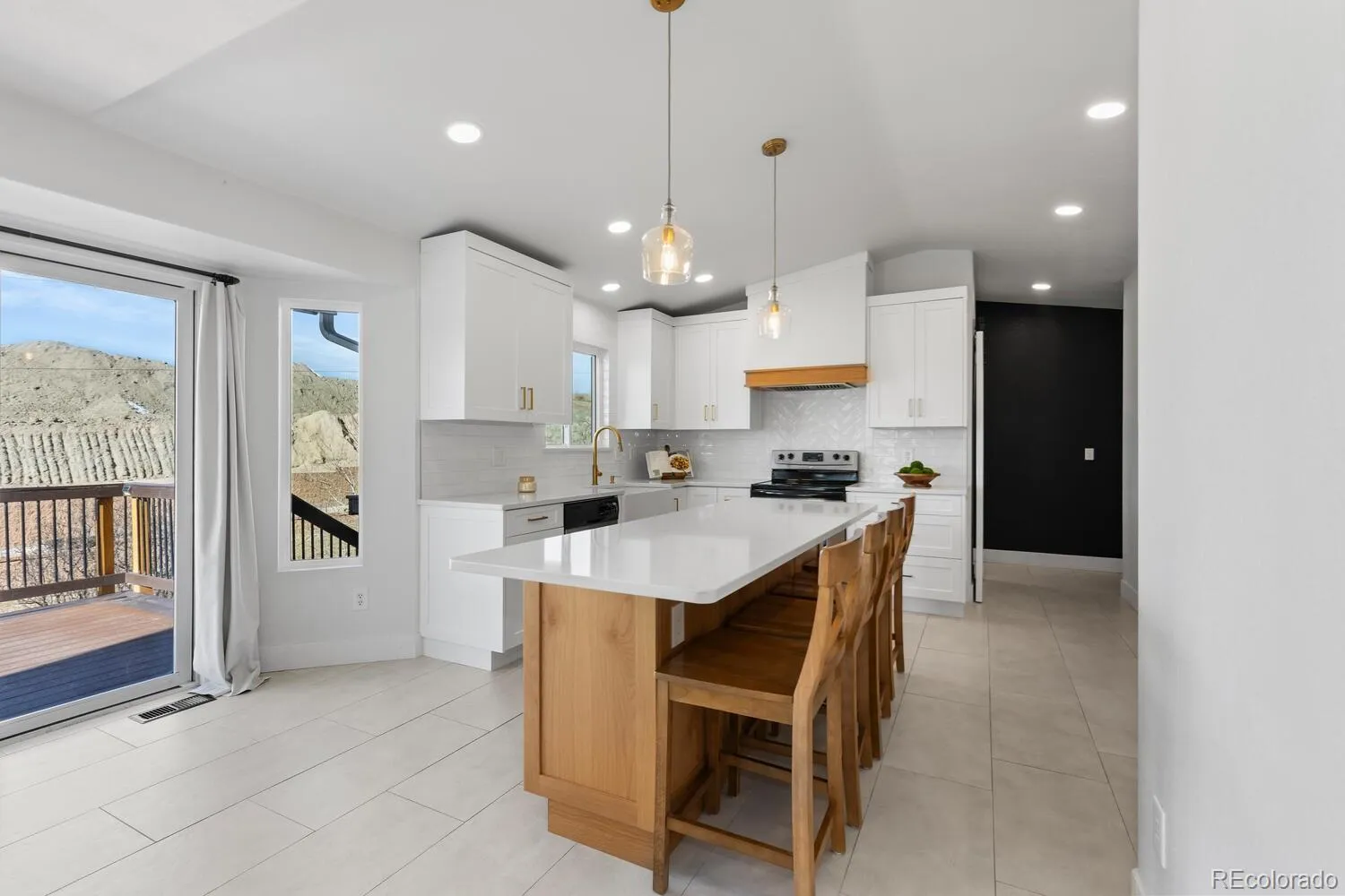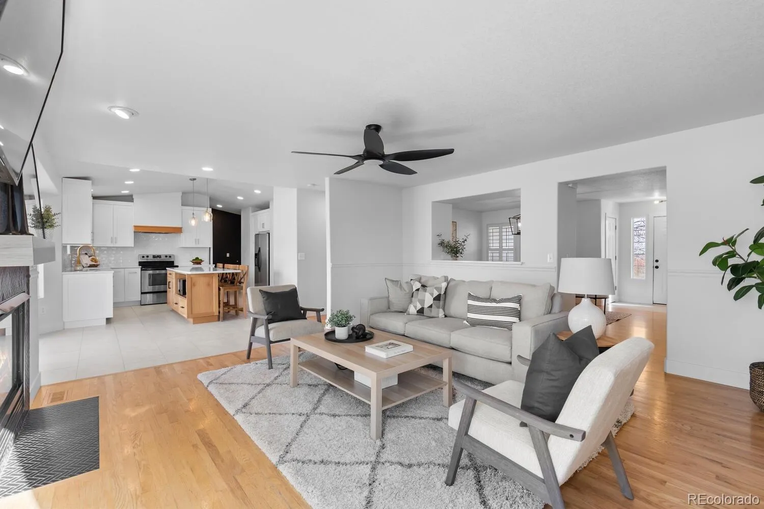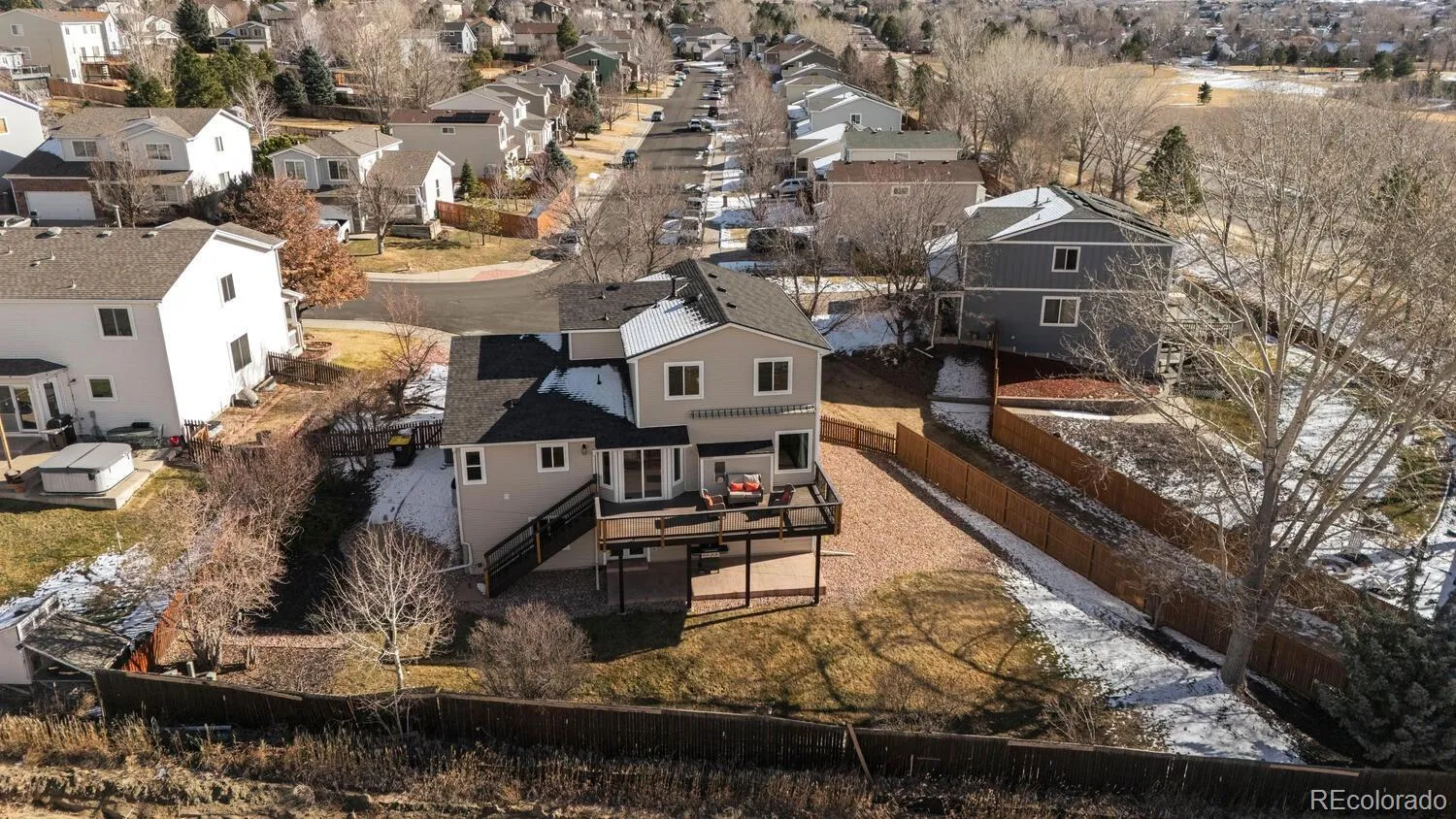 Welcome to this beautifully remodeled, move-in-ready home tucked into a quiet cul-de-sac located in the heart of Parker! Backing to a greenbelt and set on an oversized lot, this home offers privacy, views, and thoughtful updates throughout. From the charming covered front porch and extended driveway to the light-filled interior, every detail has been carefully considered. The main level features an open floor plan with refinished hardwood floors, a spacious dining area with built-in dry bar and beverage refrigerator, and a living room anchored by a cozy gas fireplace and oversized windows. The brand-new designer kitchen showcases quartz countertops, custom cabinetry, stainless steel appliances, a large island, and modern finishes—perfect for both everyday living and entertaining. A convenient mudroom and laundry area with excellent storage and a fully renovated powder bath complete the main level. Upstairs, the vaulted primary suite offers peaceful greenbelt views and a fully remodeled primary bathroom with quartz countertops and an oversized walk-in shower. Two additional bedrooms and a full bathroom complete the upper level. The walk-out basement adds flexible living space with a large recreation room, full bathroom, and media or flex room, along with a bar area featuring a kegerator and mini-fridge. Step outside to enjoy the covered patio and expansive composite deck—ideal for outdoor living. Additional highlights include dual water heaters, hot and cold water spigots in the garage, newer double-pane windows with lifetime warranty, full fencing, and a prime location just 5 minutes from Downtown Parker, including the PACE Center, Parker Library, O’Brien Park, shopping, dining, and entertainment. This is a rare opportunity to own a beautifully updated home in a sought-after Parker location.