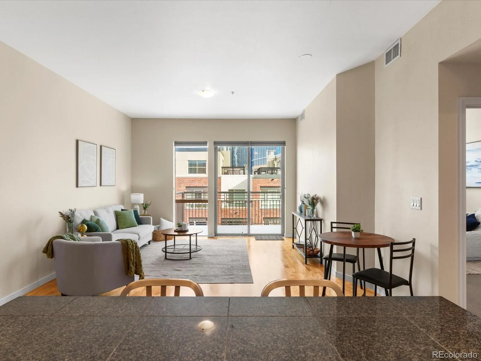 Welcome to this stylish and efficient condo in the heart of downtown Denver. It offers unbeatable access to the light rail, top-rated restaurants, lively bars, parks, and everything urban living has to offer. The open-concept living and kitchen area is filled with natural light and features a cozy breakfast nook, granite tile countertops, and a functional island—perfect for entertaining. A spacious 130 square foot outdoor covered patio right off the living room provides a great place for morning coffee or evening drinks. The charming four-piece bathroom includes a soaking tub and a separate shower, offering a spa-like feel. The bedroom features an expansive walk-in closet, providing ample storage and organization space. Additional conveniences include one dedicated community garage parking space, a private storage unit located on the fourth floor, and security which monitors the complex 24/7 for added peace of mind. This adorable condo is an ideal opportunity for a blend of low-maintenance downtown living with comfort and convenience right outside your door!