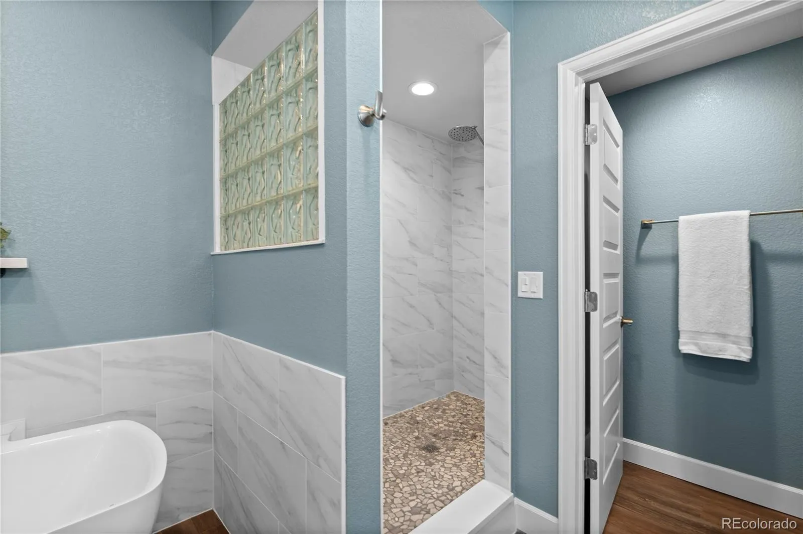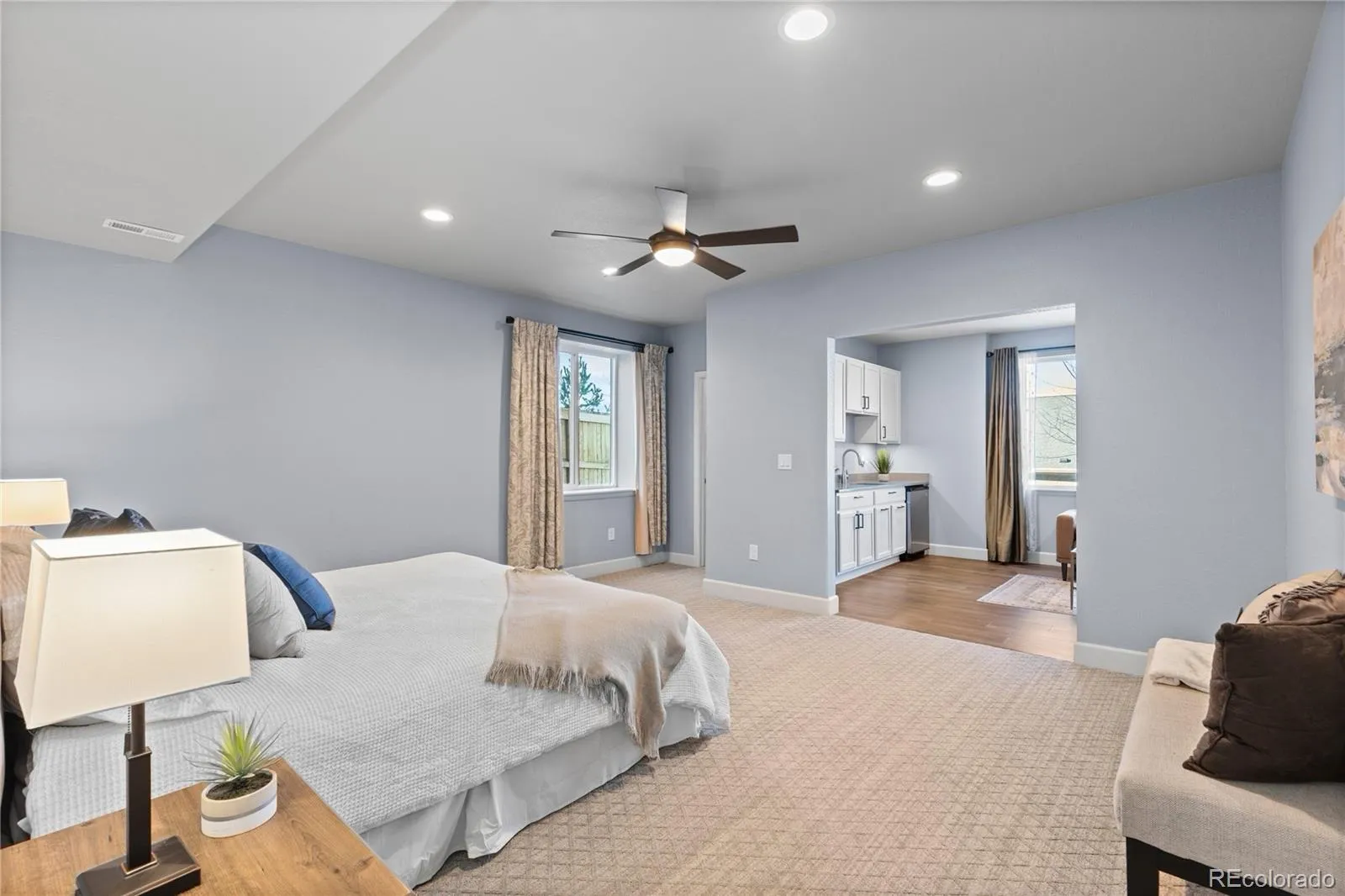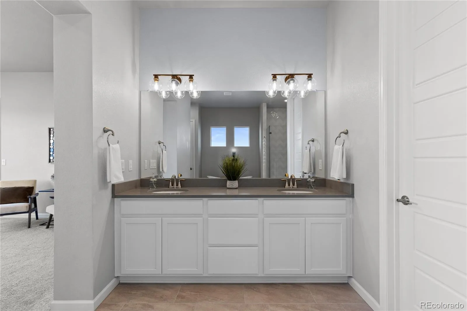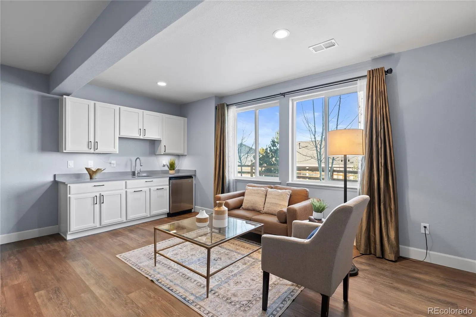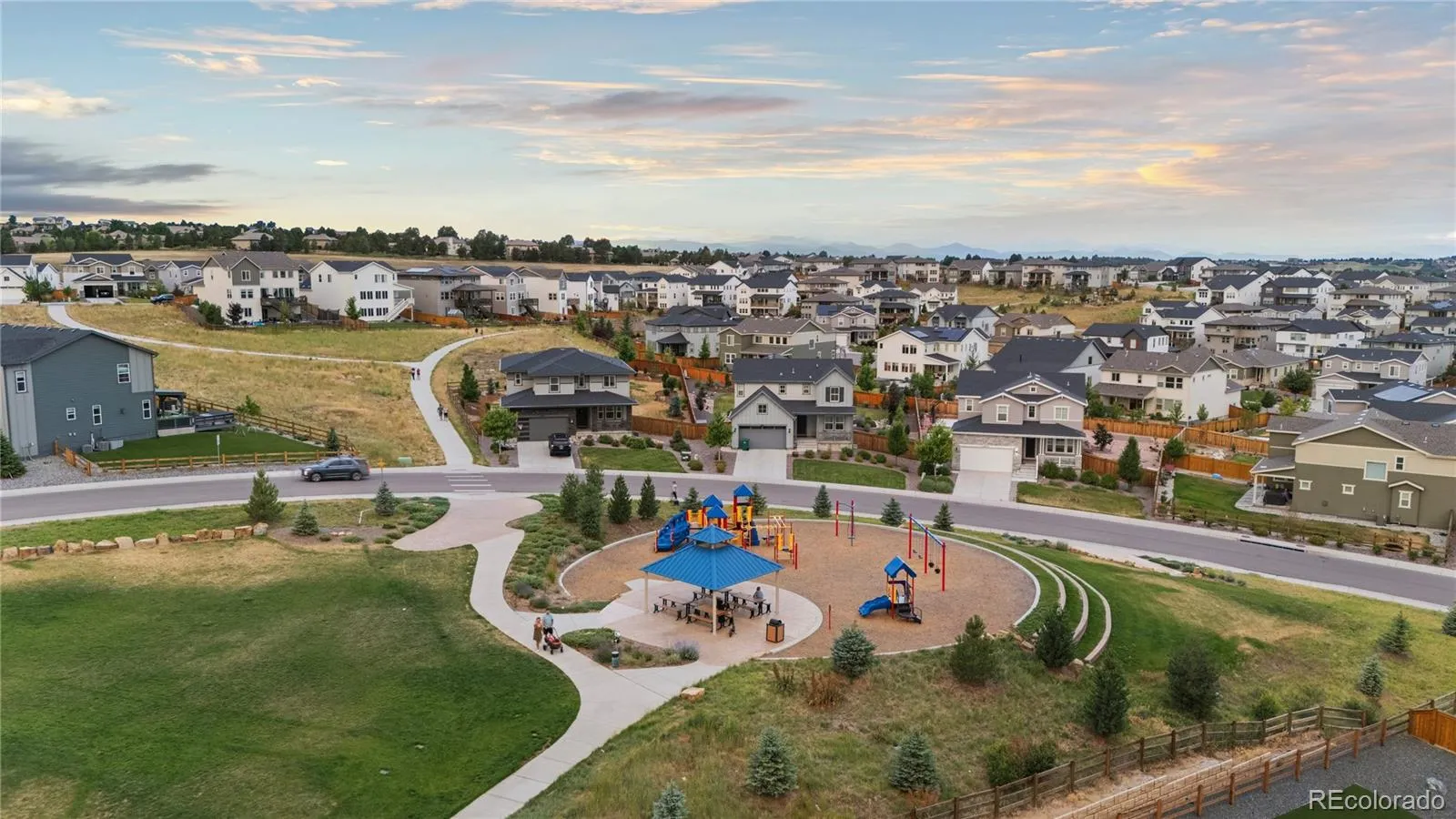 Meticulously crafted 6-bed, 5-bath, 5,687 sf residence — Main floor primary bedroom w/ spa-like bath, 3-car garage, private lower-level guest suite, & walking distance to nearby pocket park. New modern lighting in kitchen, dining room, and upper-level bathrooms. Built in 2021 & enhanced w/ fresh interior paint & updated flooring throughout, the wide-plank hardwood flooring and soaring 10′ ceilings. An expansive great room w/ a sleek gas fireplace & custom mantle. A chef’s kitchen boasts quartz countertops, oversized eat-in island, herringbone tile backsplash, 5-burner gas range, SS appliances, & huge walk-in pantry. Enjoy greenspace views from the dedicated dining area or outside on the covered deck overlooking professional landscaping w/ raised garden beds w/ built-in irrigation. Dedicated office/library space w/floor-to-ceiling bookshelves & French doors. Main-floor primary suite w/ access to covered deck & spa-inspired bath: dual sinks, quartz countertops, walk-in shower w/ glass surround, soaker tub, linen closet, walk-in closet. Two other beds on the main level each have walk-in closets & share a Jack-and-Jill bathroom w/ separate shower and toilet room. A mudroom leads to a spacious laundry room w/ utility sink & ample storage. Downstairs, the finished basement adds substantial living space: large living area, two bright bedrooms, a full bath, & a fully private guest suite. This suite features its own living room, kitchenette, oversized bedroom, dual walk-in closets w/ custom built-ins, and spa-style bath w/ granite countertops, jetted soaker tub, walk-in shower, & private water closet. A walk-out basement leads to covered patio & extended flagstone patio for multi-season outdoor living. Bonus: A massive walk-in storage room offers rare flexibility — easily convertible into a rec room, workshop, or fitness studio. Close to neighborhood shops & amenities, as well as access to I-25 for reaching DTC, Castle Rock and its many shops, restaurants, & more!