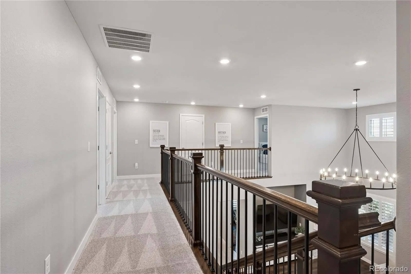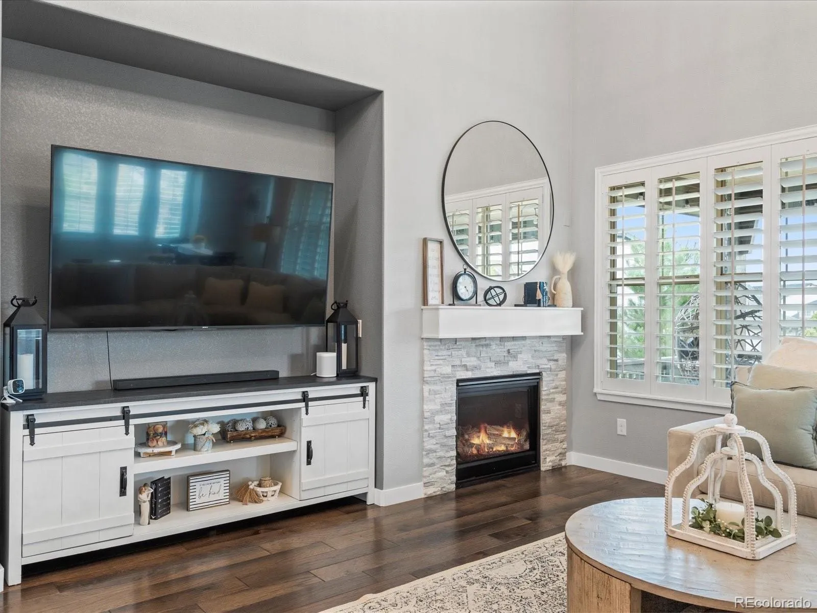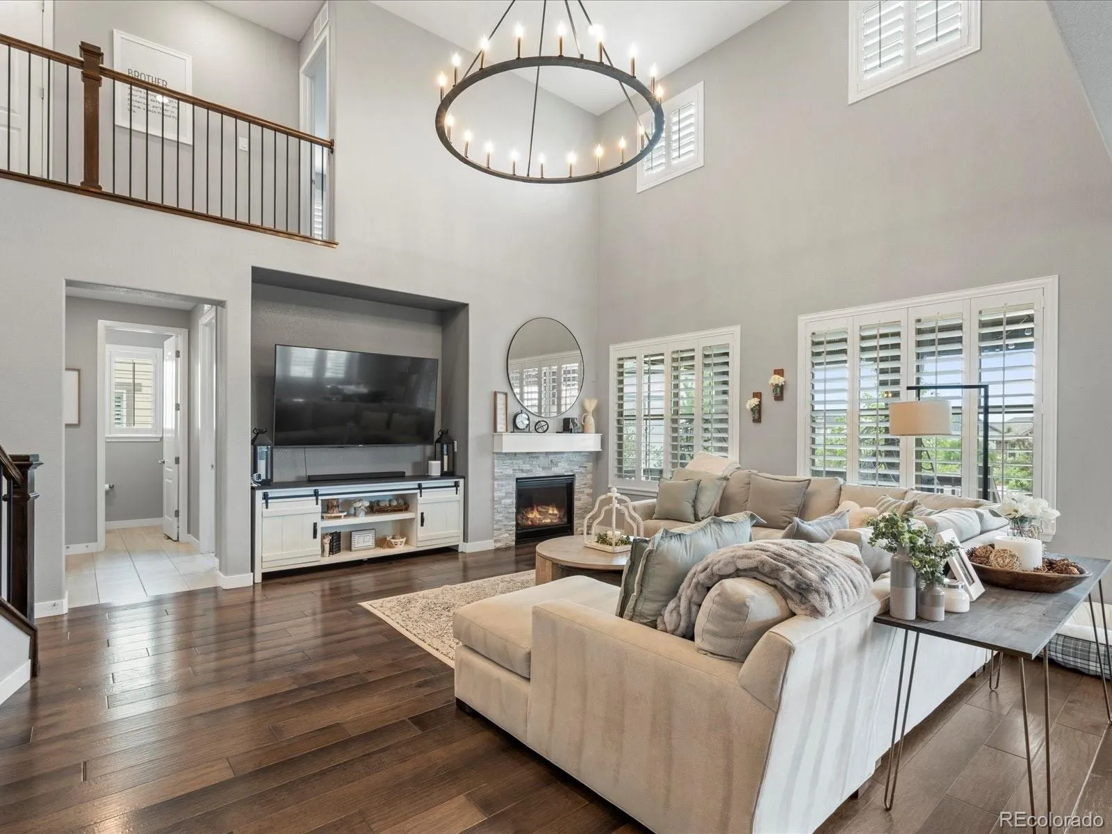 Discover a thoughtfully designed interior that boasts a two-story living room with upgraded designer lighting and plantation shutters throughout. The gourmet kitchen is a chef’s dream, featuring a brand new oversized white quartz island, stainless steel appliances, double ovens, and a spacious walk-in pantry. A formal dining room, complete with a built-in butler’s pantry, provides the perfect setting for entertaining.