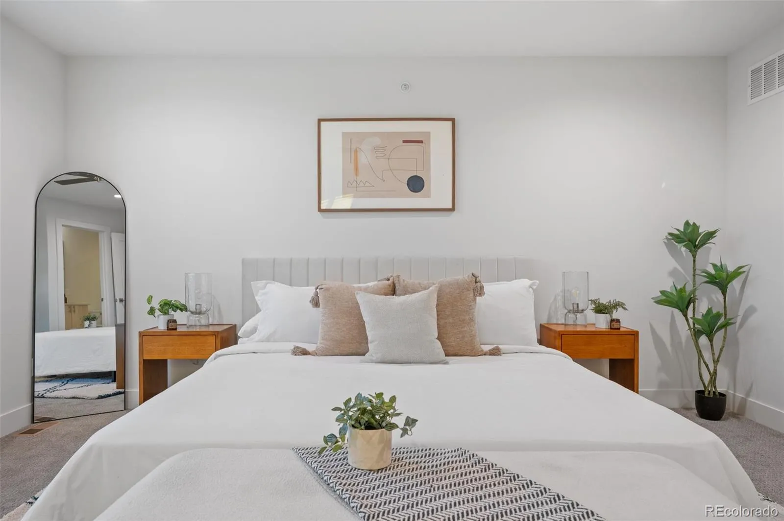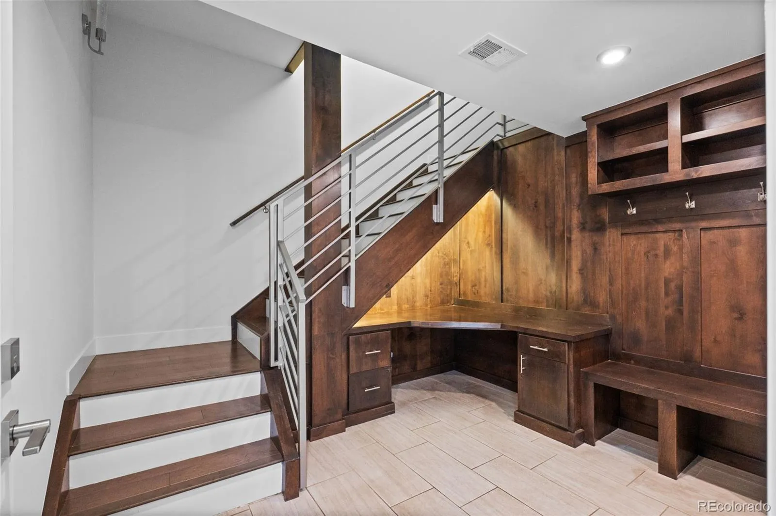 Upstairs, two bedrooms and two bathrooms provide well-designed separation of space, including a light-filled primary suite with contemporary finishes. The entry level includes built-ins and storage for jackets, gear, and everything that comes with Denver’s four-season lifestyle. Wood, tile, and carpet flooring add texture and function throughout the home.