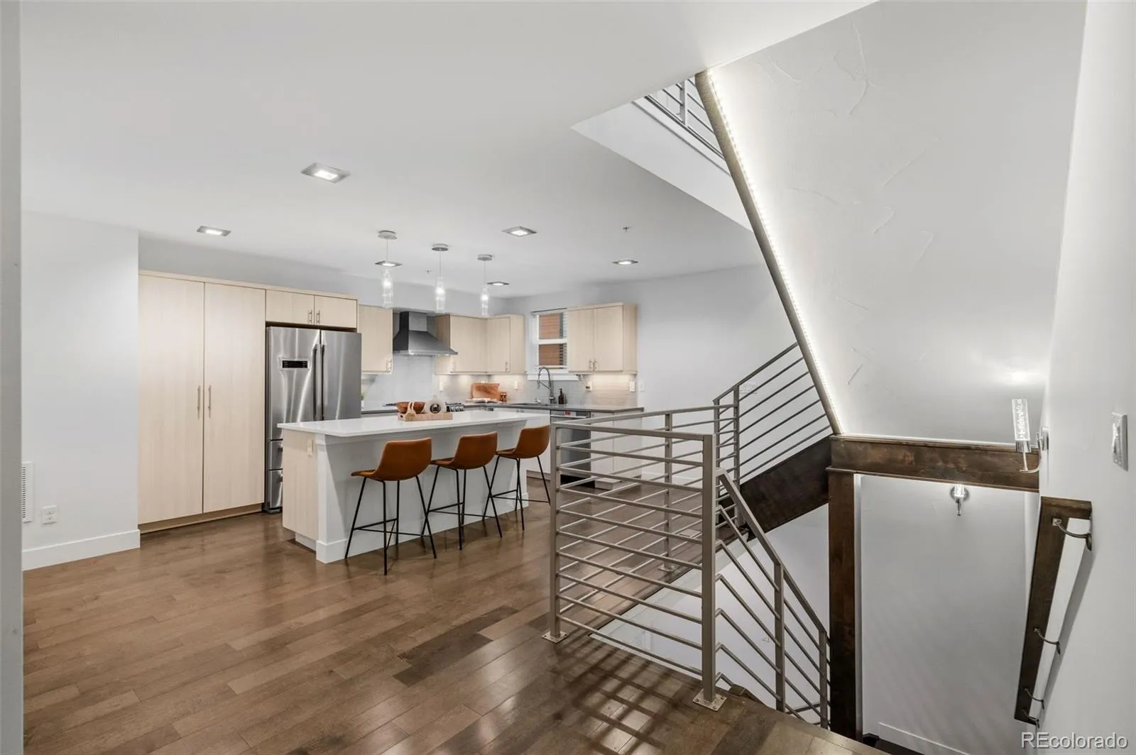 Located in the Sloan’s Lake neighborhood of Denver, this modern 2-bedroom, 2.5-bathroom townhome offers a bright open floor plan, contemporary finishes, and a private attached garage. The main level features a spacious kitchen with quartz countertops, a large island, stainless steel appliances, and a clean backsplash design. An electric fireplace and oversized windows add warmth and natural light throughout the living area.