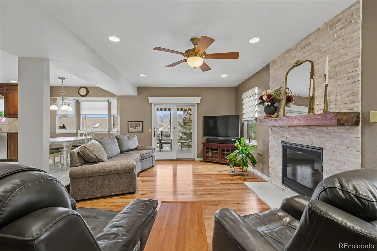 Hardwood flooring enhances the main level, where you’ll find a chef’s kitchen, formal dining room, two living rooms with an open and inviting layout. The kitchen is a true centerpiece, featuring upgraded cabinetry, a custom island, upgraded granite tile countertops, a tile backsplash, stainless steel appliances. The adjacent family room is anchored by an upgraded fireplace and filled with natural light. A large sliding glass door opens to a covered composite deck, perfect for relaxing or entertaining while enjoying Colorado’s outdoor lifestyle.