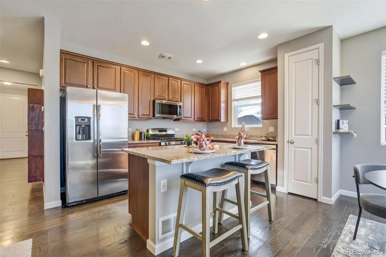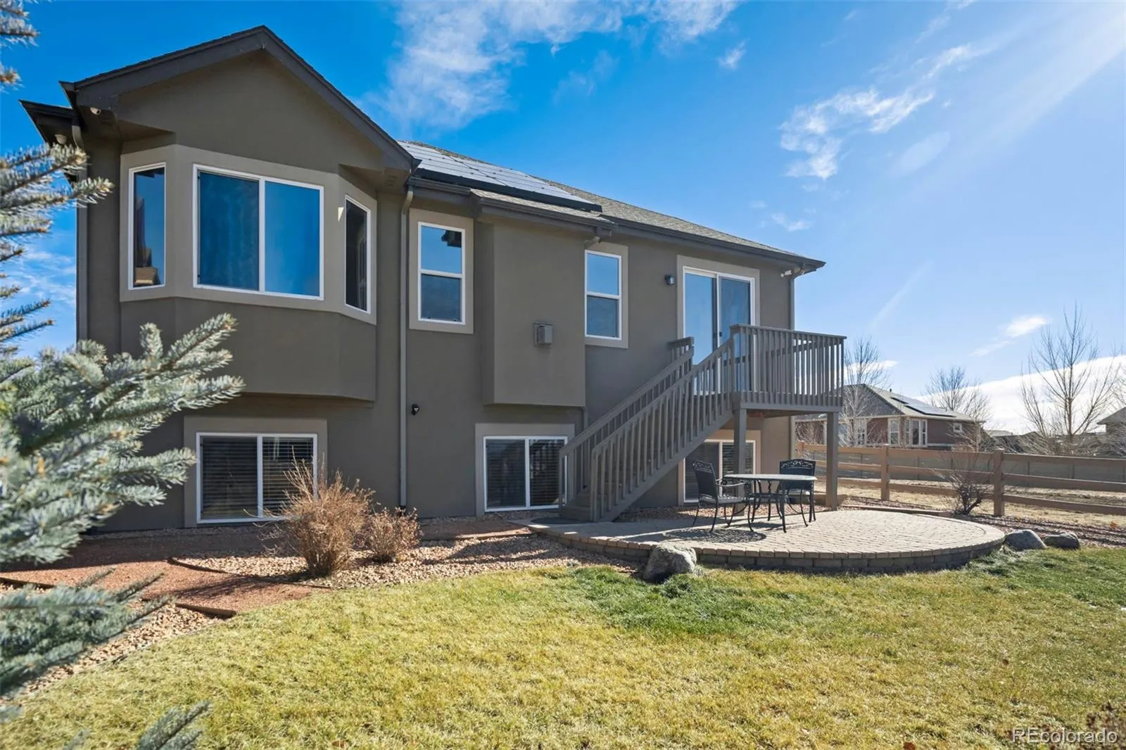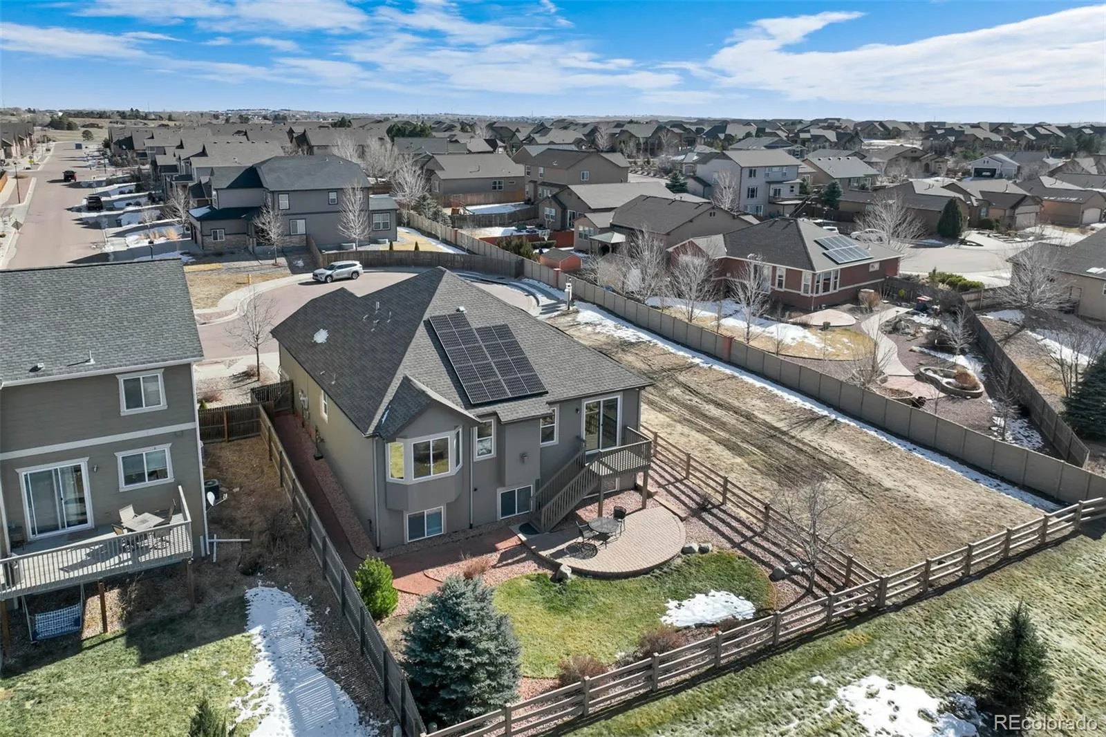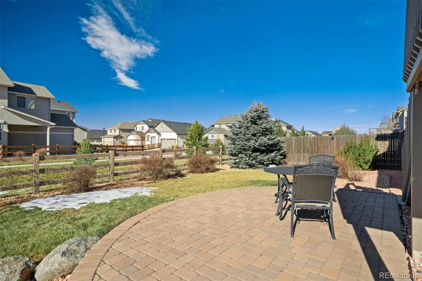 Ideally situated on a corner lot in the Reserve at Indigo Ranch, with majestic views of Pikes Peak & the mountain range, this thoughtfully designed ranch-style home pairs the comforts of modern living & entertaining with an exceptional setting offering serenity while just minutes from parks, shopping, dining & entertainment. The stucco and stone exterior is complemented by a covered front porch, creating a welcoming first impression. Inside natural light fills the main level, & durable plank flooring elevates the interior appeal. Awe-inspiring mountain views, also enjoyed from the dining area, great room, deck, & covered patio make the kitchen the anchor of everyday rhythm. Featuring granite countertops, abundant cabinetry, a pantry for smart storage & a central island with barstool seating, built-in storage, & power, this space is perfect for casual dining or entertaining. A window above the sink provides additional light to enhance the open feel. Stainless steel appliances & a gas stove complete this space. The dining area walks out to the deck, combining indoor-outdoor living. The great room is adorned by a gas fireplace with a stone surround, creating a warm & inviting gathering space. The main level includes a spacious primary en-suite with tray ceilings, bay windows, a generous walk-in closet, dual vanity & spacious walk-in shower & is just steps away from the main level laundry room (W/D included). On the opposite side of the main level are two additional bedrooms & a full bath. Downstairs, the expansive basement offers additional living space, a fourth bedroom, & a full bathroom, plus unfinished storage! Additional highlights include surround sound speakers, a built-in radon mitigation system, a Class 4 roof, & a solar panel array (owned). Outside, enjoy a covered paver patio, a fully fenced yard with concrete split-rail fencing, & rare open space along the side & back of the property, enhancing privacy & views! New Year…New Owner, & that should be you!