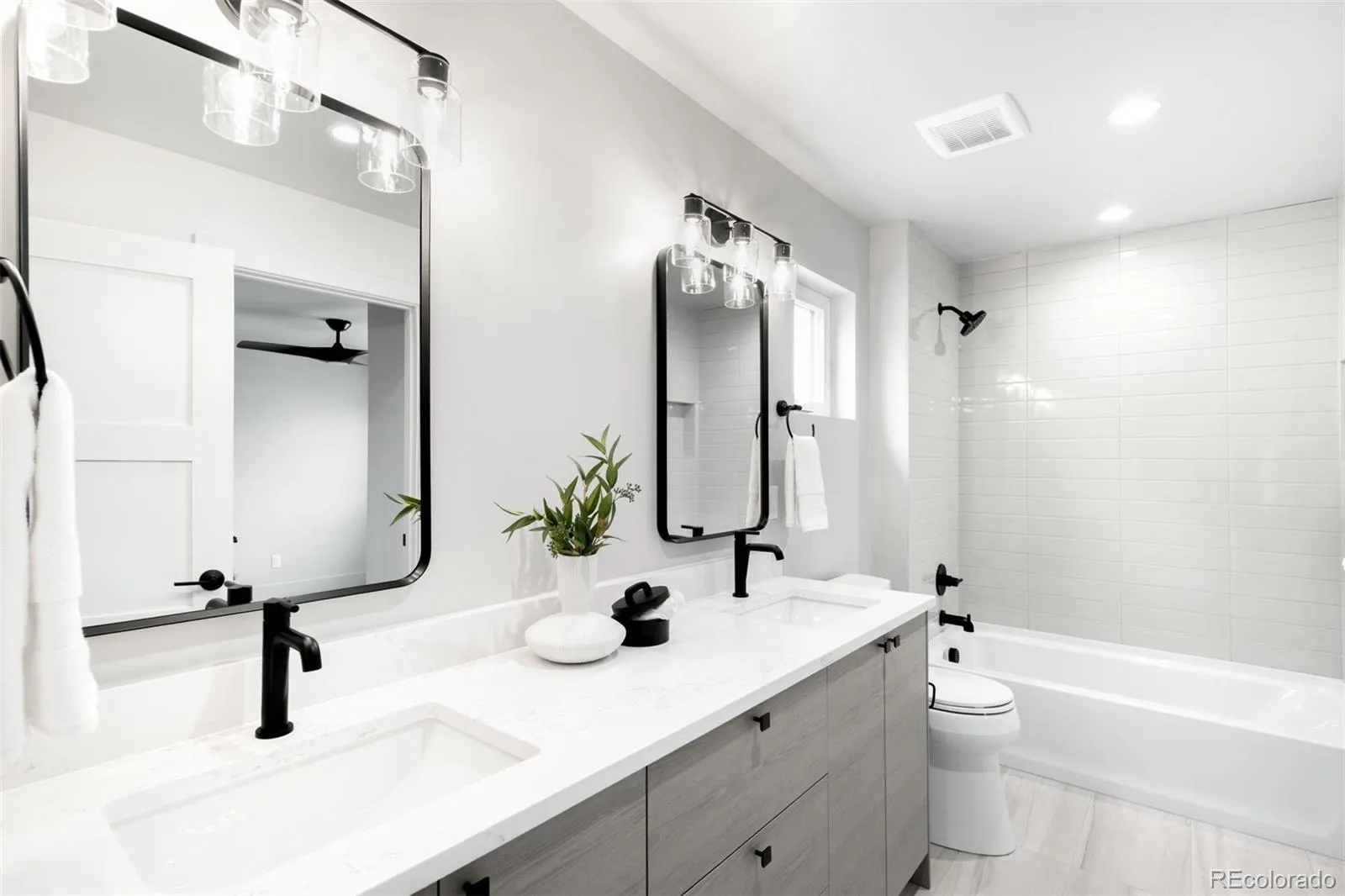 Designed and built by MAG Builders, this striking new construction duplex is ideally located in the heart of Sloan’s Lake and thoughtfully crafted to balance modern design with effortless livability. Warm finishes, abundant natural light, and a smart multi-level layout create a home that feels both elevated and inviting. The open main level is anchored by wide-plank European white oak flooring and a beautifully appointed eat-in kitchen featuring KitchenAid stainless steel appliances, Pental Quartz countertops, and an expansive island ideal for gathering. The living room centers around a gas fireplace with a Montalcino Acadia Gray surround, and flows seamlessly through oversized sliding doors to a private backyard and patio, creating a true indoor-outdoor connection. A dedicated dining area and stylish powder bath complete the main floor. The second level offers a serene primary suite with a spa-inspired bath, oversized walk-in shower, and a generous walk-in closet. Two additional bedrooms share a thoughtfully designed Jack-and-Jill bath, while a conveniently located laundry room adds everyday ease. The third-floor loft provides a flexible hangout or work-from-home space with a wet bar, powder bath, and direct access to the rooftop deck, perfect for entertaining. The finished basement expands the home’s versatility with a spacious recreation room, private guest bedroom, and full bath, offering ideal accommodations for visitors or extended stays. A detached two-car garage provides secure parking and additional storage. Just moments from Sloan’s Lake, this home places you at the center of one of Denver’s most vibrant neighborhoods, with easy access to trails, dining, shopping, and entertainment, all while enjoying the comfort and style of a thoughtfully designed new build.