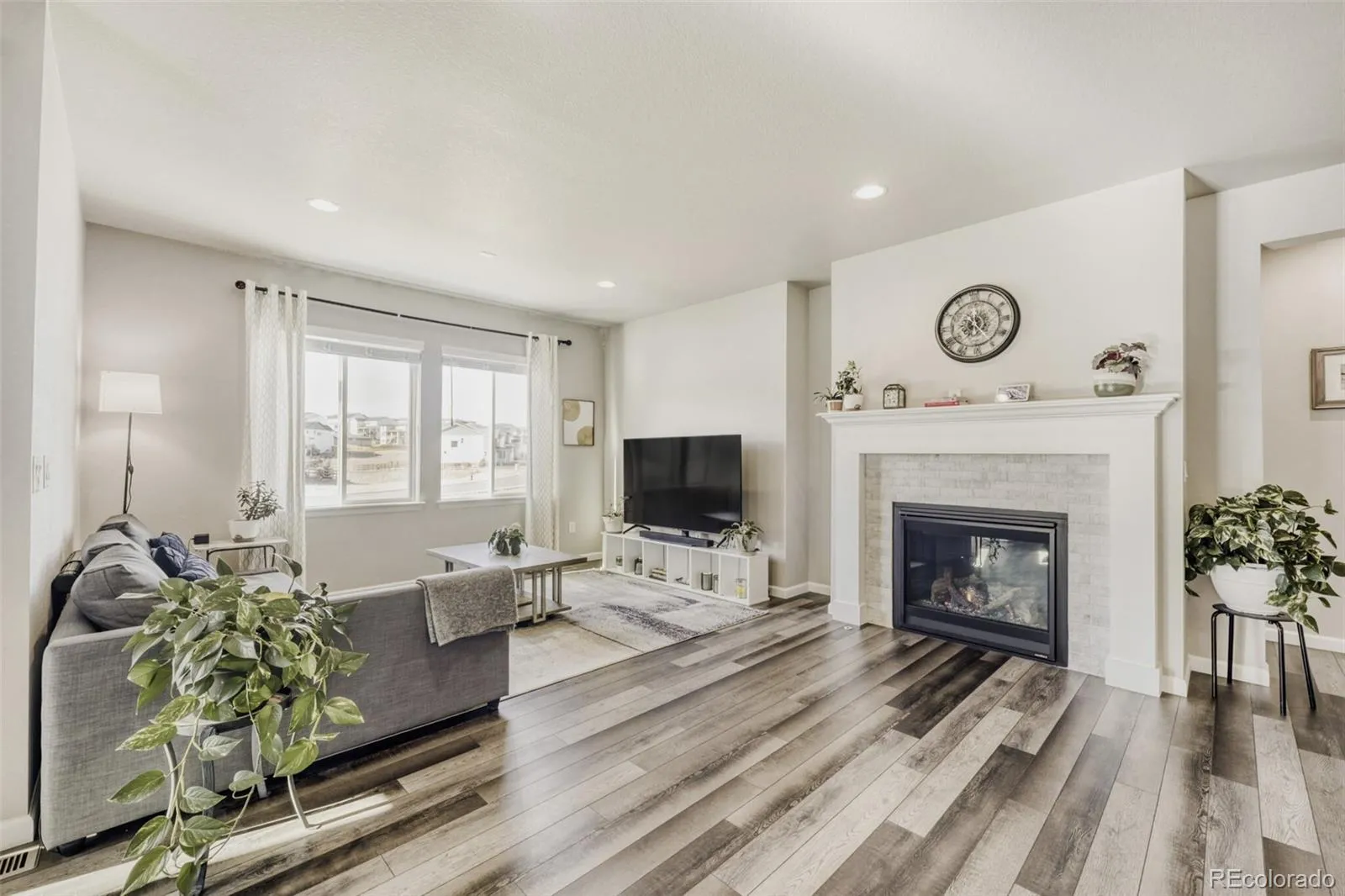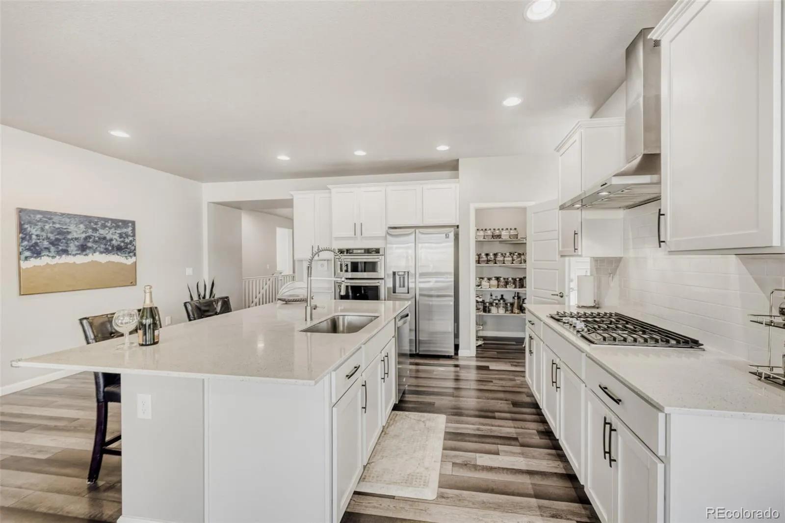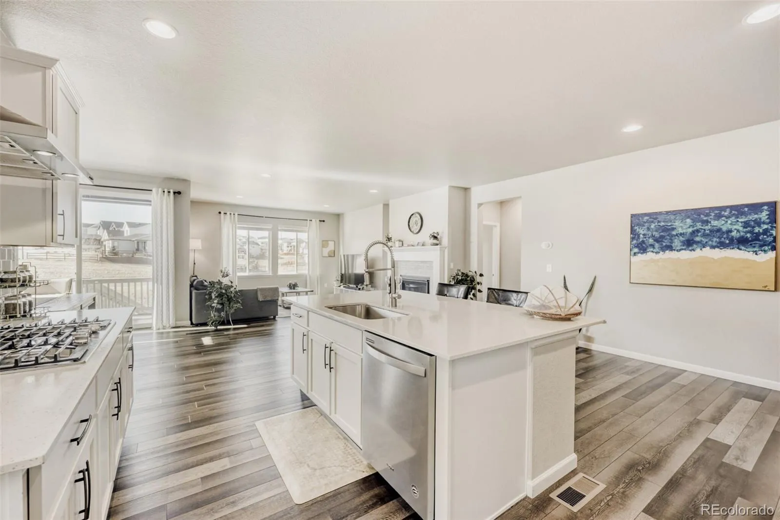 The chef’s kitchen features crisp white cabinetry, quartz countertops, stainless steel appliances—including a gas cooktop and range hood—and a large center island perfect for gathering and entertaining. The spacious family room is anchored by a cozy fireplace, creating an inviting space to relax.