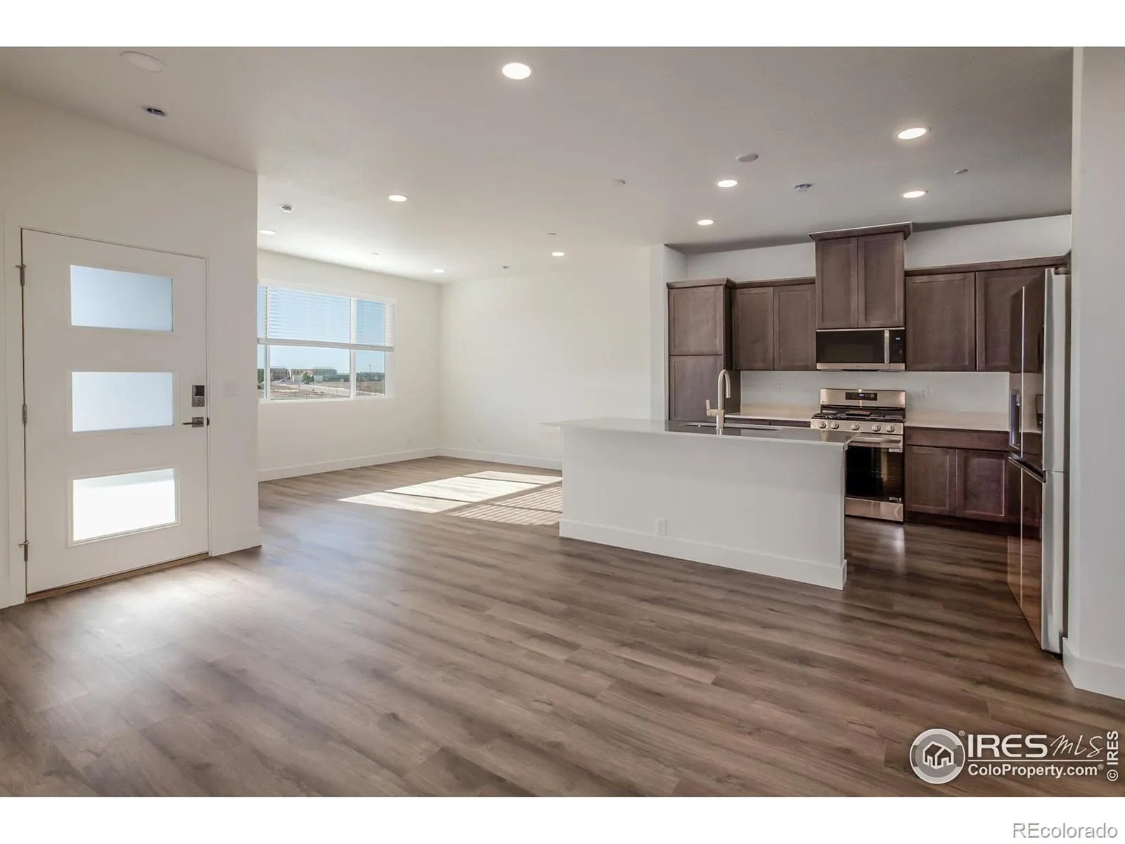 Welcome to the Telluride floorplan by Hartford Homes, a thoughtfully designed townhome offering a modern, open-concept main level and a private fenced courtyard-perfect for relaxing or entertaining. This middle-unit home features 3 bedrooms, 2.5 bathrooms, including a convenient powder bath on the main floor.The kitchen is beautifully appointed with stainless steel appliances, a gas range with vent hood, microwave, dishwasher, and refrigerator, complemented by “Smoke” stained maple cabinetry with crown molding and quartz countertops. Stylish vinyl plank flooring flows throughout the entry, kitchen, dining area, living room, bathrooms, and laundry space. All bedrooms are located on the upper level, along with a dedicated laundry room complete with washer and dryer for added convenience. Additional highlights include central A/C, a 2 car attached garage with keypad, and white faux wood window blinds. Residents enjoy access to an impressive lineup of community amenities, including a pool, pickleball courts, splash pad, dog park, and multiple neighborhood parks, offering something for every lifestyle. Ask about current lender incentives! Home is complete!