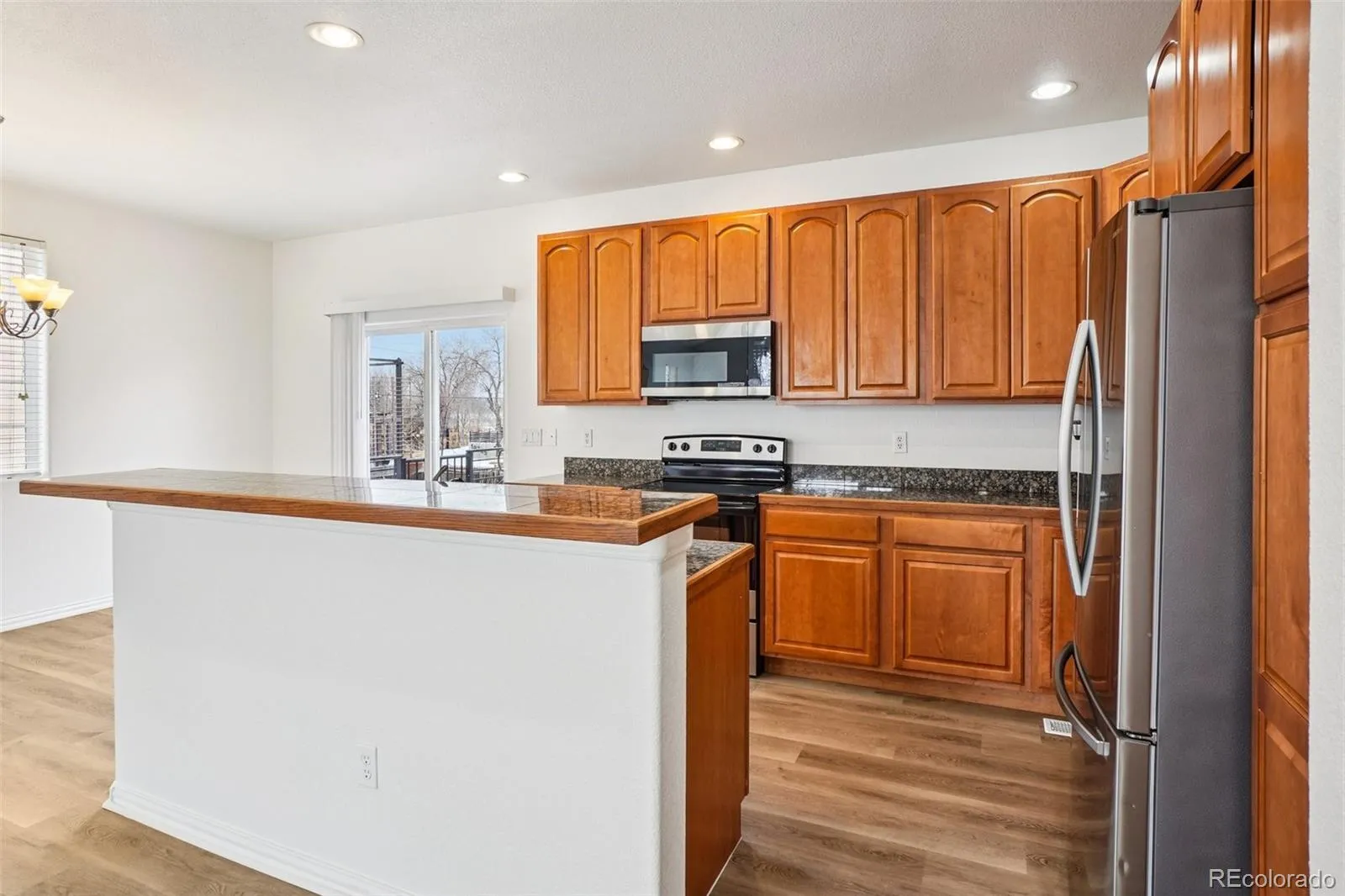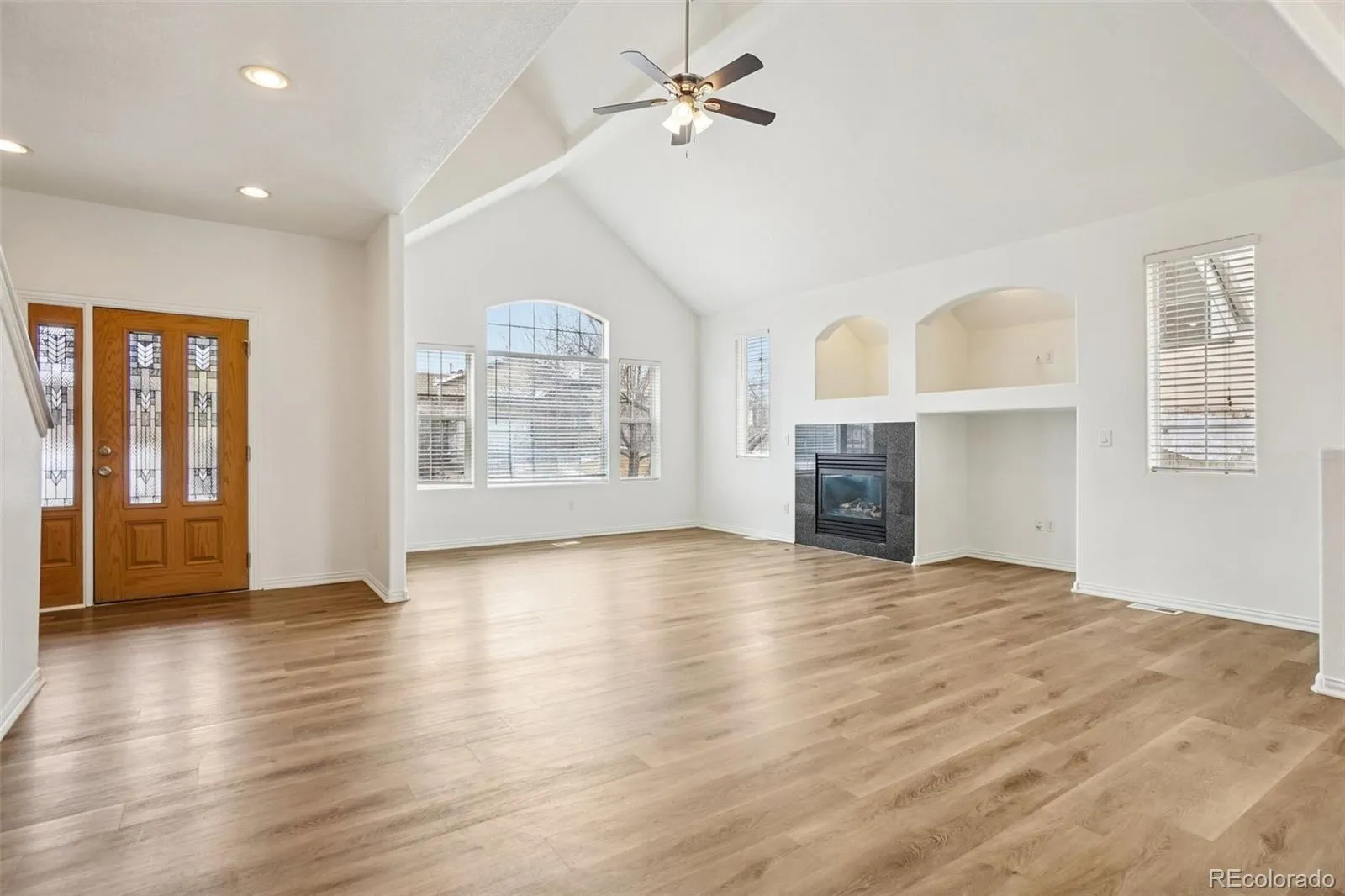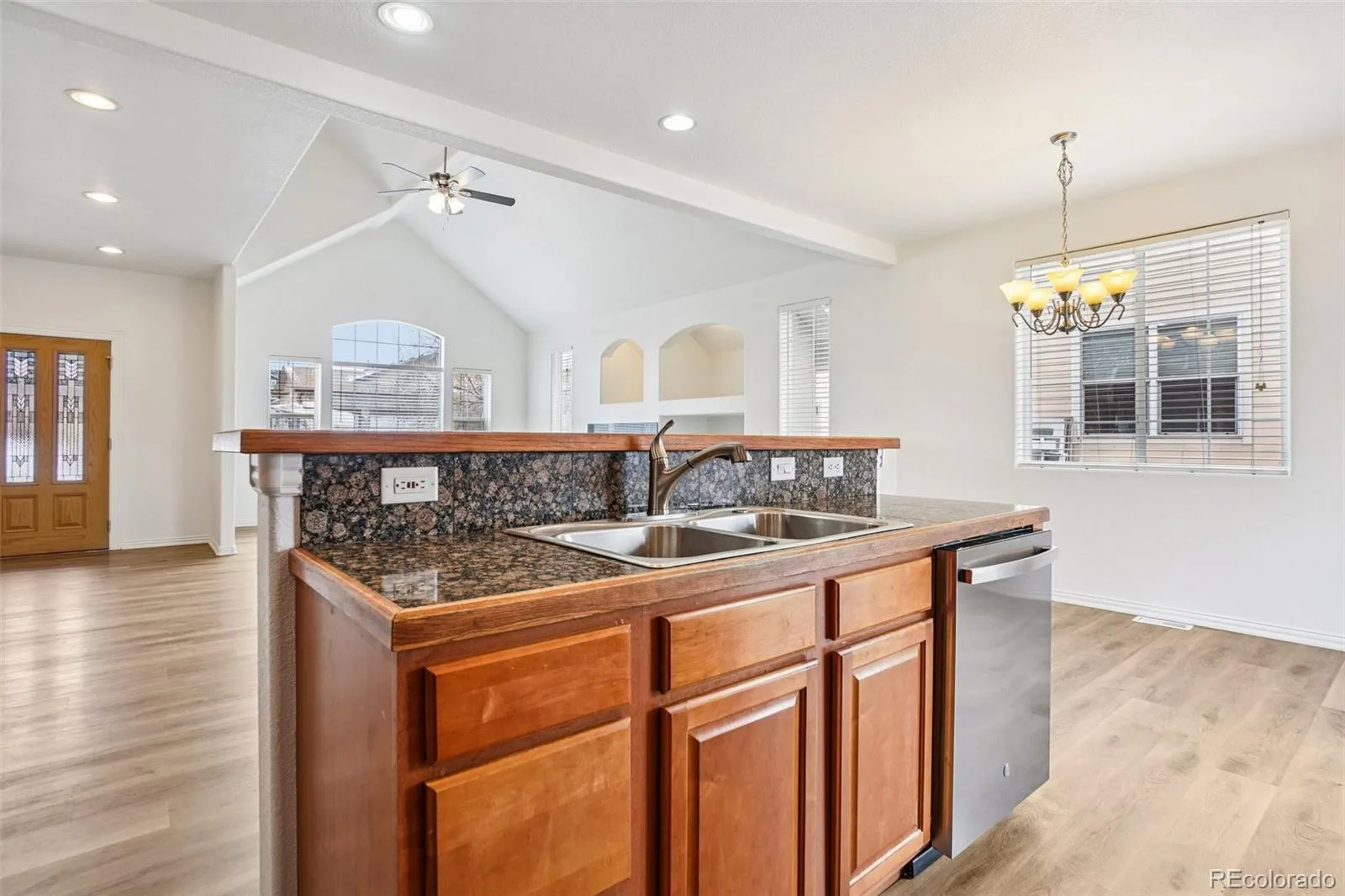 Upon entry, you’re welcomed by a bright, open floor plan with vaulted ceilings and expansive windows that flood the home with natural light. The kitchen features abundant cabinetry, stainless steel appliances, and an adjacent dining area—designed for both functionality and everyday living.