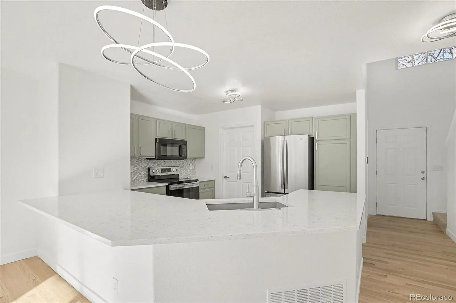 This stand-out, remodeled end-unit townhome backing to a greenbelt is truly a rare find! Situated on a cul-de-sac lot within the community, this home offers a larger backyard that backs up directly to the greenbelt—providing exceptional privacy, peaceful views, and a serene outdoor setting rarely found in townhome living. The unbeatable location is matched by an equally impressive interior. Step inside to a sun-filled, welcoming entry that opens into a spacious and open main-floor living area. The kitchen is a true focal point, featuring an expansive island ideal for prep and entertaining, quartz countertops, sage green cabinetry, stainless steel appliances, and a stylish backsplash. The kitchen flows effortlessly into the open living and dining spaces, creating a light and airy feel and offering seamless access to the private backyard, perfect for indoor/outdoor living. The main floor also includes a chic powder bathroom, a convenient laundry room, and direct access to the attached garage, adding both style and functionality. Upstairs, the bright and sunny staircase leads to two spacious bedrooms, each complete with its own en suite bathroom and walk-in closet, offering comfort and privacy. This updated and contemporary townhome truly stands out inside and out. Located right next to Grange Hall Creek Trail, you’ll enjoy direct access to Lambertson Lakes Park and miles of trails. Living in Thornton means embracing an active lifestyle with abundant parks and recreation, easy commuting, and a wide variety of shopping and dining options nearby. Well located, beautifully finished, and hard to find—this is the one that checks all the boxes.