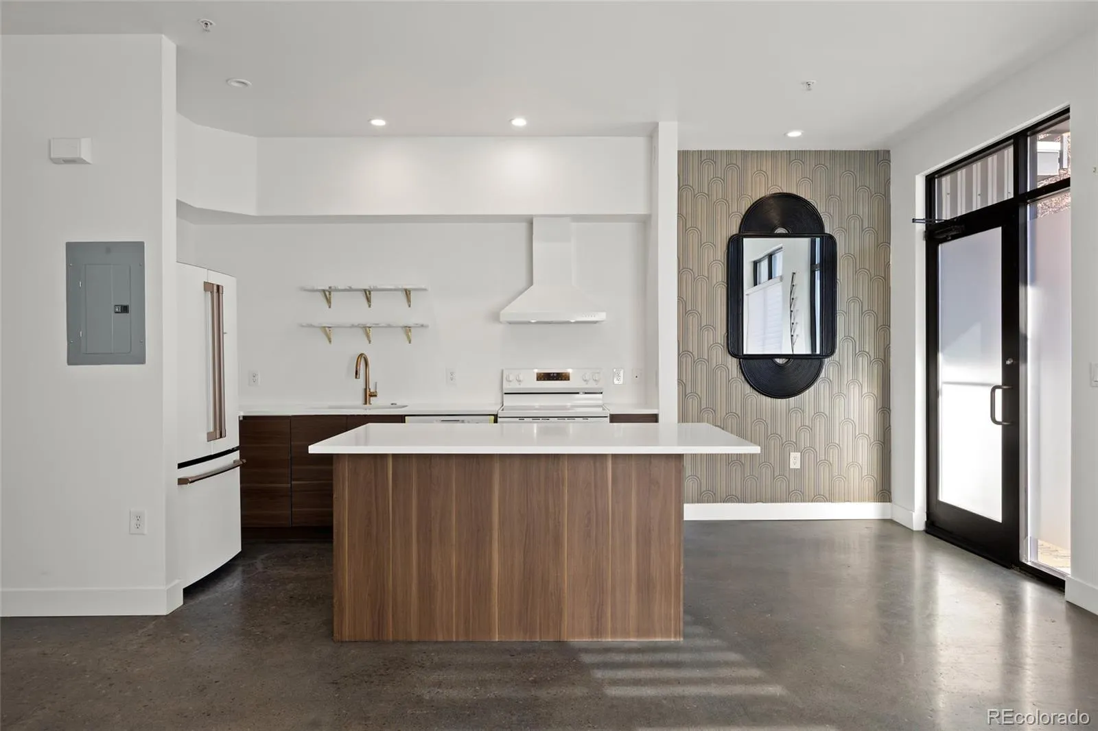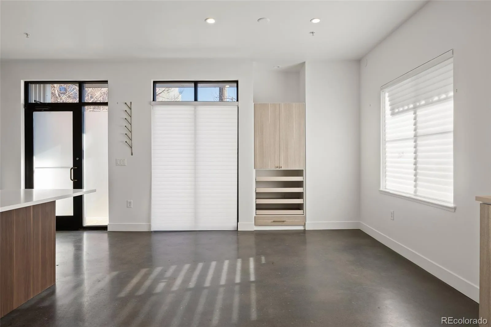 This beautifully remodeled corner/end-residence has been thoughtfully updated from top to bottom with modern, high-quality finishes throughout. Interior features include epoxy-stained concrete floors, smooth-finish walls and ceilings, custom kitchen cabinetry, a deep-basin sink with disposal, and GE Café smart refrigerator. The spa-like bathroom showcases a marble tile shower, updated vanity, designer lighting, and curated wallpaper accents. Custom built-ins by California Closets, a dedicated built-in desk, recessed lighting, and automated blinds enhance both functionality and style. Oversized windows flood the living area with abundant natural light, creating a bright and inviting atmosphere.