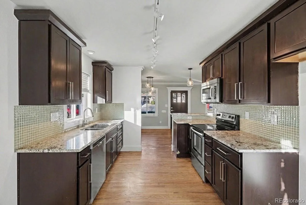 Don’t miss this gem in the popular Harvey Park neighborhood! This beautifully updated home is trendy, welcoming, and full of thoughtful touches, with statement fixtures and a layout that offers both style and functionality. With 5 bedrooms, generous living space, and a fully finished basement, this home provides plenty of room to fit your lifestyle. The main floor is bright and inviting, featuring an open living room and dining area that flow seamlessly into the kitchen—ideal for everyday living and entertaining. The kitchen is modern and functional, offering rich wood cabinetry, granite countertops, under-cabinet lighting, stainless steel appliances, and space for a cozy breakfast nook. Three bedrooms and an updated bathroom are located on the upper level, creating a comfortable and practical layout. The fully finished basement adds exceptional versatility, with a large recreation room perfect for movie nights, game tables, or a flexible bonus space. Two additional bedrooms and another beautiful bathroom complete the lower level, along with a well-sized laundry room and a utility room with ample storage. Outside, enjoy a covered patio and a spacious backyard that’s ready for entertaining, play, or relaxing evenings at home (backyard photos coming soon!). Located within walking distance to Harvey Park Lake and the Rec Center, this home offers easy access to trails, community activities, and neighborhood amenities. Stylish, functional, and well located—this Harvey Park home is a fantastic opportunity you won’t want to miss.