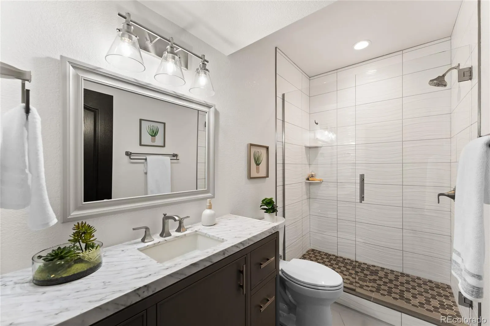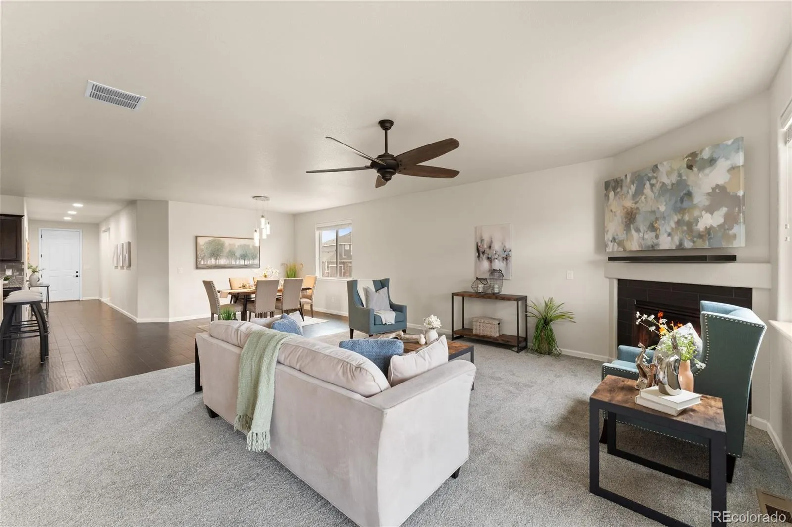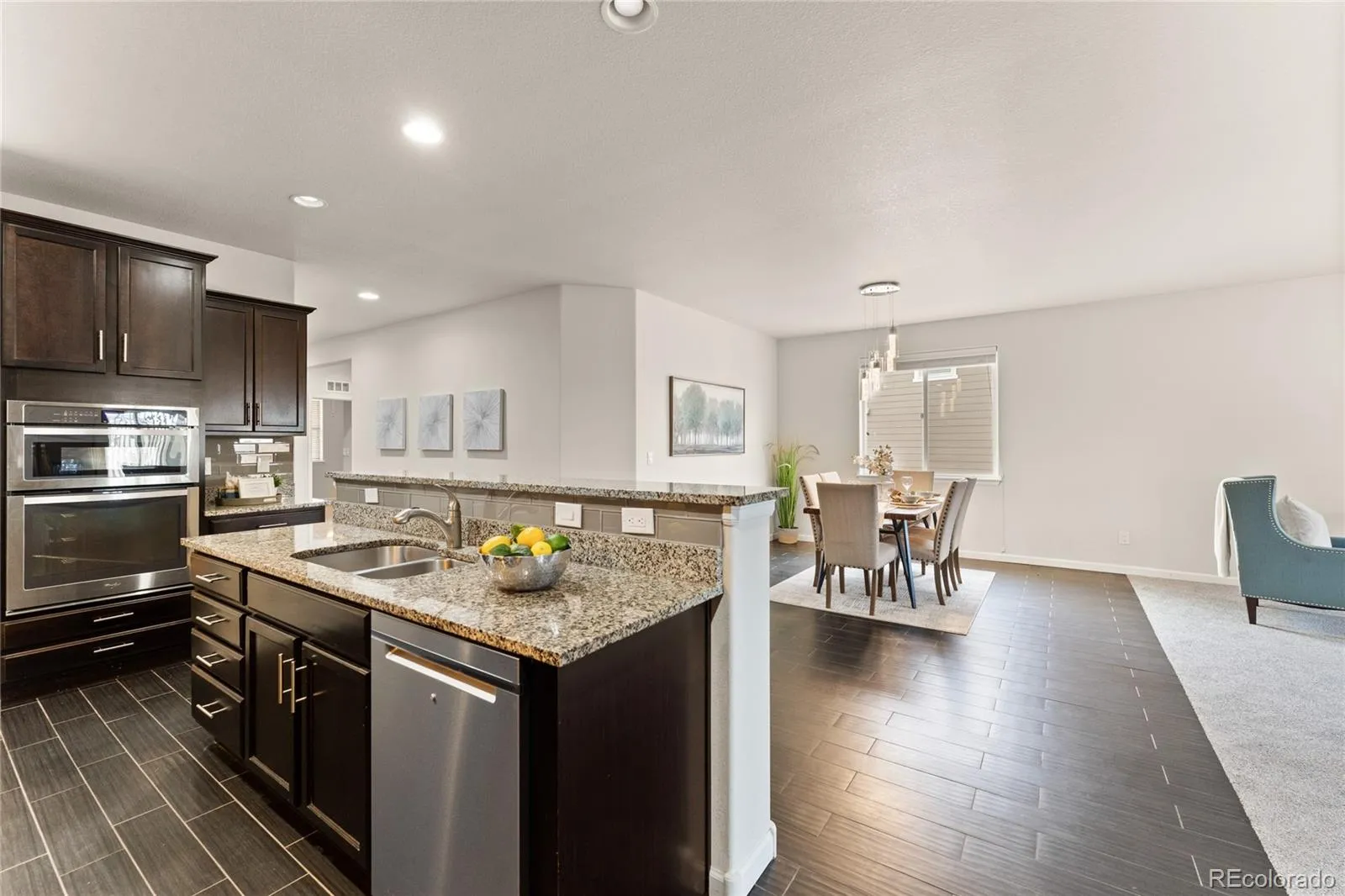 Tucked into the quiet golf course community of Spring Valley Ranch in Elizabeth, 5509 Harbor Town Dr is one of the very few ranch style homes with a fully finished basement and a three-car garage! When you enter, you’ll be greeted by warm, wood-look ceramic tile floors, and brand new carpet, both spreading across the main level in exactly the places you’d want them, and providing a beautiful contrast of color that gives this home a welcoming atmosphere. The kitchen has rich espresso colored cabinets, a sleek grey glass tile backsplash, and a brighter granite that beautifully ties in the colors of the home, and provides a pop of contrast to make the kitchen visually exciting! The stainless steel appliances, gas cooktop, coffee bar, and bar seating will make this kitchen the central hub where everybody WANTS to hang out! The primary suite has an en-suite bathroom with granite counters, a standup shower with oiled bronze surrounds, a soaking tub, and a generously sized walk-in closet. And off the 3-car garage is the laundry room, meaning this home can truly be used for main-level-living. Head downstairs, and you’ll find an absolutely CAVERNOUS finished basement! The family room is legitimately massive, and your imagination is your only limit down here. Game room, movie theater, golf simulator…there is SO MUCH ROOM FOR ACTIVITIES! There’s also another bedroom and modern bathroom, making this space perfect for older kids, or even a multi-generational living situation. The Spring Valley Golf Club is an absolute hidden gem! With 18 challenging holes of golf, and an incredible clubhouse with a great restaurant and a friendly atmosphere, this is the ideal neighborhood for somebody who wants to live in a golf course community, and be away from the hustle and bustle of a bigger city, but without being in the middle of nowhere. Come take a look today!