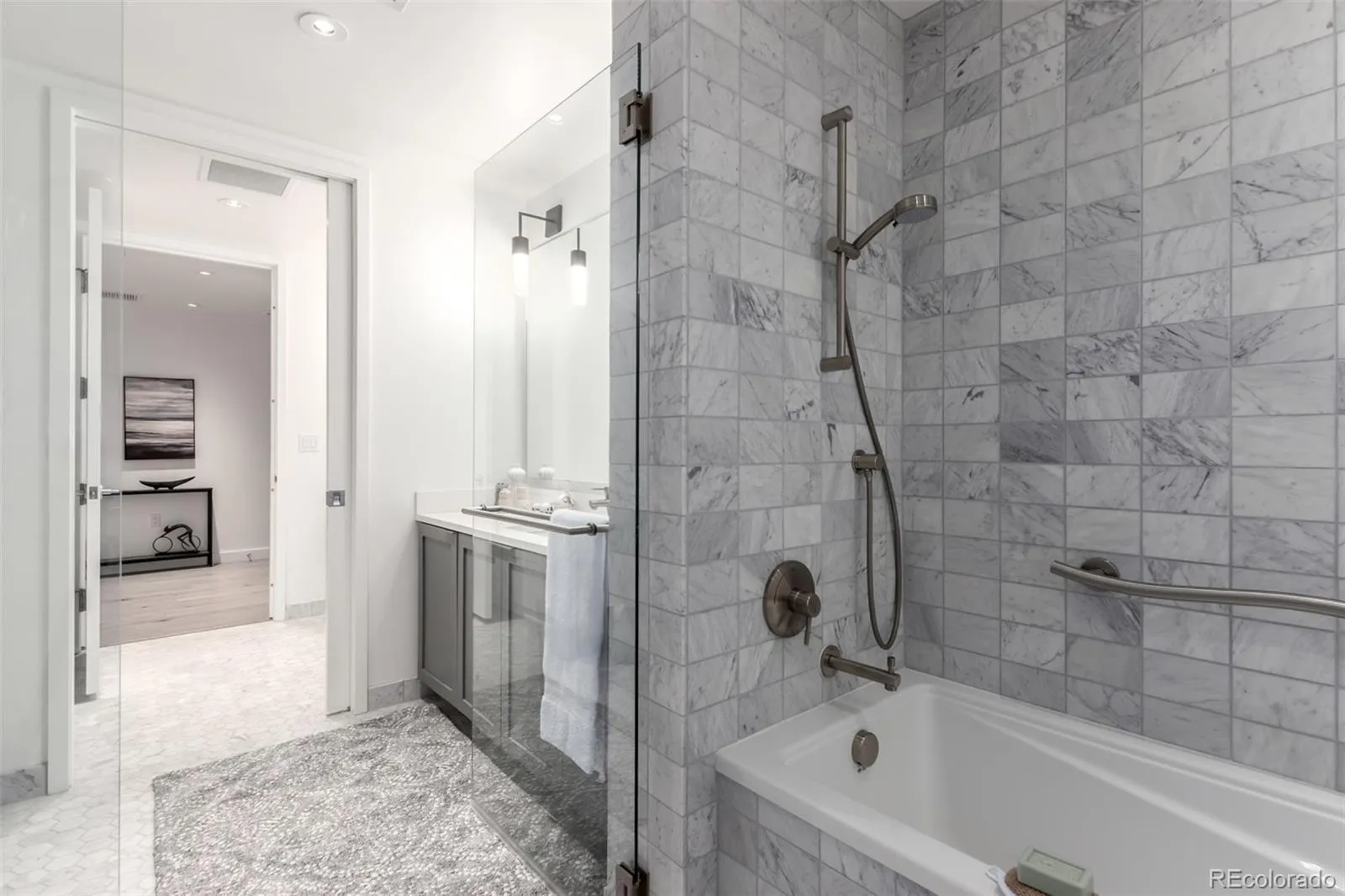 Perched high above the pulse of downtown Denver, this sophisticated one-bedroom condo at The Coloradan redefines modern city living. The unobstructed sparkling views of downtown Denver & Union Station are outstanding. Just under 1,000 square feet, open layout and natural light with a wall of windows, wood flooring and electric window shades. The contemporary kitchen design has modern cabinetry, Quartz Counters, Bosch stainless appliances- gas five-burner cooktop, convection oven, wall microware and dishwasher and a kitchen desk. French doors open to the bedroom with a large organized custom closet & stackable washer/dryer. The spa inspired bathroom is a combo powder room connects to a luxurious wet room with both a soaking tub and shower combination. There is good storage with a large utility room, entry closet, built-in curio shelving to show your fun collectables and a long entry hallway great for artwork display. Living the Coloradan lifestyle allows you to enjoy all the building amenities, including a rooftop pool & hot tub, a BBQ area and a clubroom with sitting areas, pool table & shuffleboard showcasing the breathtaking views in every direction. The building has a 24/7 front desk, business center, garden area, full gym and bike storage. The Coloradan’s prime location with the “A Train” transit to Denver International Airport right outside of the building and Whole Food’s across the street make it a great place to live. Just outside of the building is all of the services you need for urban living. One block south is the free transit line that provides access down the 16th Street business corridor. Union Station, Coors Field, MacGregor Square, Riverfront Park are all just blocks away. Garage parking is not included and is available monthly for rent from www.townepark.com