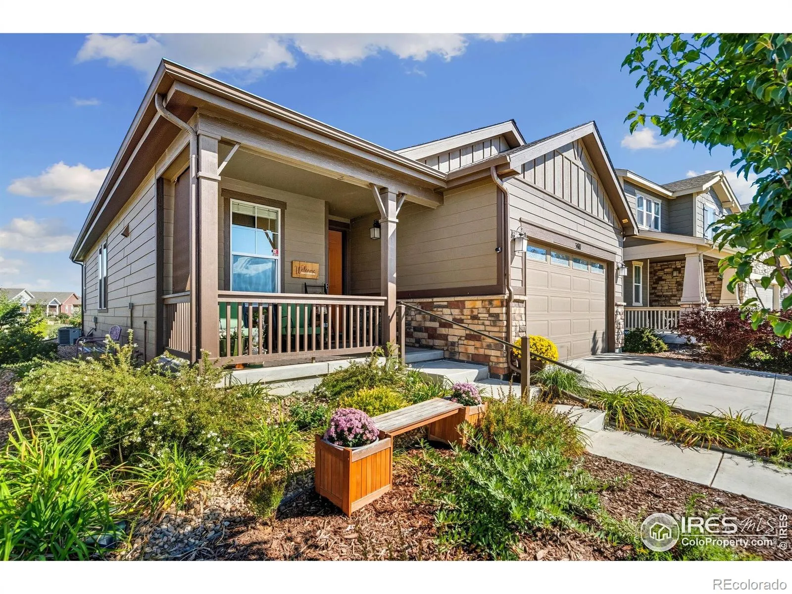 Nature right at your back door! This beautifully maintained single-level home backs to open space and sits just a stone’s throw from Houts Reservoir, offering a serene living environment with abundant outdoor activities right at your doorstep. Located in Loveland’s Lakes at Centerra neighborhood-Colorado’s only Certified Community Wildlife Habitat, you’ll enjoy hundreds of acres of open water for kayaking and fishing, along with miles of scenic trails for bird watching and tranquil walks. Inside, the 3-bedroom, 2-bath layout is open and inviting, enhanced by higher ceilings, oversized doors, and ADA-compliant spaces that provide both comfort and accessibility. The upgraded kitchen package features stainless steel appliances, gleaming granite countertops, a convenient pantry, and a breakfast bar with seating for casual dining or entertaining guests. The primary suite includes its own ensuite bathroom that has a wider door opening. Step outside to the landscaped backyard, where you’ll find a concrete patio equipped with a remote-controlled sunsetter awning, perfect for enjoying the outdoors in comfort. The raised garden beds provide an opportunity for gardening enthusiasts to cultivate their own plants. The extended 2-car garage not only fits vehicles with ease but also provides additional storage space for gear, tools, or hobbies. Perfectly situated, this home offers peaceful surroundings while keeping you close to shopping, dining, and Loveland’s best amenities, all within Centerra’s beautiful setting.