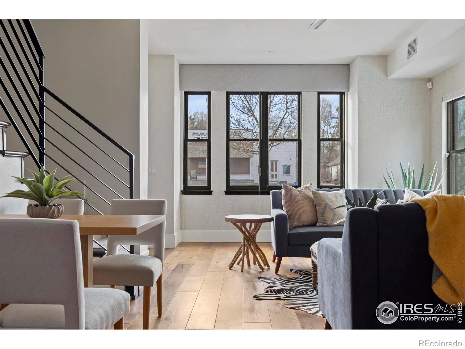Sophistication meets convenience in this stunning two-story end-unit condo at 302 N Meldrum St #103, nestled in the heart of vibrant Old Town Fort Collins, in a quiet neighborhood. With a private entrance, no upstairs neighbors, and high-end finishes throughout, this home offers the perfect blend of modern elegance and thoughtful design.Step inside to a welcoming foyer, complete with a built-in drop-zone and clever overhead storage. The main level boasts 10-foot ceilings and warm hardwood floors, creating an airy, open atmosphere. Natural light pours through expansive Sierra Pacific windows, highlighting the impeccable craftsmanship, from Emtek hardware to custom light fixtures and high-end plumbing details. Designed with STC-60 sound engineering, you’ll enjoy peace and quiet even in the city’s lively core.The chef’s kitchen is a masterpiece, featuring Tischlerei cabinetry, a spacious island with double-thick quartz countertops, and concealed under-island storage. Top-of-the-line stainless steel appliances include a gas range, refrigerator, range hood, microwave, and dishwasher-everything you need to entertain with ease. Adjacent, an oversized living room accommodates a large sectional or dual sofa. Upstairs, a large bedroom suite has windows on two sides and has room to accommodate a king bed set, office or sitting area. With premium carpet and padding, the space is designed for relaxation and comfort. An attached walk-in closet ensures all your wardrobe needs are met and a primary suite bathroom with stall shower and custom tile work rounds out the convenience of the condo. This home also comes with secure parking in a deeded garage space, reservable storage lockers, bike racks, and elevator access to all levels. The secure lobby features key-fob/intercom entry and package delivery services for added convenience.