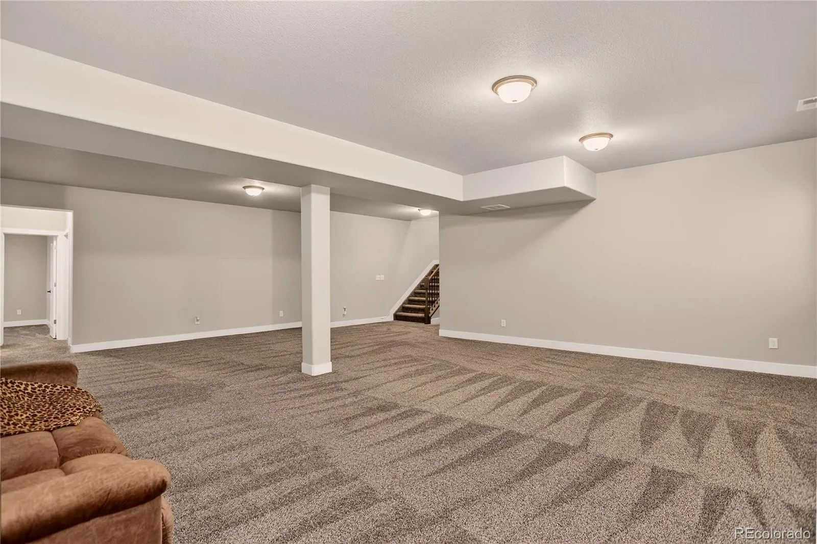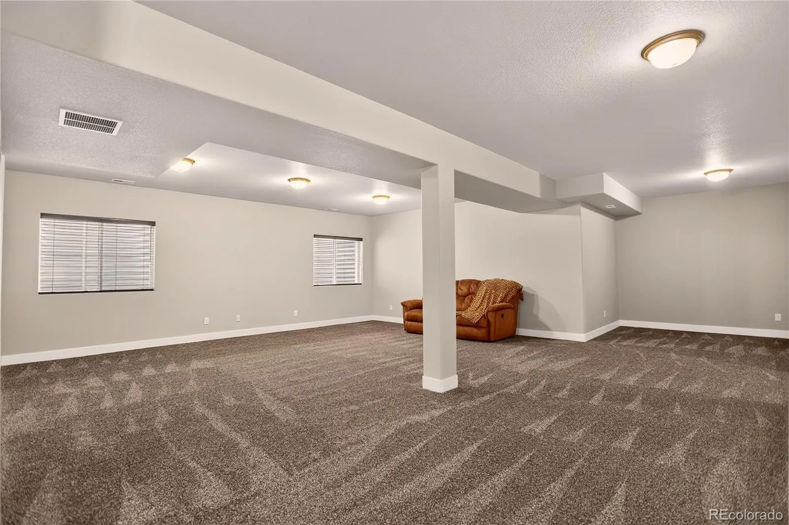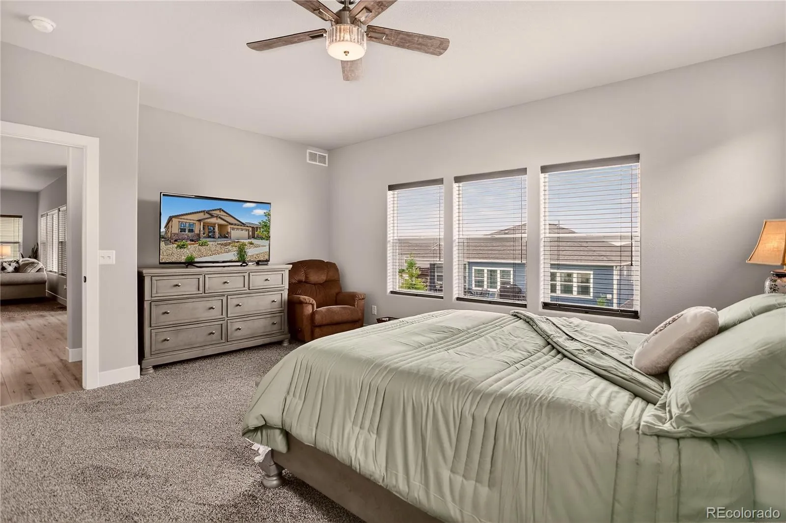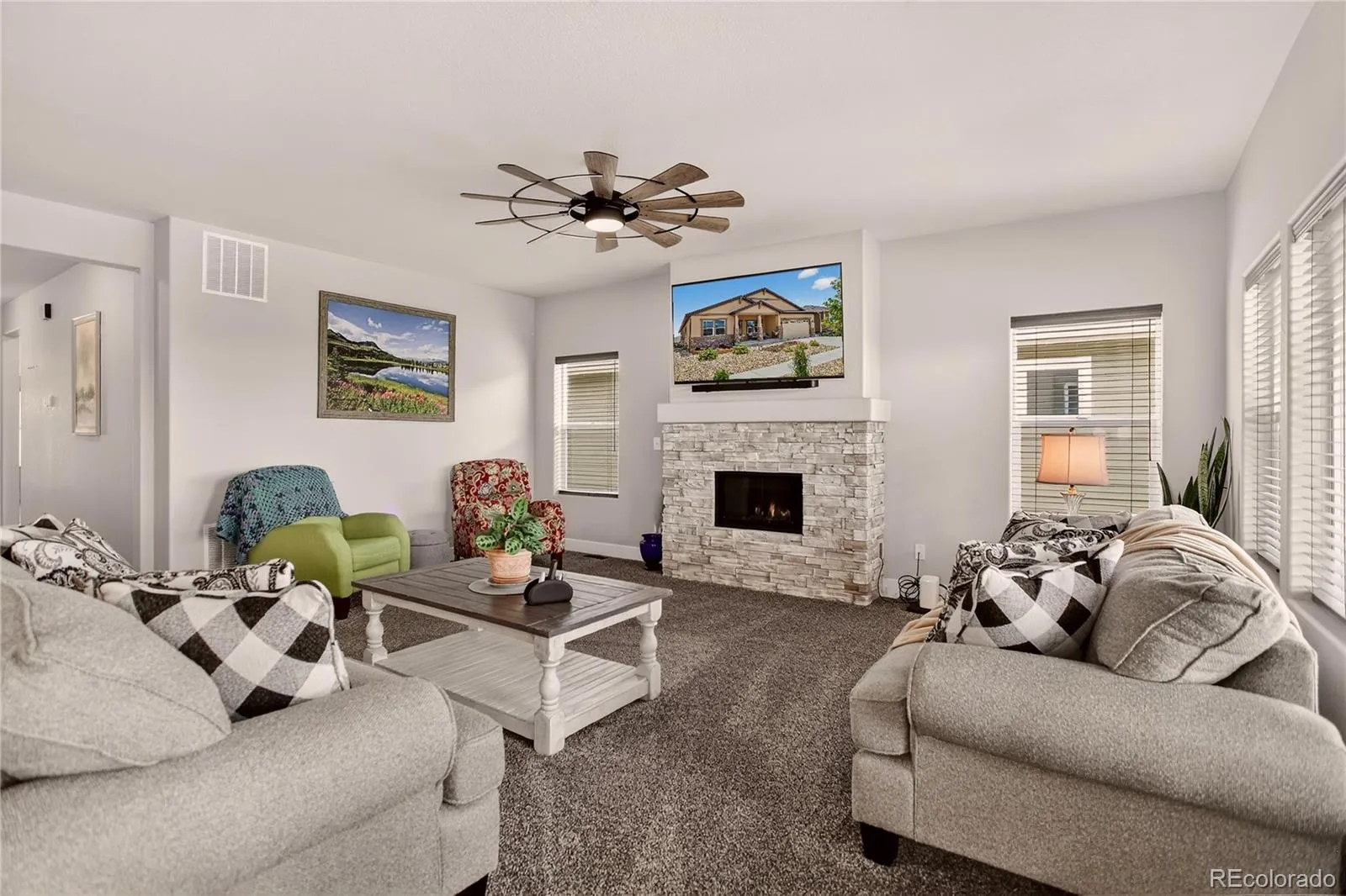 Like-new rancher in Wolf Ranch! This beautifully maintained Mont Blanc floor plan by Challenger Homes offers a bright, open layout enhanced by abundant natural light. A spacious living room is great for entertaining with a stacked-stone gas fireplace and large windows. This flows seamlessly into the kitchen which features a walk-in pantry, granite counters, an island with barstool seating, & stainless-steel appliances that include a double oven. The adjacent dining area walks out to a covered patio with pergola—perfect for relaxing evenings. Unwind in the main level primary bedroom with walk-in closet & private en-suite bath. A private office offers a quiet space for work or study and comes with a bookshelf. The finished basement provides expansive room for recreation & has been pre-plumbed for a wet bar. There is ample accommodation for family and friends with four additional bedrooms throughout this home. Outdoors, enjoy the low-maintenance xeriscaped front yard and a small lawn in the backyard. A finished 3-car tandem garage with built-in cabinetry ensures ample storage. Located in a vibrant community with convenient access to dining, shopping, and entertainment. Explore the community amenities including a recreation center, pool, splash area, dog park, trails, parks with picnic areas, and the local lake.