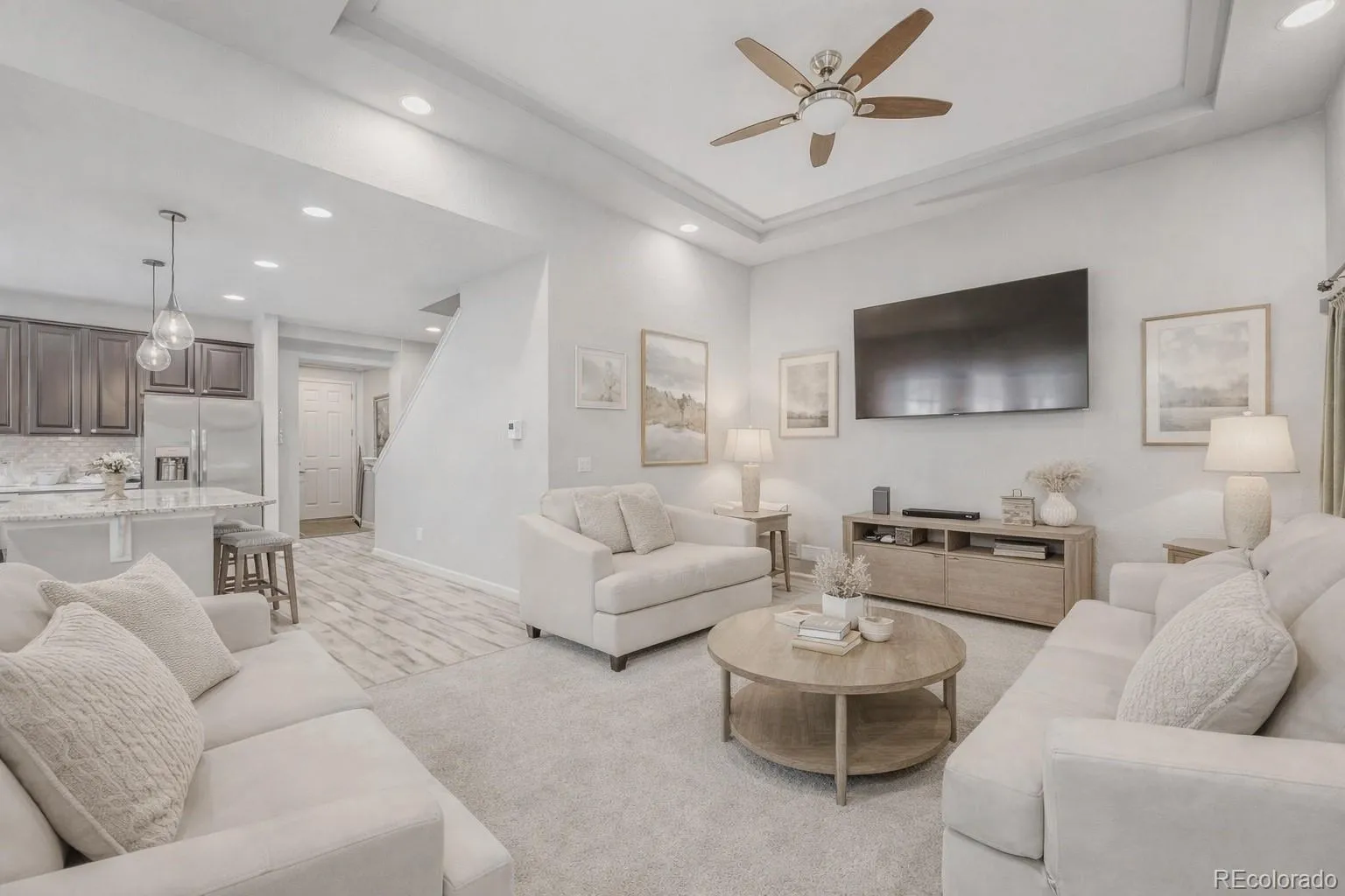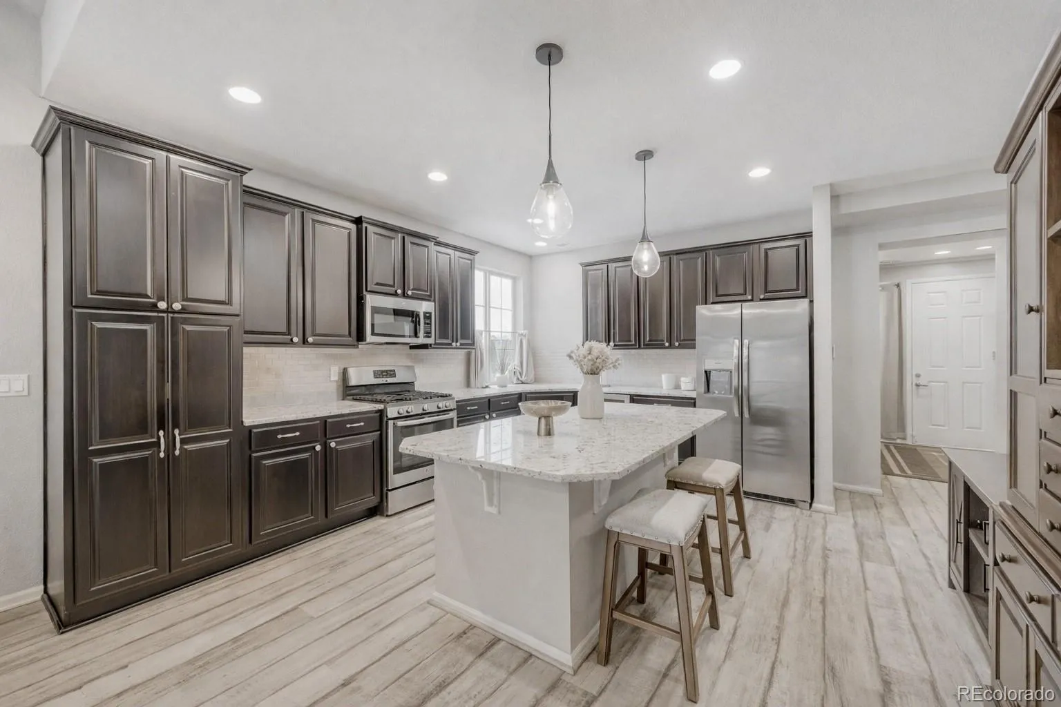 From the moment you arrive, this beautifully cared-for 3-bedroom, 3-bath home in the 55+ Fairway Villas at Green Valley Ranch just feels right. The landscaped yard, covered front porch, security door, and brand-new roof and siding (2025) set the tone for thoughtful updates inside and out. Natural light fills the open layout with durable vinyl flooring, tray ceilings, recessed lighting, and ceiling fans. The kitchen is the heart of the home with an oversized granite island, gas range, upgraded cabinetry, and a stylish backsplash—perfect for everyday living and entertaining. The main-level primary suite features a spa-style shower, dual sinks, and walk-in closet. Upstairs offers a second primary, spacious loft/rec room, and flexible space for guests or a home office. Separate thermostats on each level enhance comfort, and the home is pre-wired for central vacuum. Leased solar panels add energy efficiency and long-term savings. Step outside to your private backyard retreat with wrap-around patios, a gazebo, swing, decorative fountain, artificial turf, and low-maintenance landscaping with hose-operated drip irrigation. At night, the fountain lights up and changes color, and the gazebo’s cooling water spray is perfect for summer. This active adult community offers two clubhouses, fitness centers, indoor/outdoor pools with golf course views, plus pickleball, tennis, bocce, and miles of trails. An on-site Activities Director keeps the lifestyle social. Conveniently located near parks, shopping, dining, DIA, major highways, Green Valley Ranch Golf Club, and the Rocky Mountain Arsenal Wildlife Refuge. (Eligible buyers may qualify for a property tax rebate. This home also qualifies for a $5K grant for closing costs or rate buy-down—contact Doug Garvis at 303-389-5767 or [email protected]
